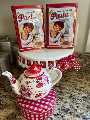 Fun Red And White Cake Stand, Red Hat Teapot And Fun Coordinating Tin Storage Cans - 5piece Lot - K18