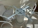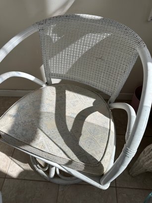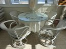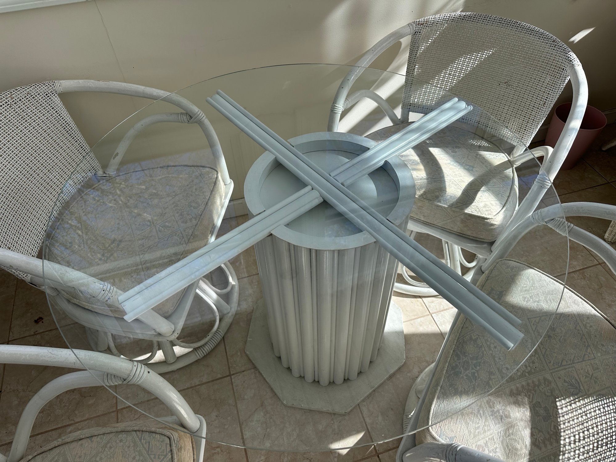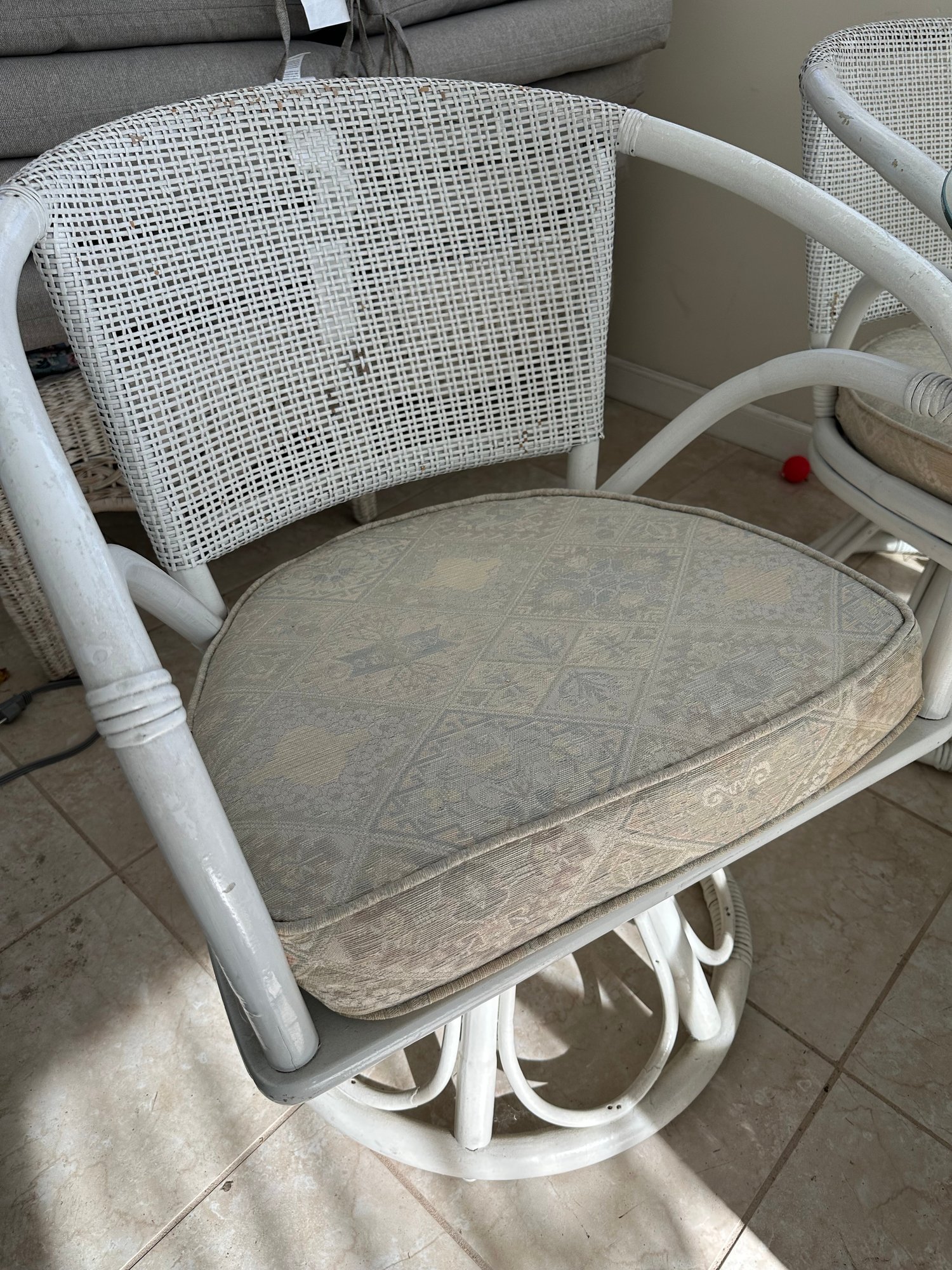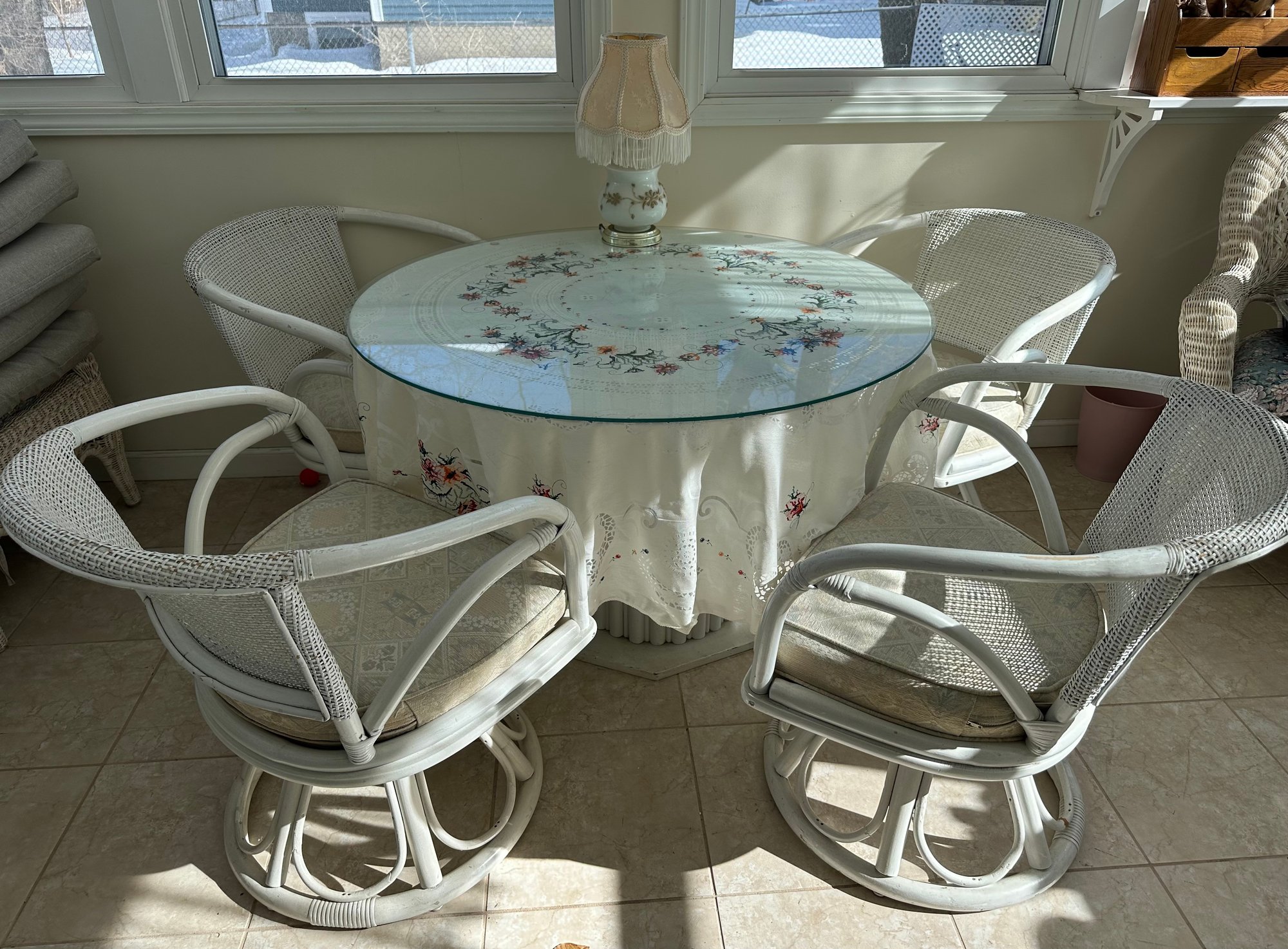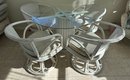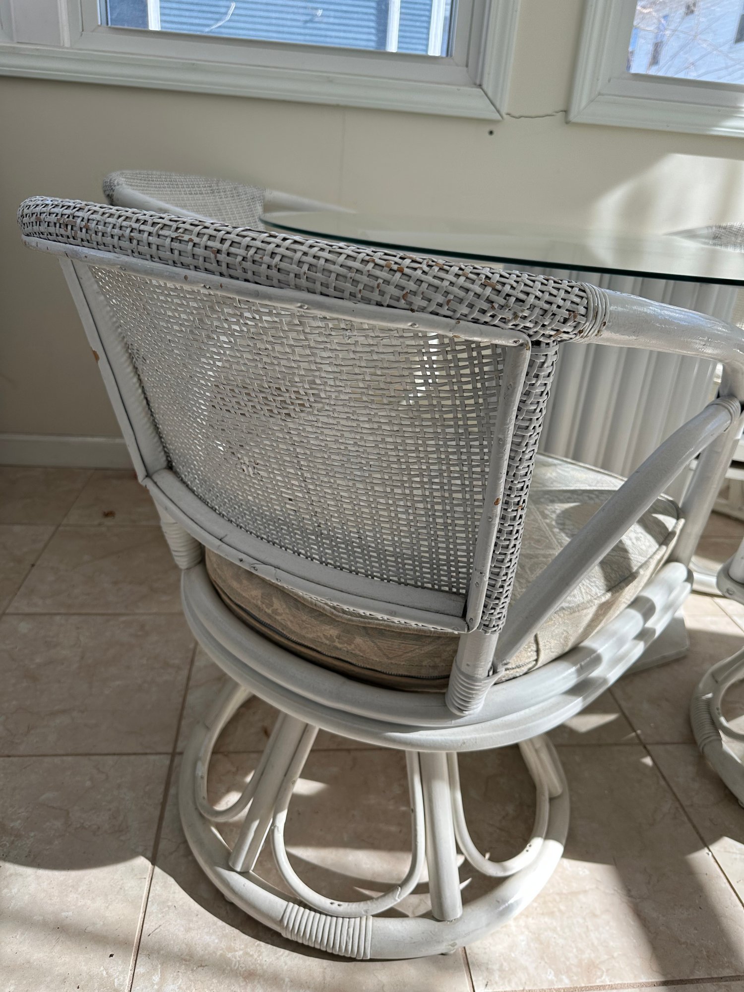This is a fabulous mid century set. Expect to see some missing paint and a few wicker issues. The glass is in great condition since it was covered with a tablecloth and layered with another piece of glass.