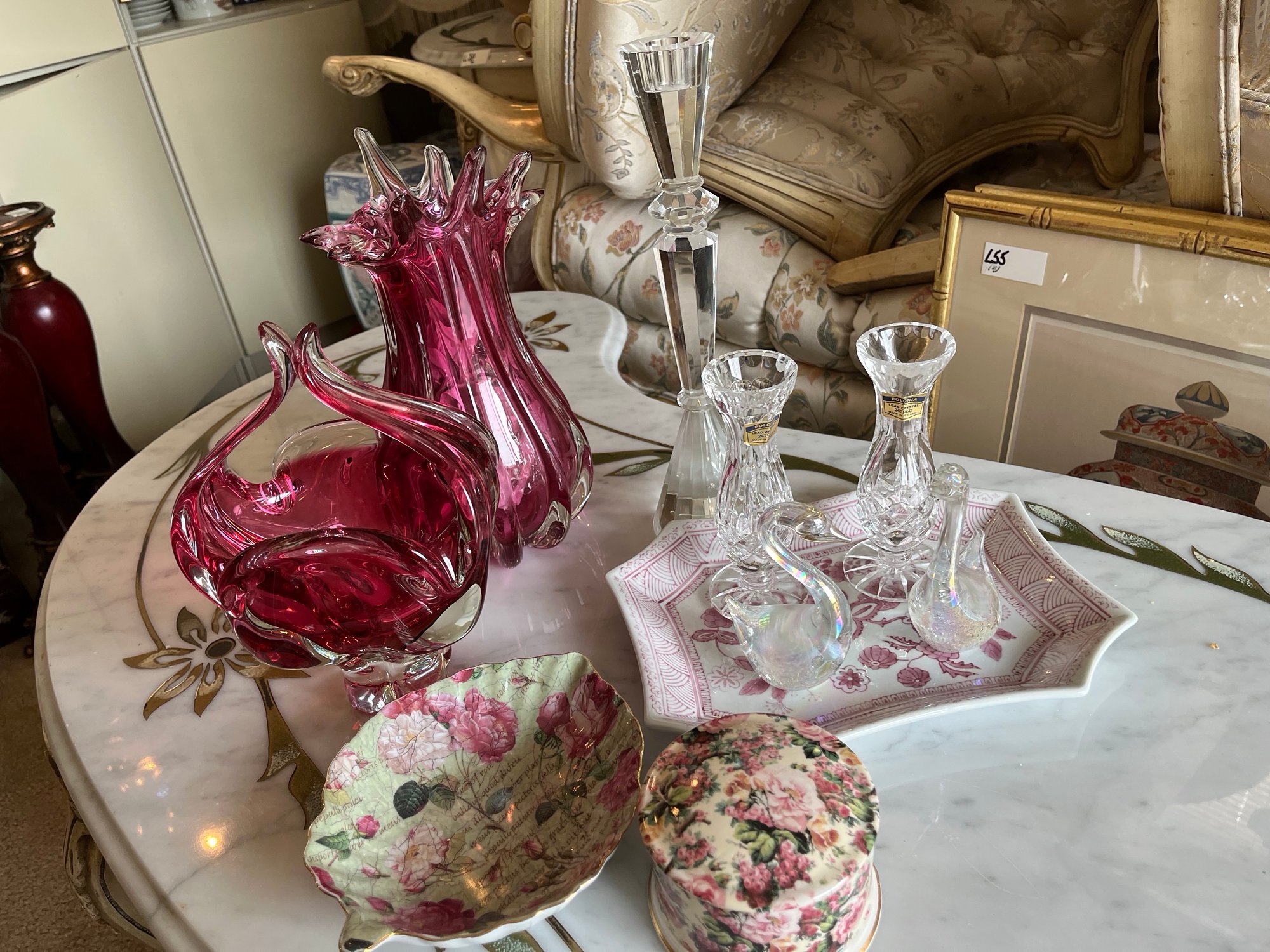 Mixed Lot - Includes 2 Fuchsia Pink Vases, 2 Glass Vases, 12 Inch Crystal Candlestick 2 Glass Swans - 2D13