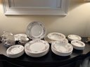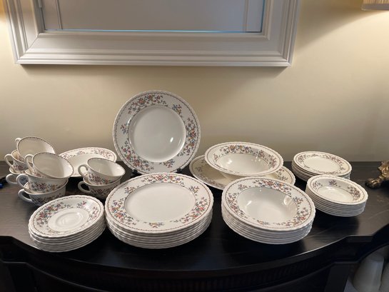 Very few chips - consistent with age and use. 9 dinner plate 9.75” , 8 bowls 8”; 9” serving bowl; 13” platter; 8 plates 6.5”; 8 small bowls 5.5”; 8 cups and 8 saucers.