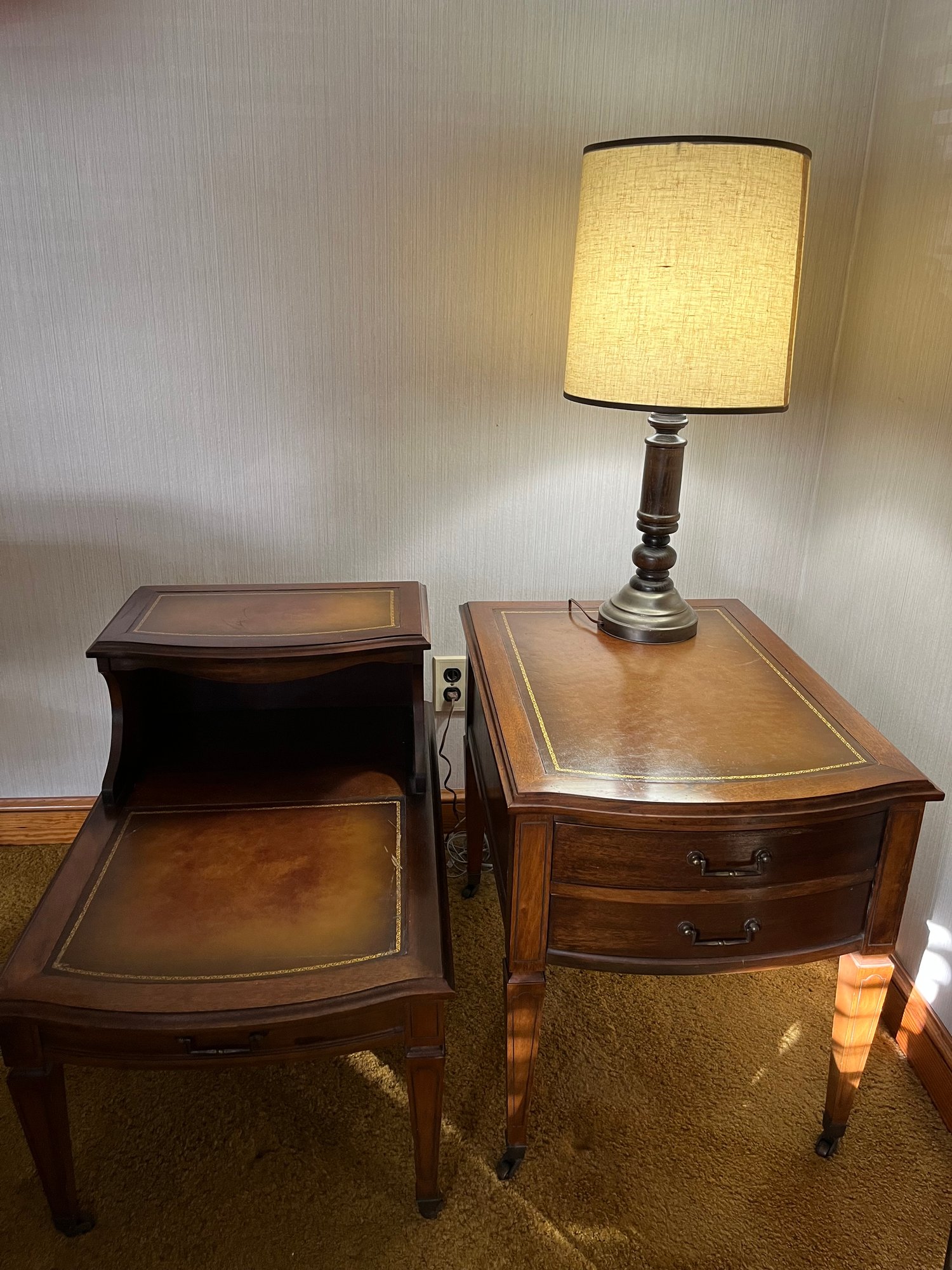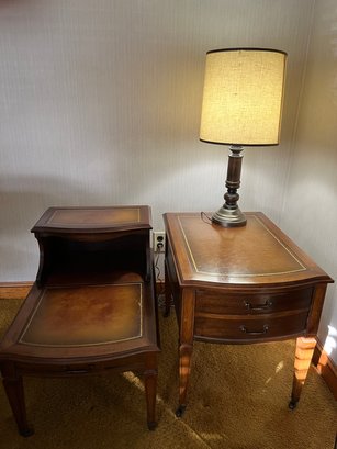 Two Leather Topped End Tables By Hammary On Casters And One Wooden Lamp - L167