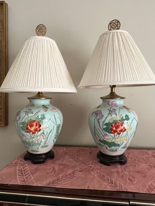 Two Matching Oriental Designed Ceramic ? 13 Inch Lamps - D1