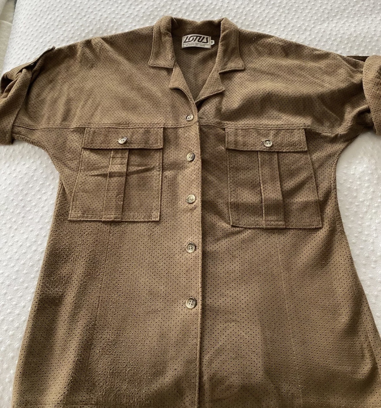 Vintage 80s LOTUS Brown Super Soft Suede Leather Shirt Top Women’s 10 EUC. This fabulous top was worn by my fashionable mon in the 80’s. I believe it was purchased at a Highend store in a casino. This size 10 fits more like a size 8. It’s meant to be worn on the loose side. Comes from a smoke-free home.