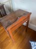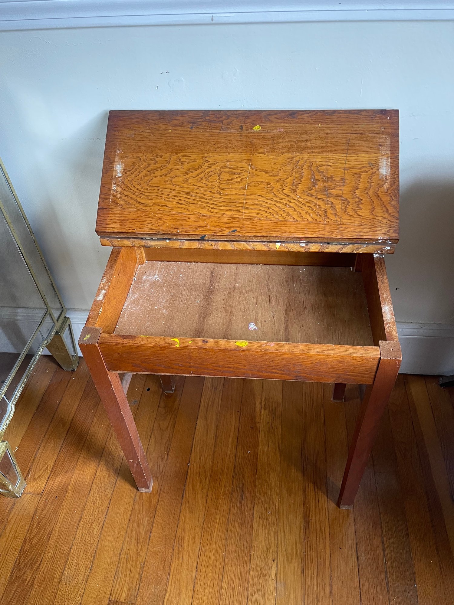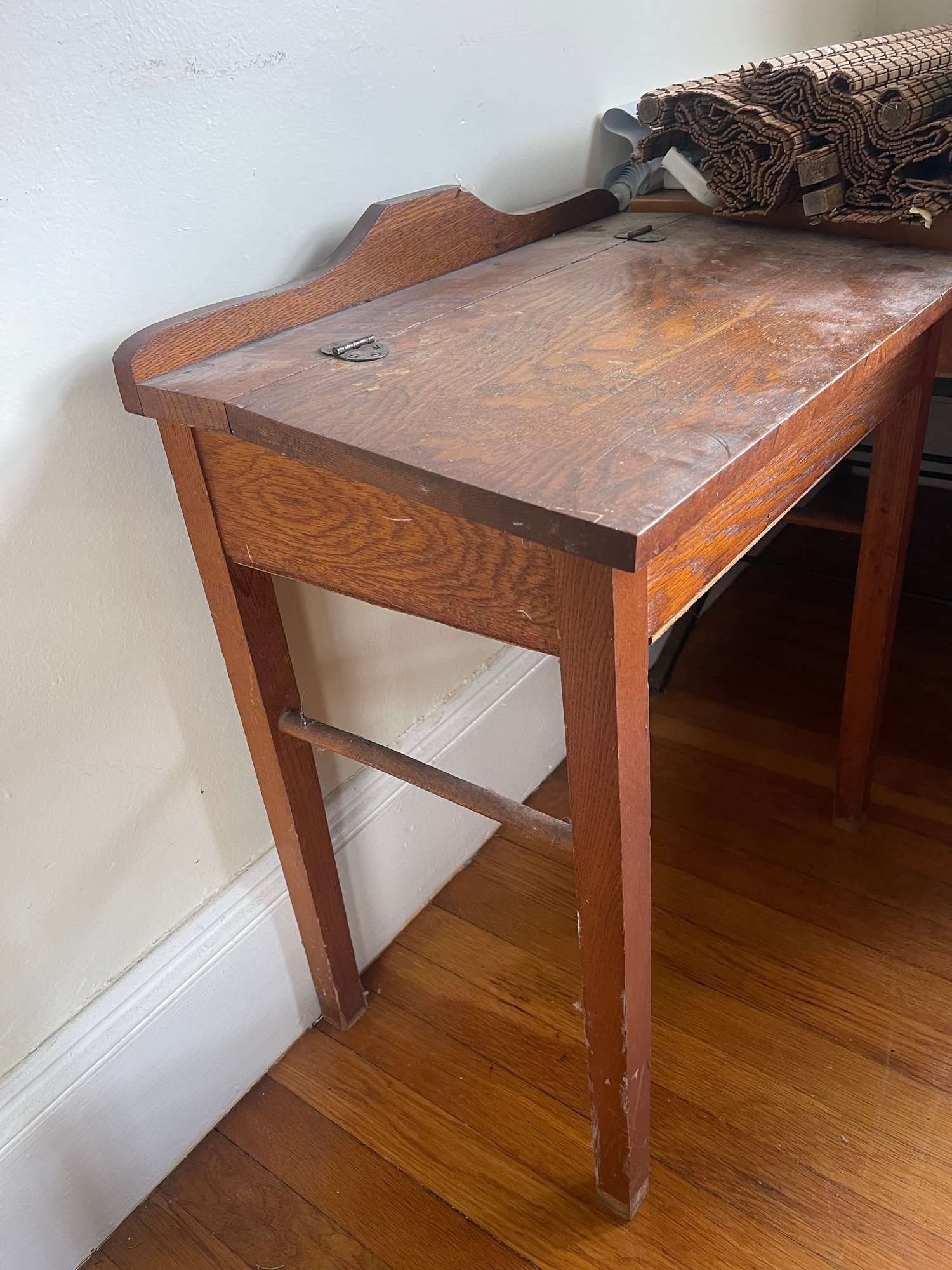 This is an antique or vintage solid oak child's slant-top school writing desk.