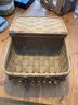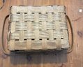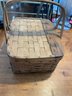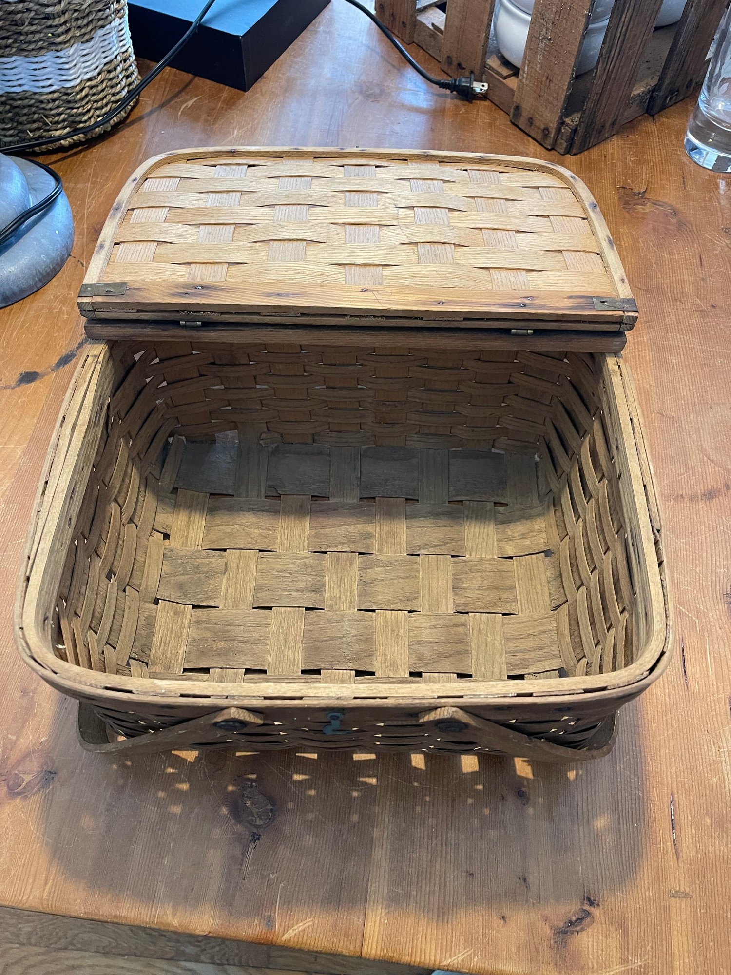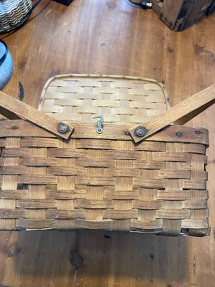 Vintage woven wooden splint picnic basket with a hinged lid and double handles. It