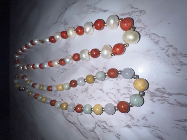 2 Multi Stone Necklaces , One 14K Clasp With Coral? And Pearl, Other Multi Semi Precious And Pearl