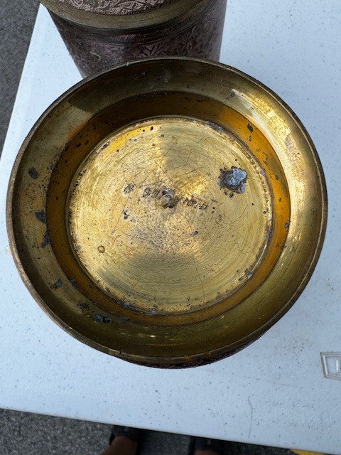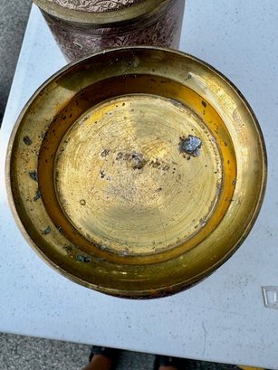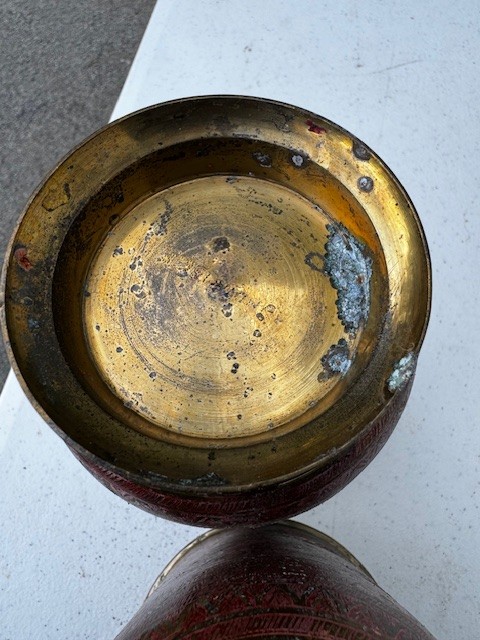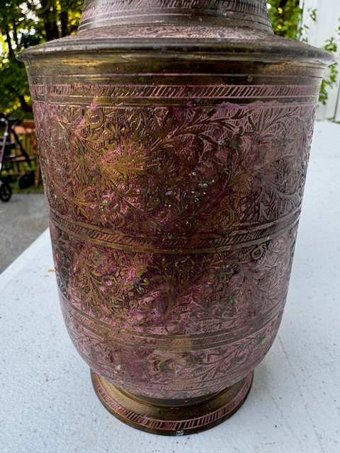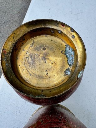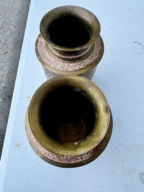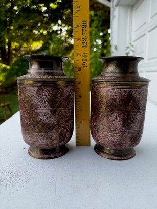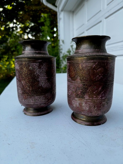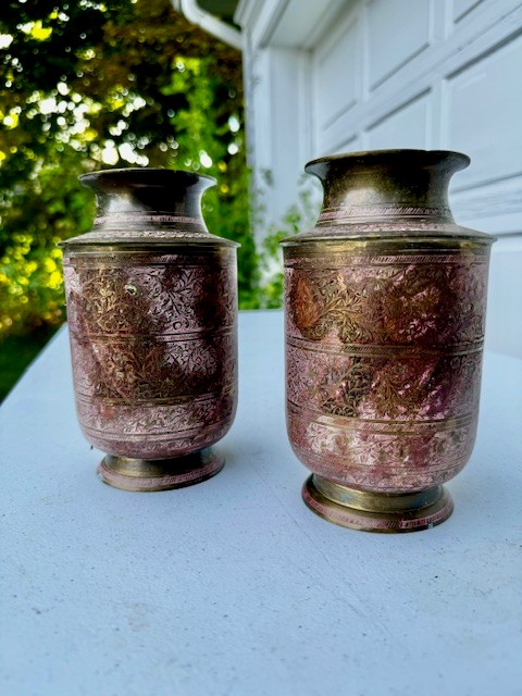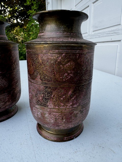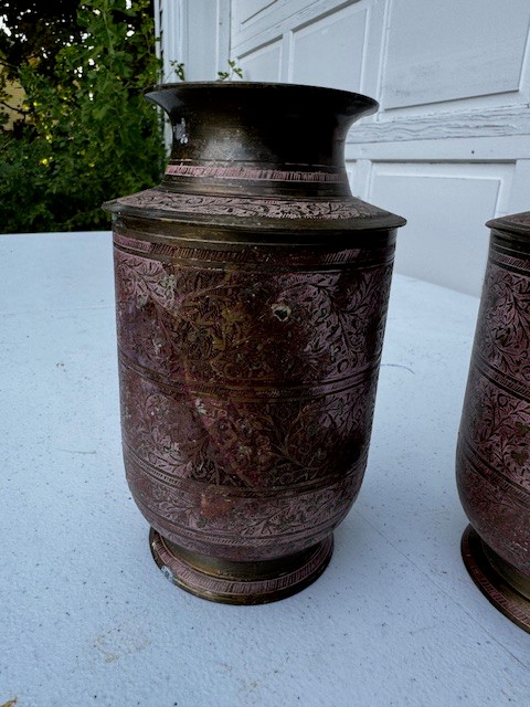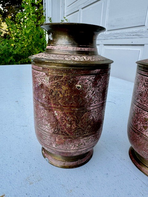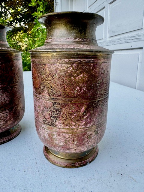A Pair Of Vintage Exquisite Etched Brass Vases 1940's Made In India