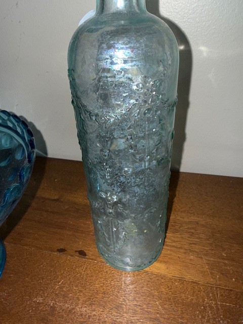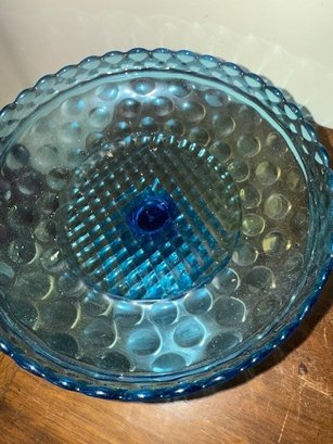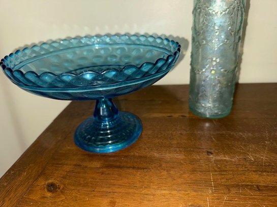 Blue Central Glass Company Footed Cake Plate And 19th Cent Embossed Antique Bottle