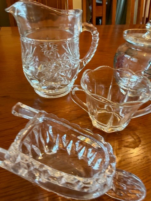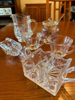 Collection Of Glass, Crystal Creamer/sugar Bowl, Jam Jar, Pitcher And Sugar Holders