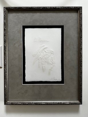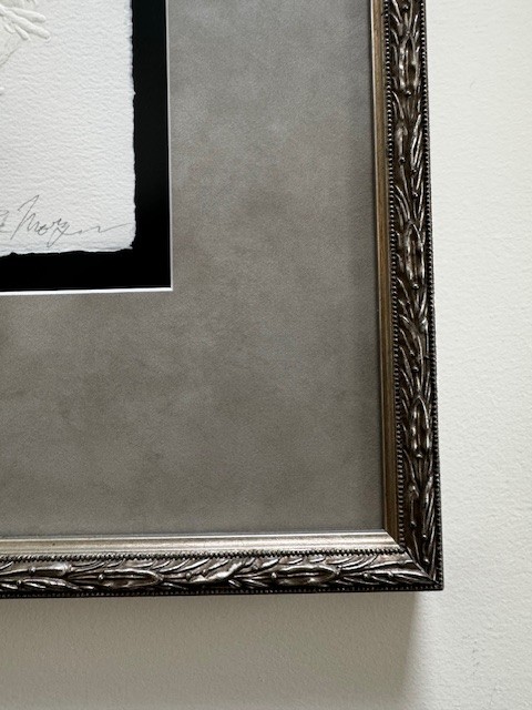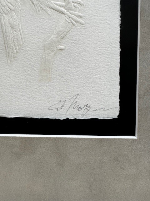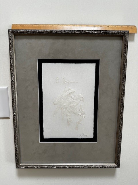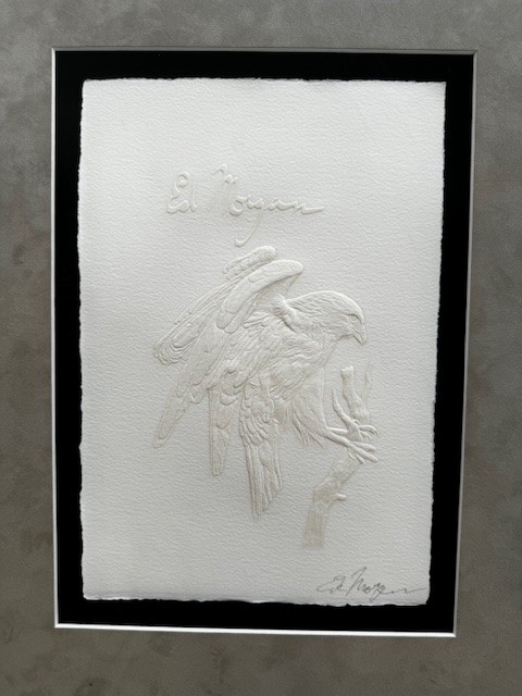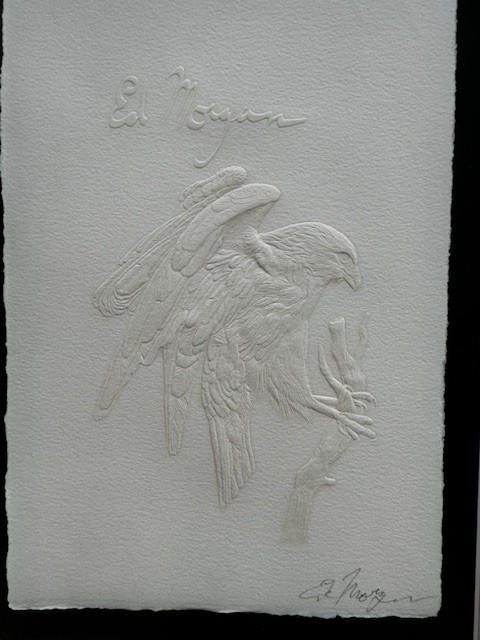 Ed Morgan became a master engraver depicting a variety of subjects including Native Americans, animals, birds and flowers.He grew up in Kansas City, Missouri, with a father who made all of his toys by hand, many of them with Southwest motifs. After his father's death, he lived with grandparents on a farm in northeast Missouri, and he had to travel 30 miles to school. In grade school, he began winning art competitions.He moved to Kansas City, became a professional musician, and enrolled at the Kansas City Art Institute where he got a reputation for his execution of fine detail. He then worked for nearly twelve years as an illustrator- engraver for Hallmark Cards and later with American Greeting Cards.A trip to Taos, New Mexico to pick up frozen buffalo hides changed his life, and he subsequently moved there and to engraving added jewelry making. In this regard, he describes himself as a sculptor who carves in metal and then embellishes his work with silk, which he fuses onto the paper.