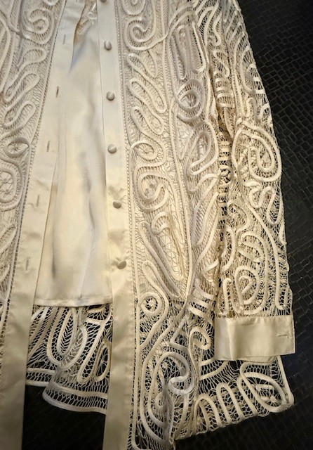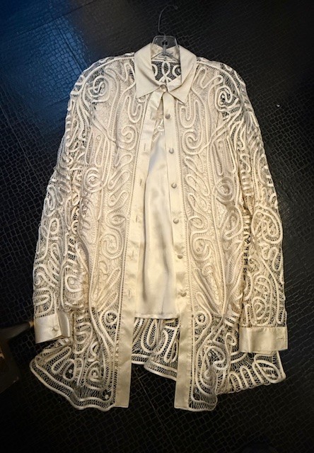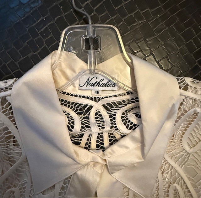 Exquisite Nathalies Intricate Lace Scrollwork Cream Silk, Satin Blouse Set Size 46