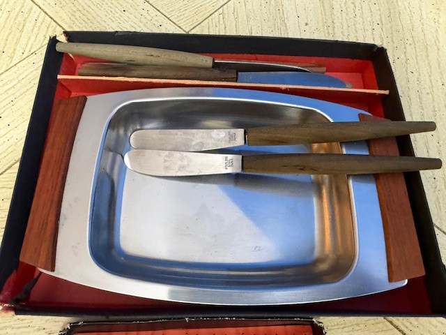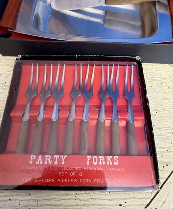 Mid Century Appetizer Set, Wood And Stainless Party Forks, Tray, Spreaders