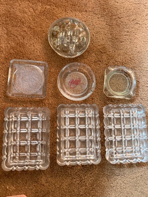 Group Of Ashtrays, A Flower Frog, And Crystal Trays