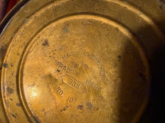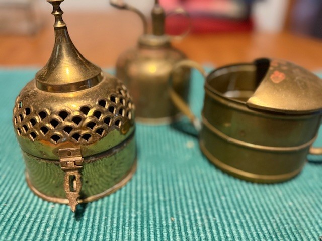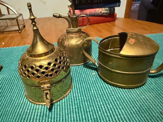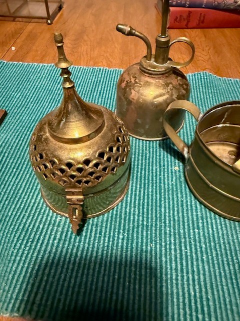 Group Of Three Brass Containers, Watering Can, Incense Burner, Made In Hong Kong