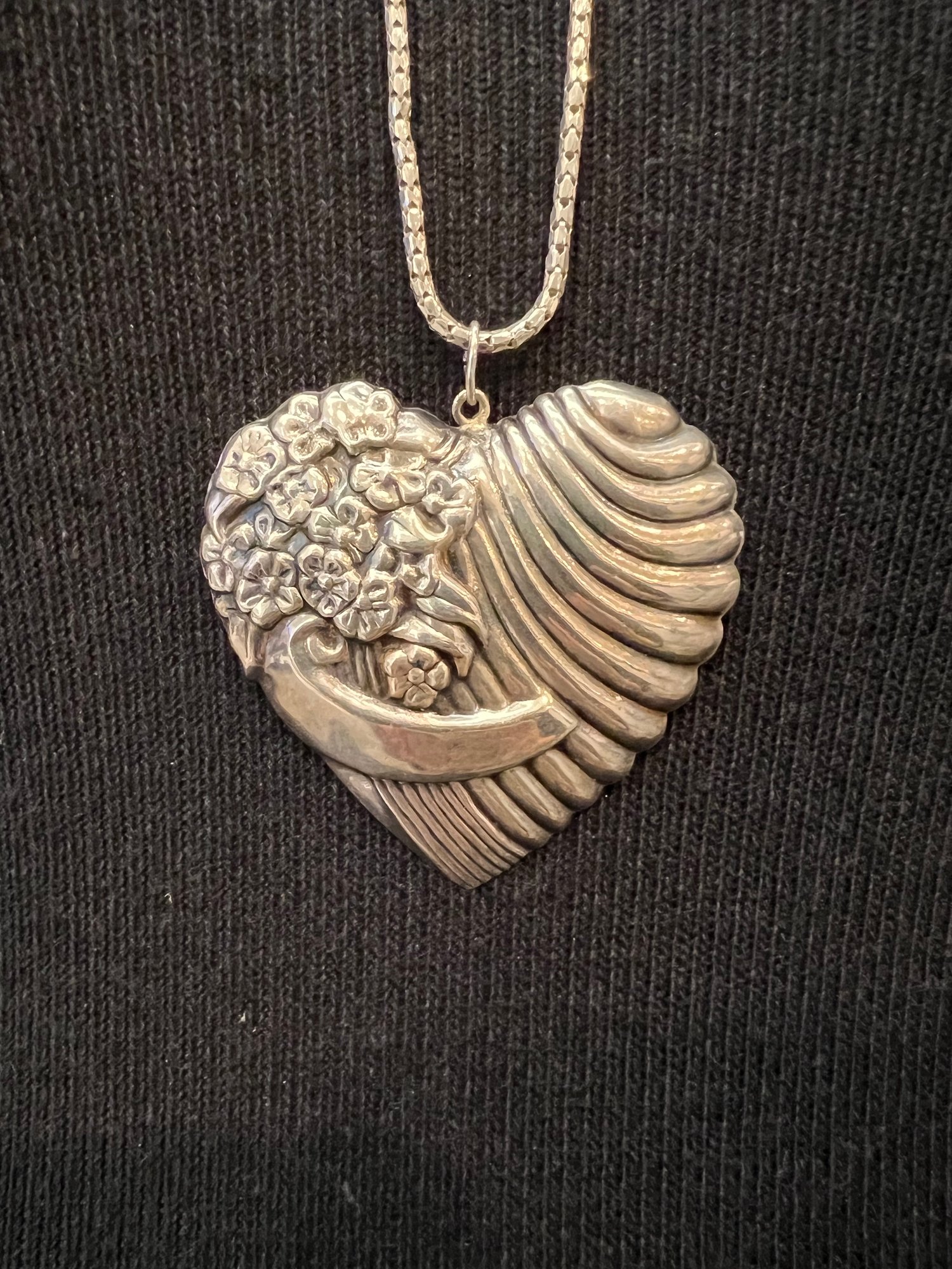 Silver 925 Embossed Heart Necklace On Long Chain 925