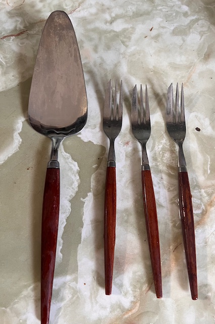 Teak Wood Handled Pie Server And 3 Forks Holland Stainless
