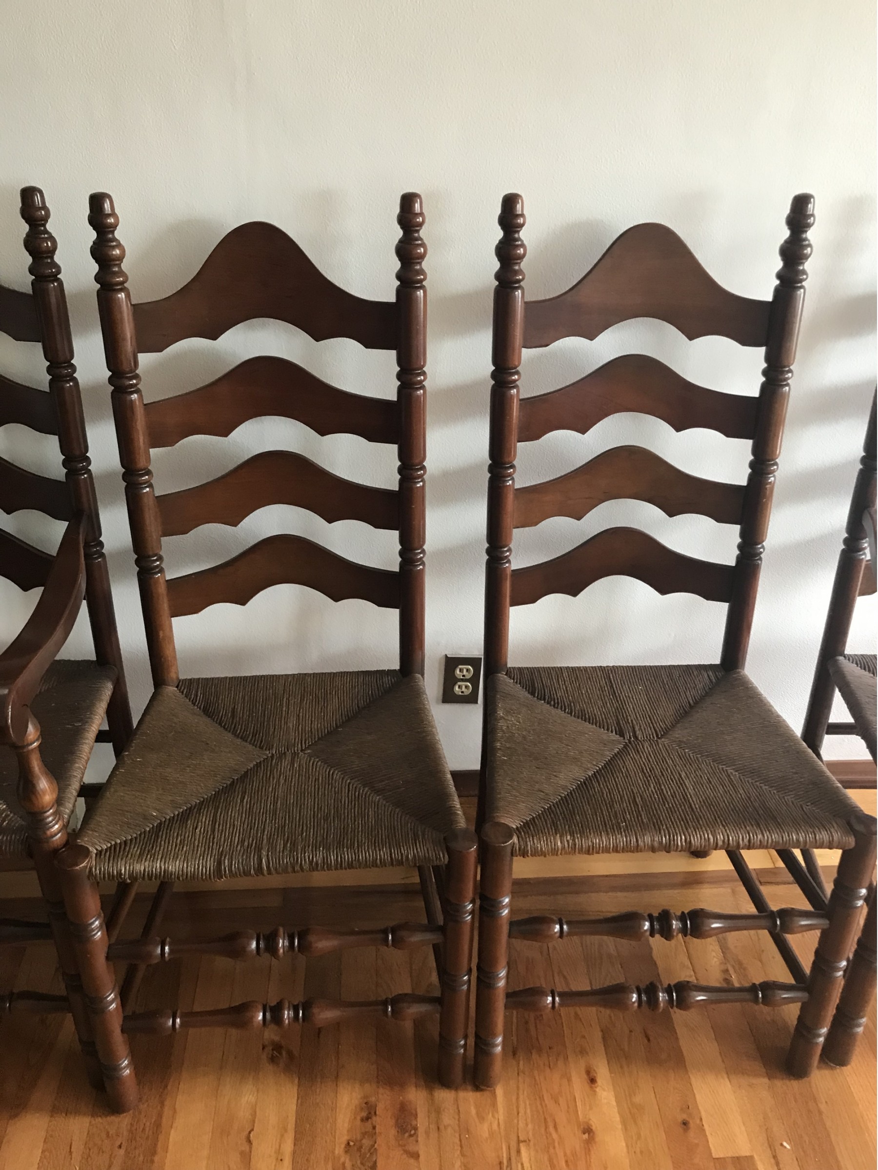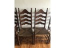 4pc included pair armchairs and pair chairs, dark color wood with rush seats.