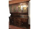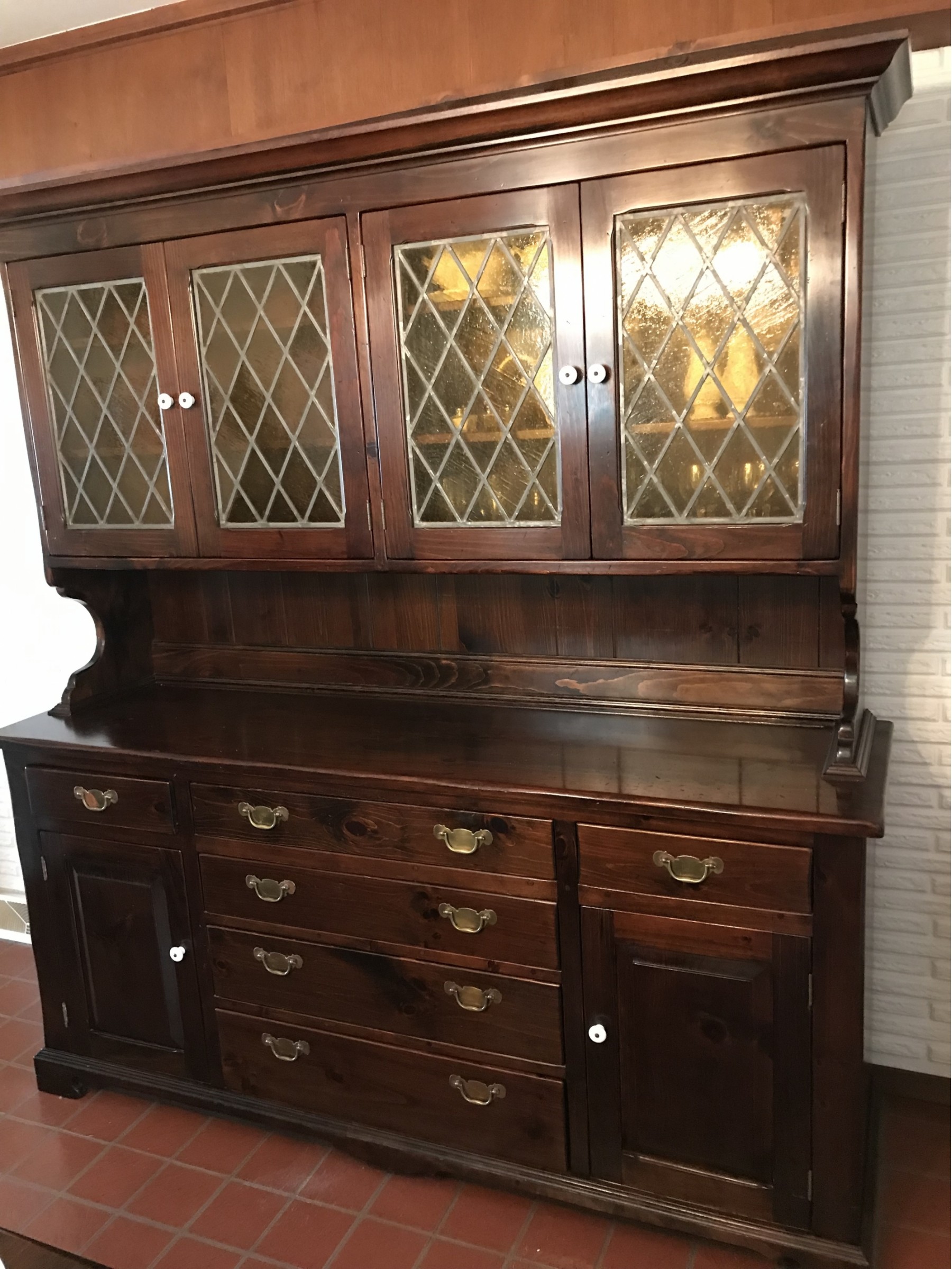 Colonial style antique or vintage display China cabinet, made of pine wood in dark color with stained glass windows