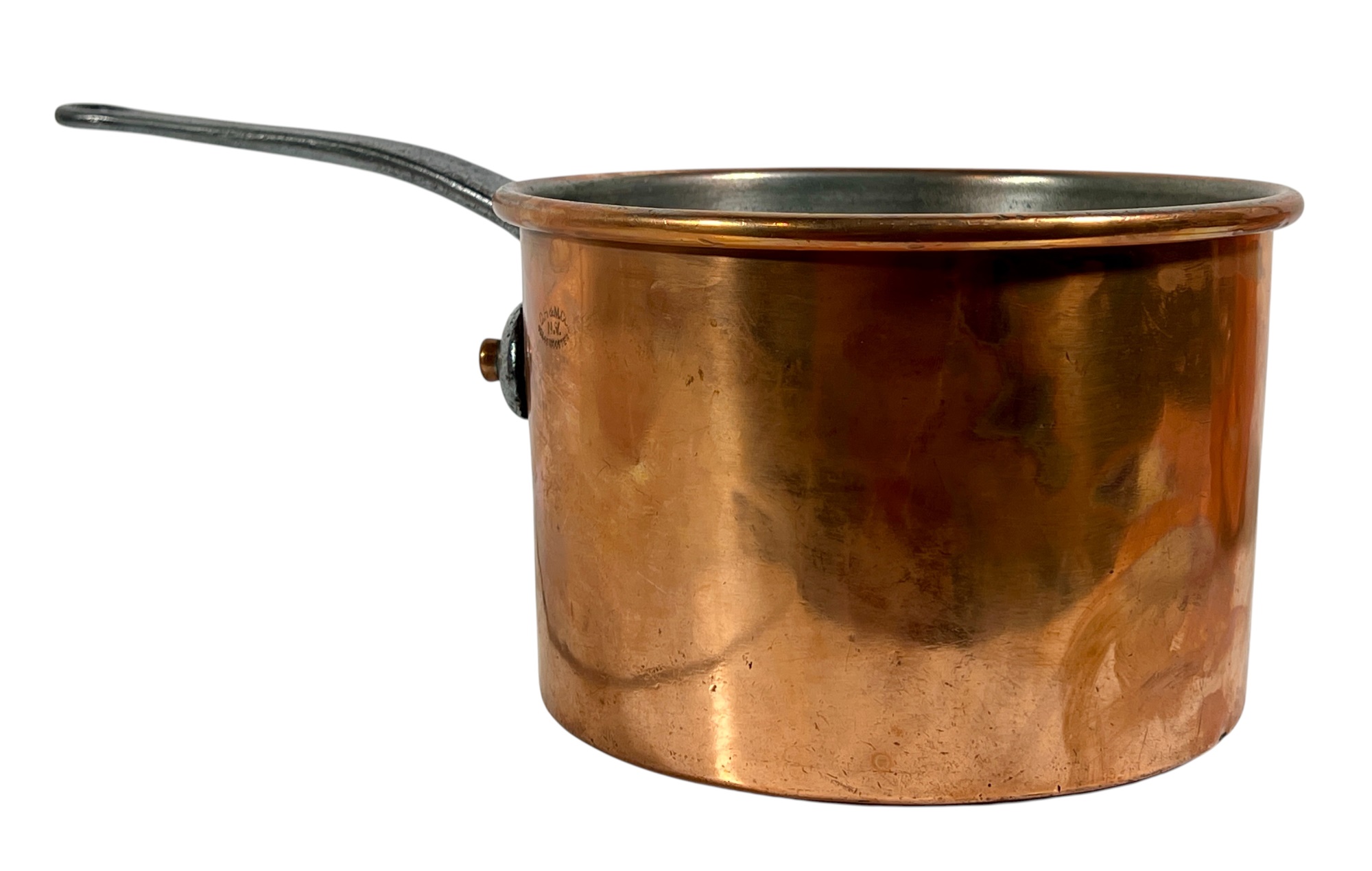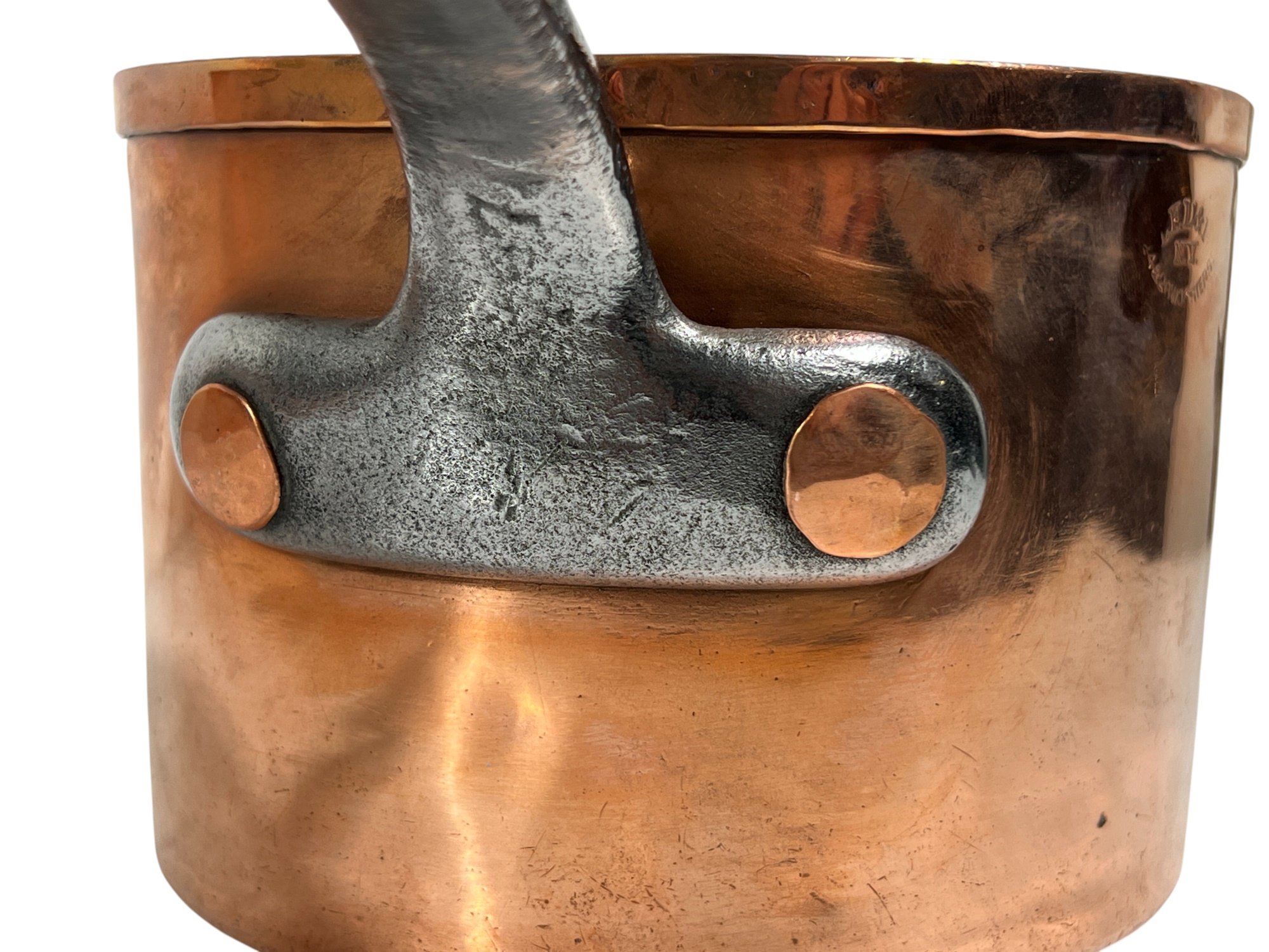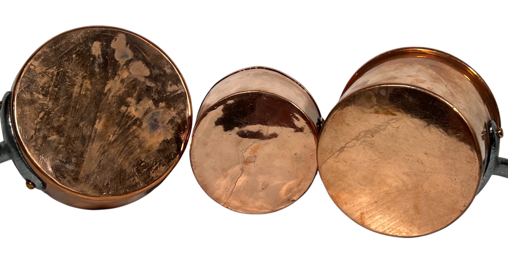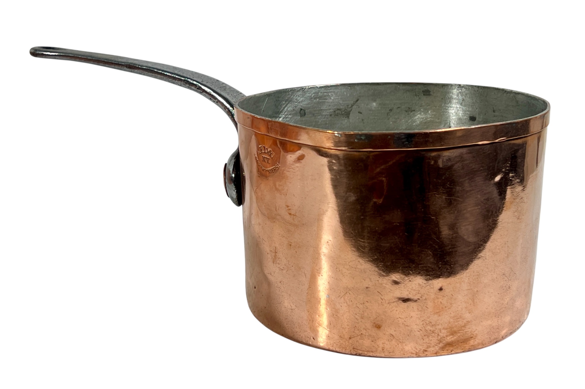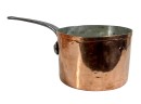 LFD & H copper sauce pan and (2) DH & M copper pots. (19th/20th c). 5 x 7 3/4 x 15 inches. Condition: Good. Temp No 8602