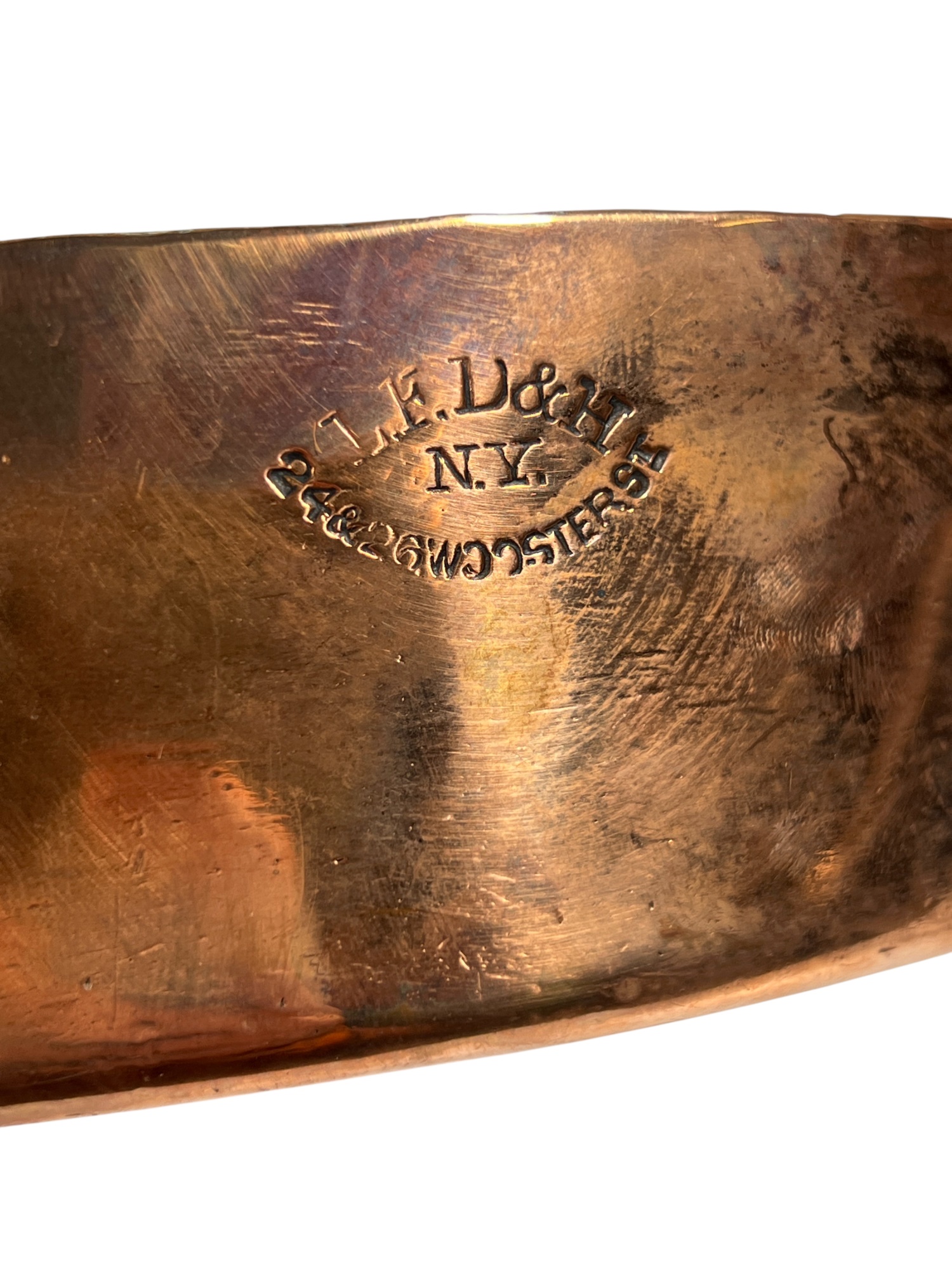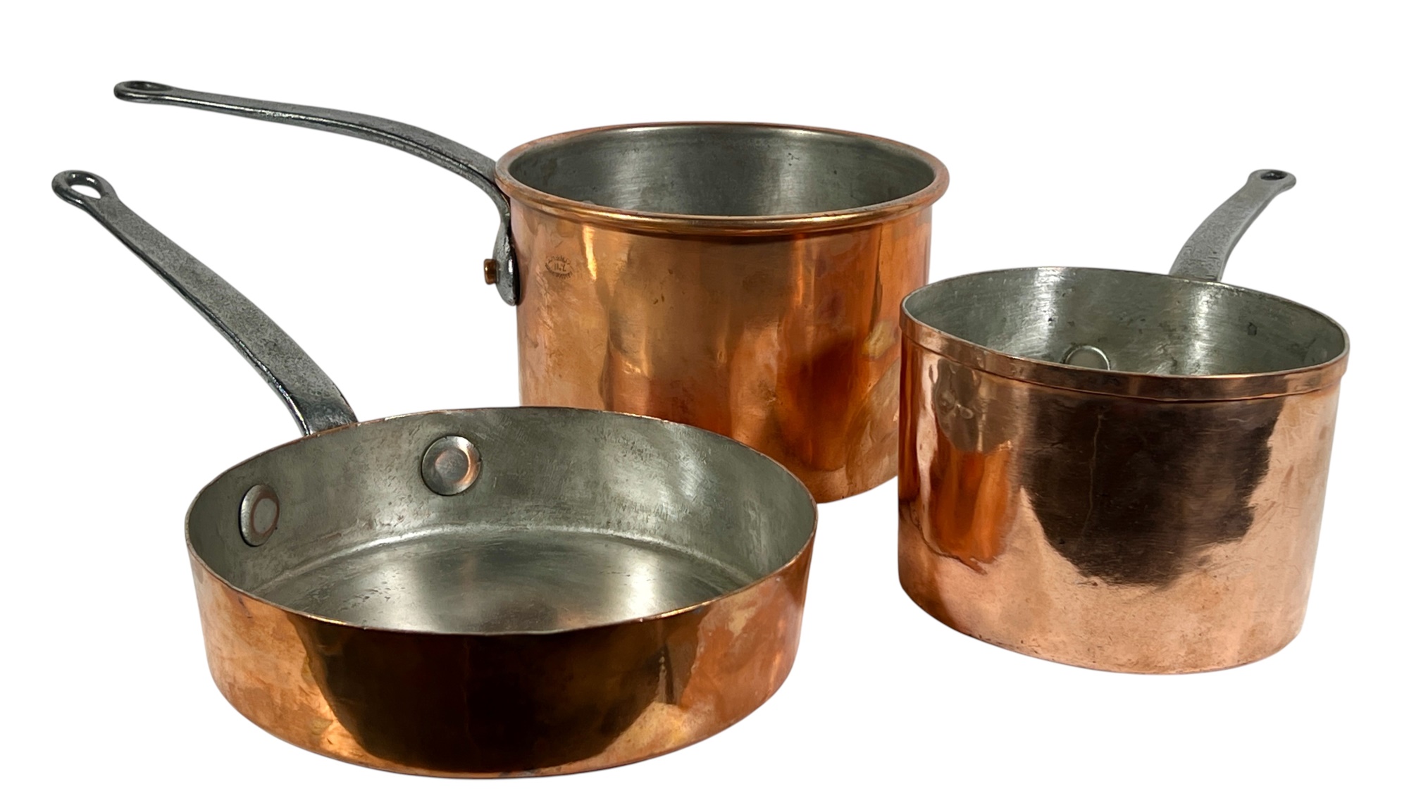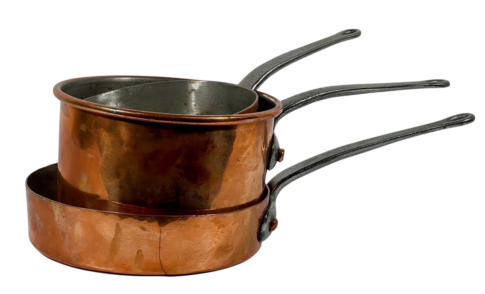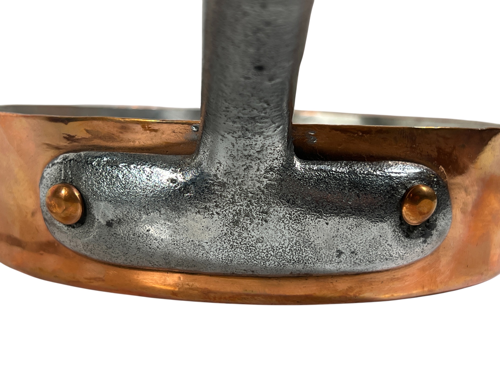 LFD & H copper sauce pan and (2) DH & M copper pots. (19th/20th c). 5 x 7 3/4 x 15 inches. Condition: Good. Temp No 8602