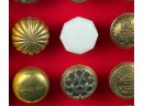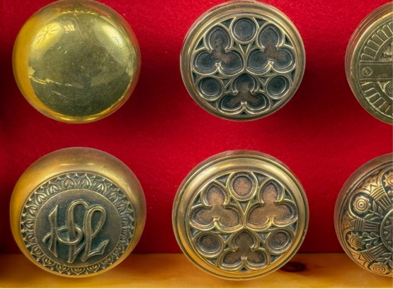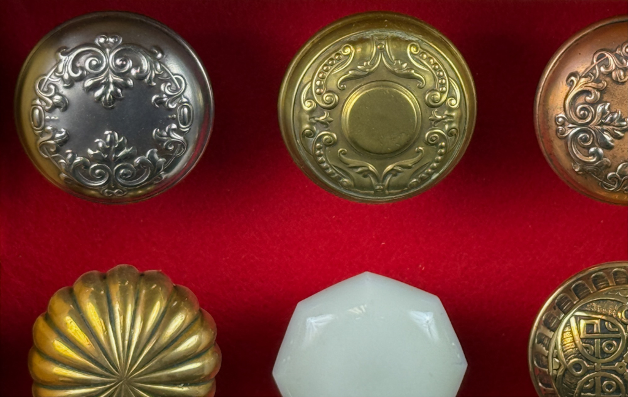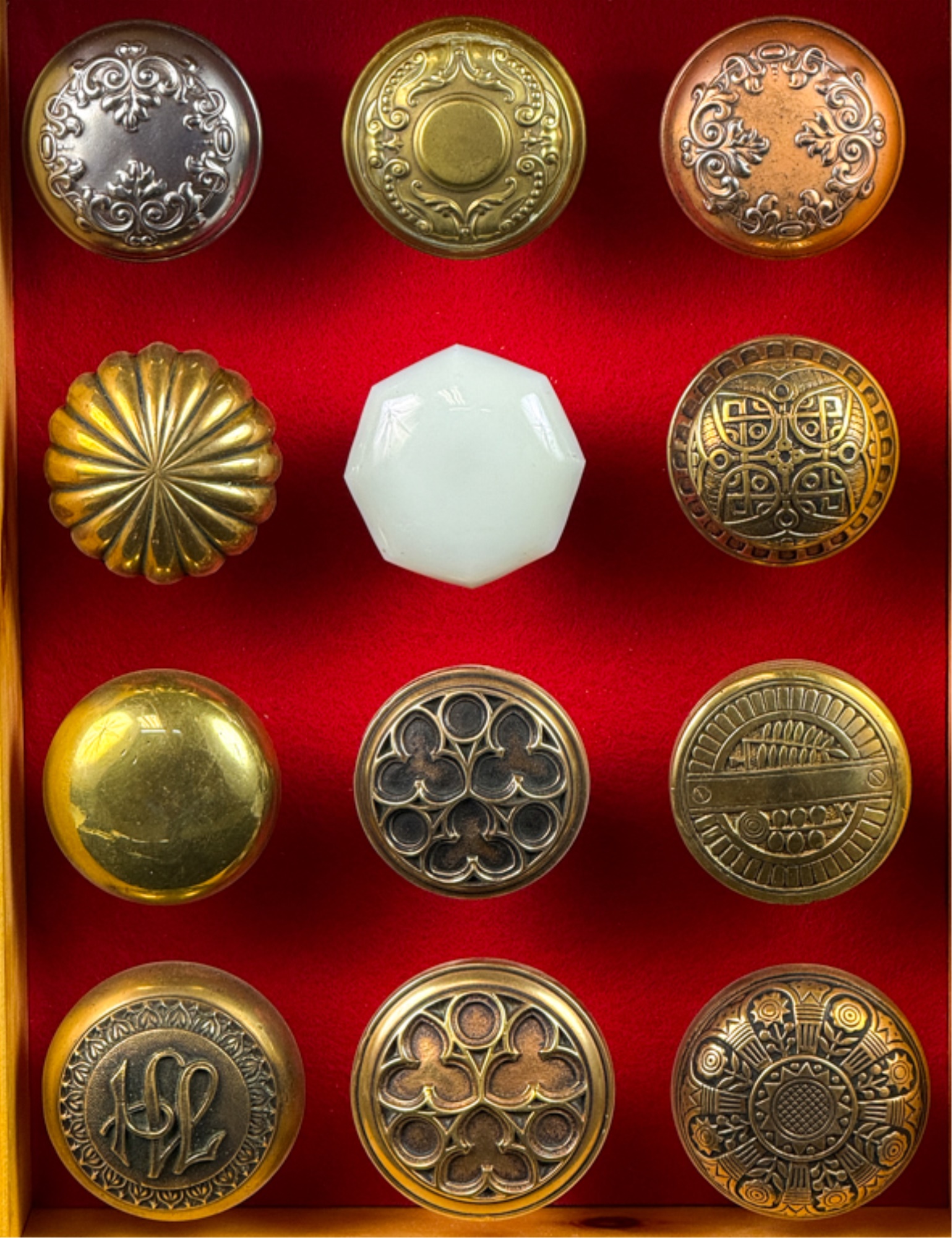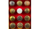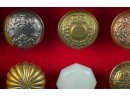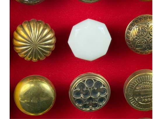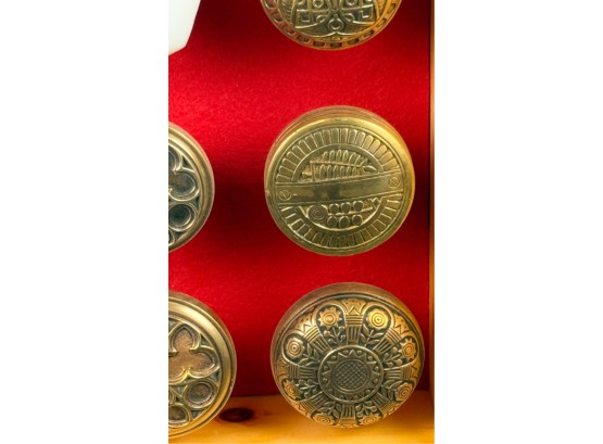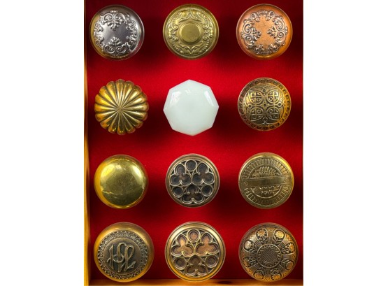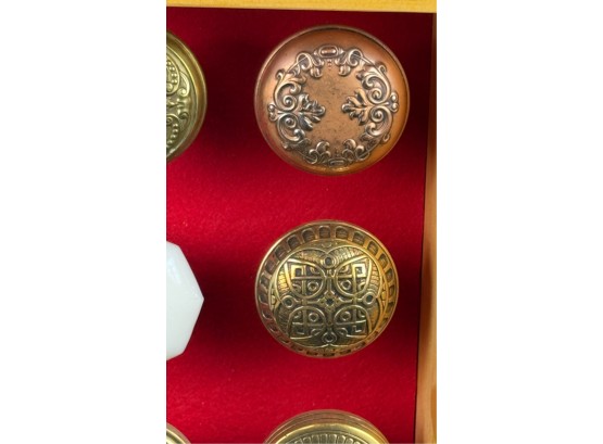 Milk glass, copper, brass, bronze, etc. Mounted in shadow box measuring 13 1/4 x 10 1/2 x 3 1/2 inches. Condition: Good. Temp No 51a