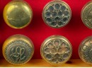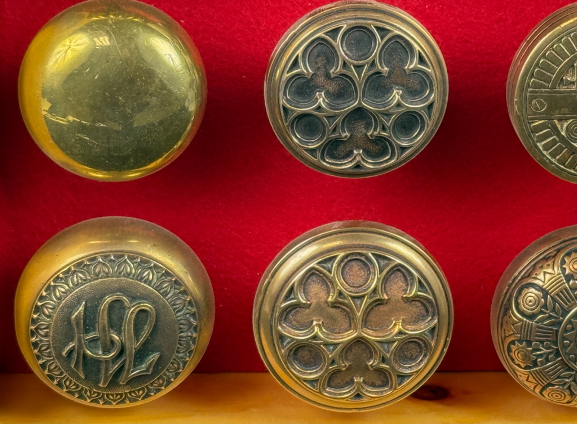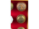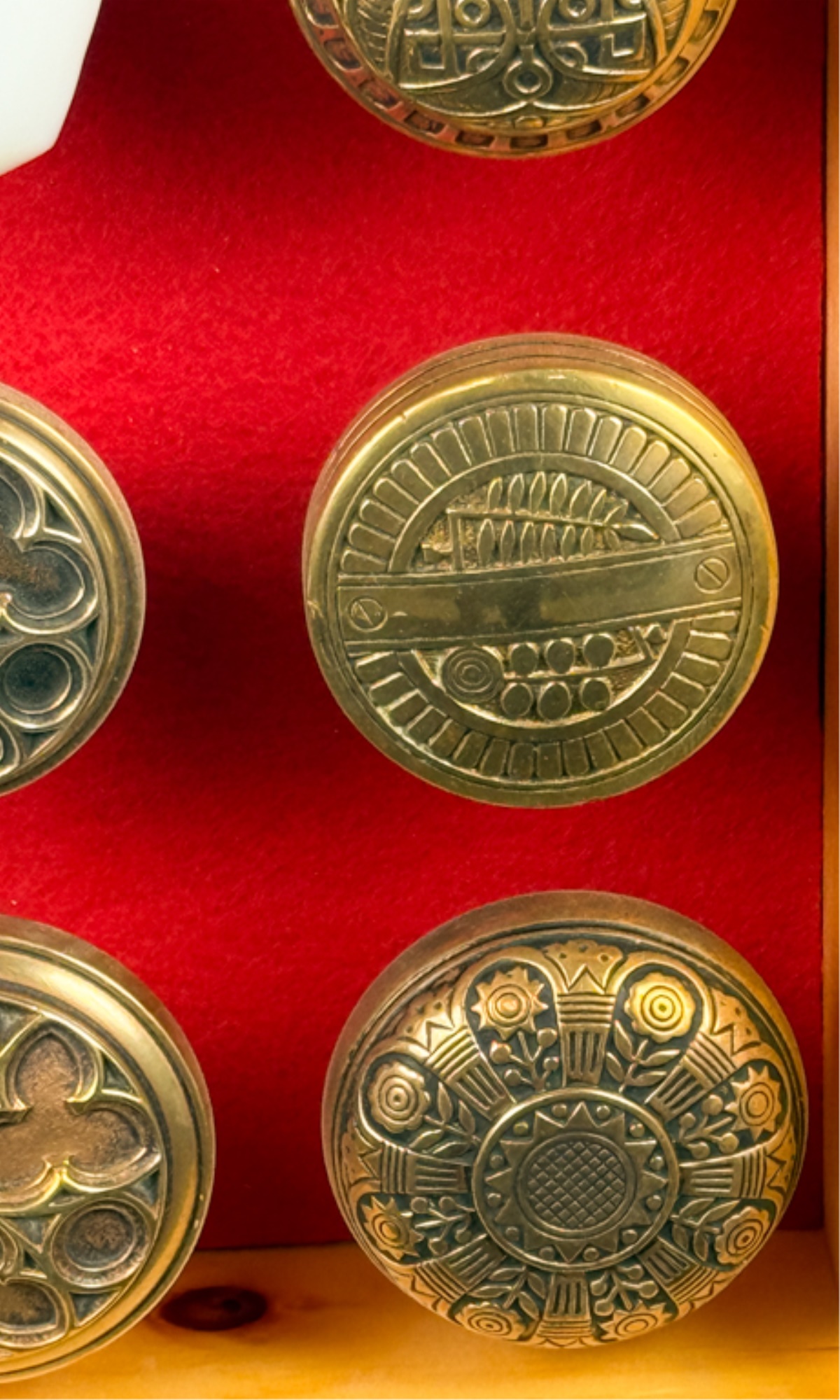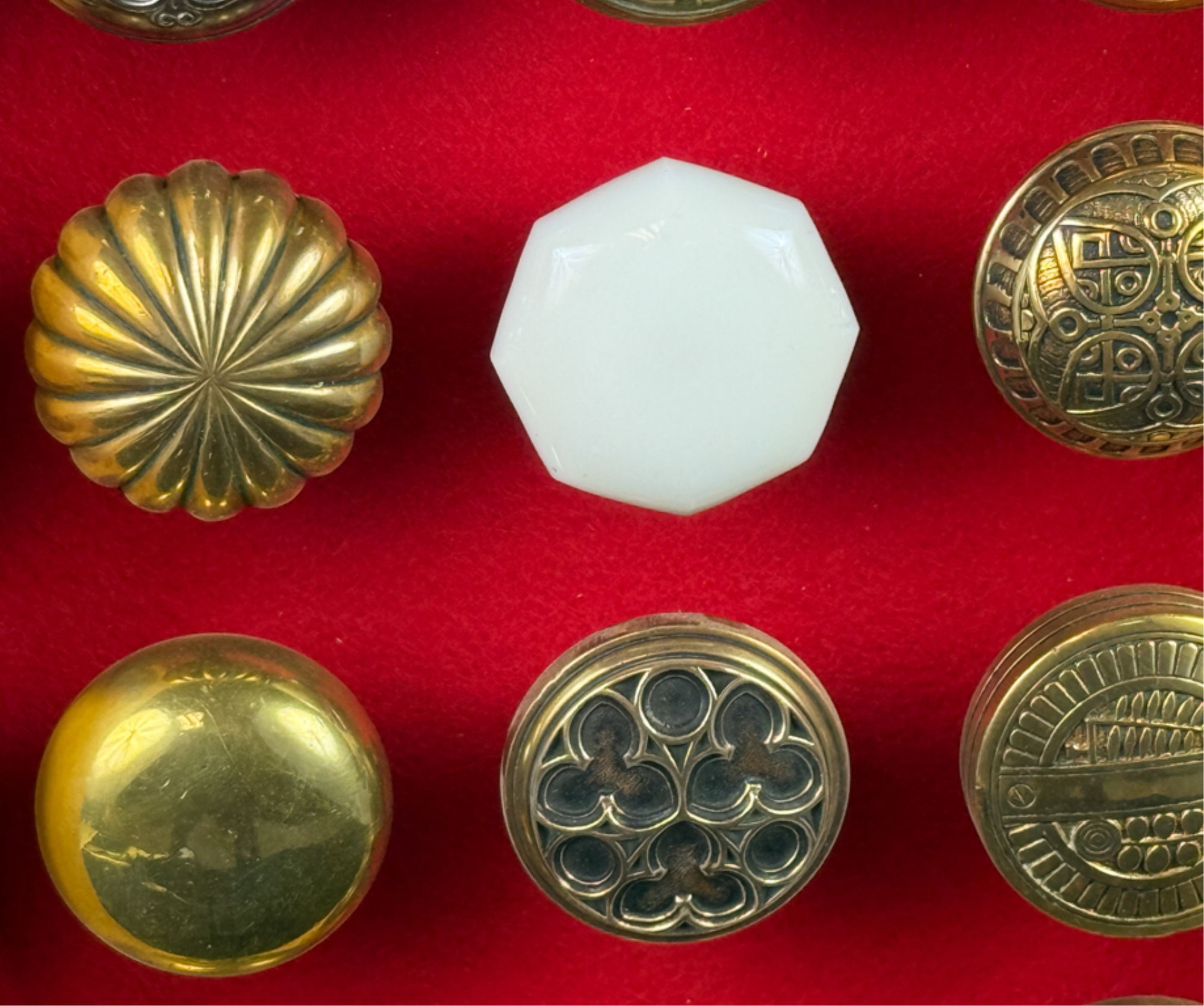 Milk glass, copper, brass, bronze, etc. Mounted in shadow box measuring 13 1/4 x 10 1/2 x 3 1/2 inches. Condition: Good. Temp No 51a