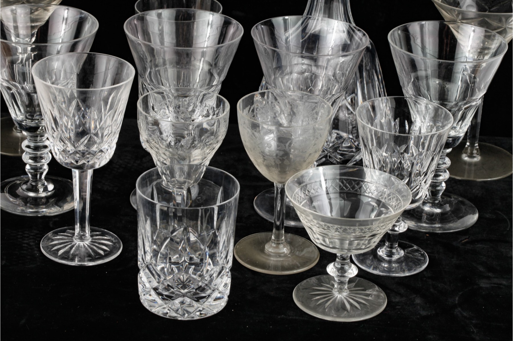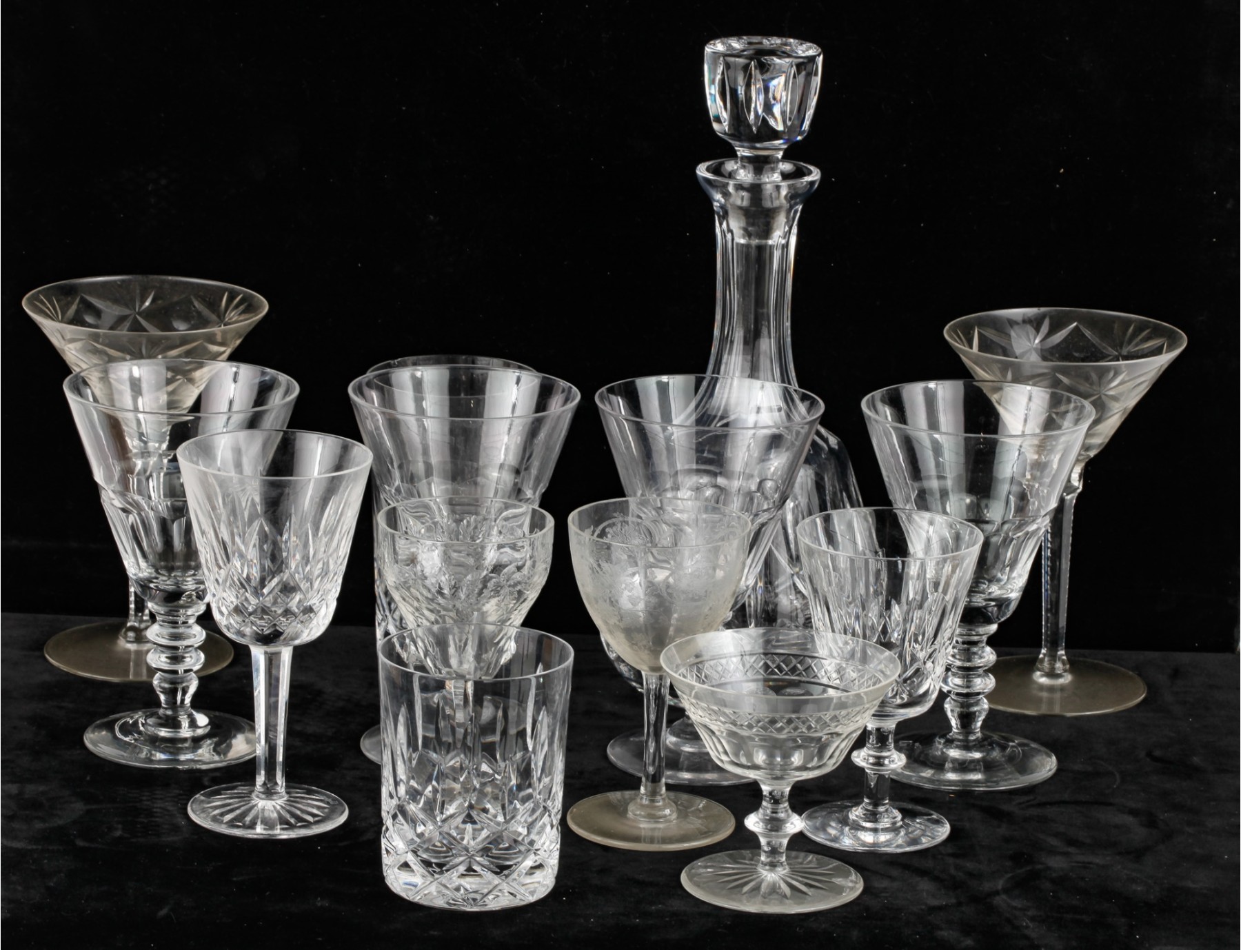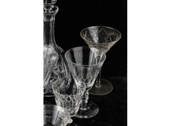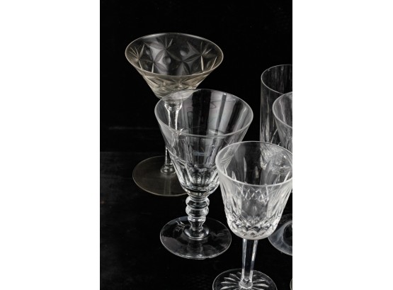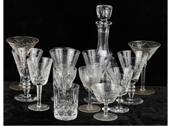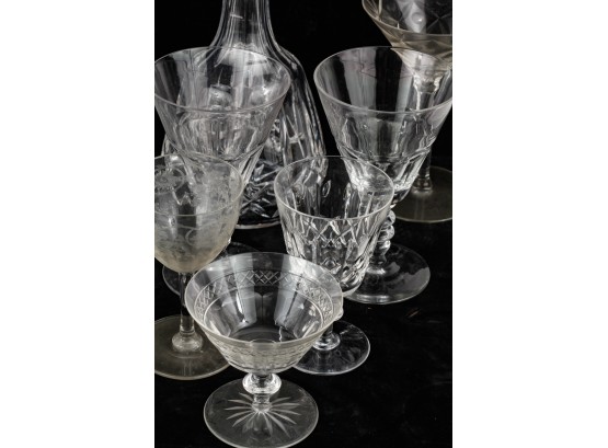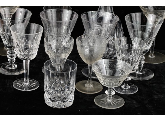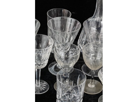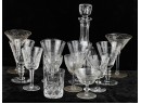 Including 11 1/4" signed Atlantis decanter (good), (1) signed Waterford 5 3/4" wine glass and misc other stems and glasses