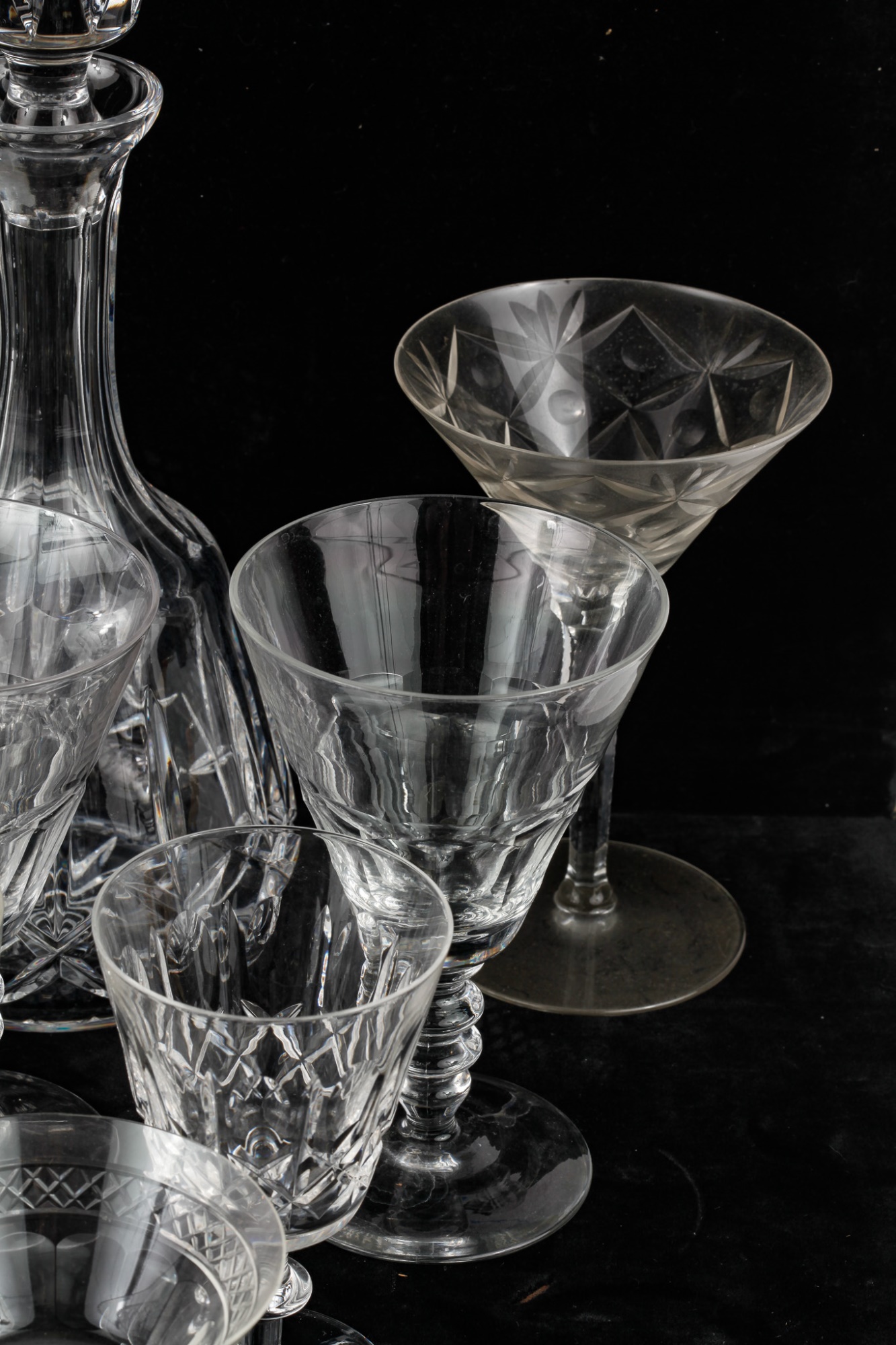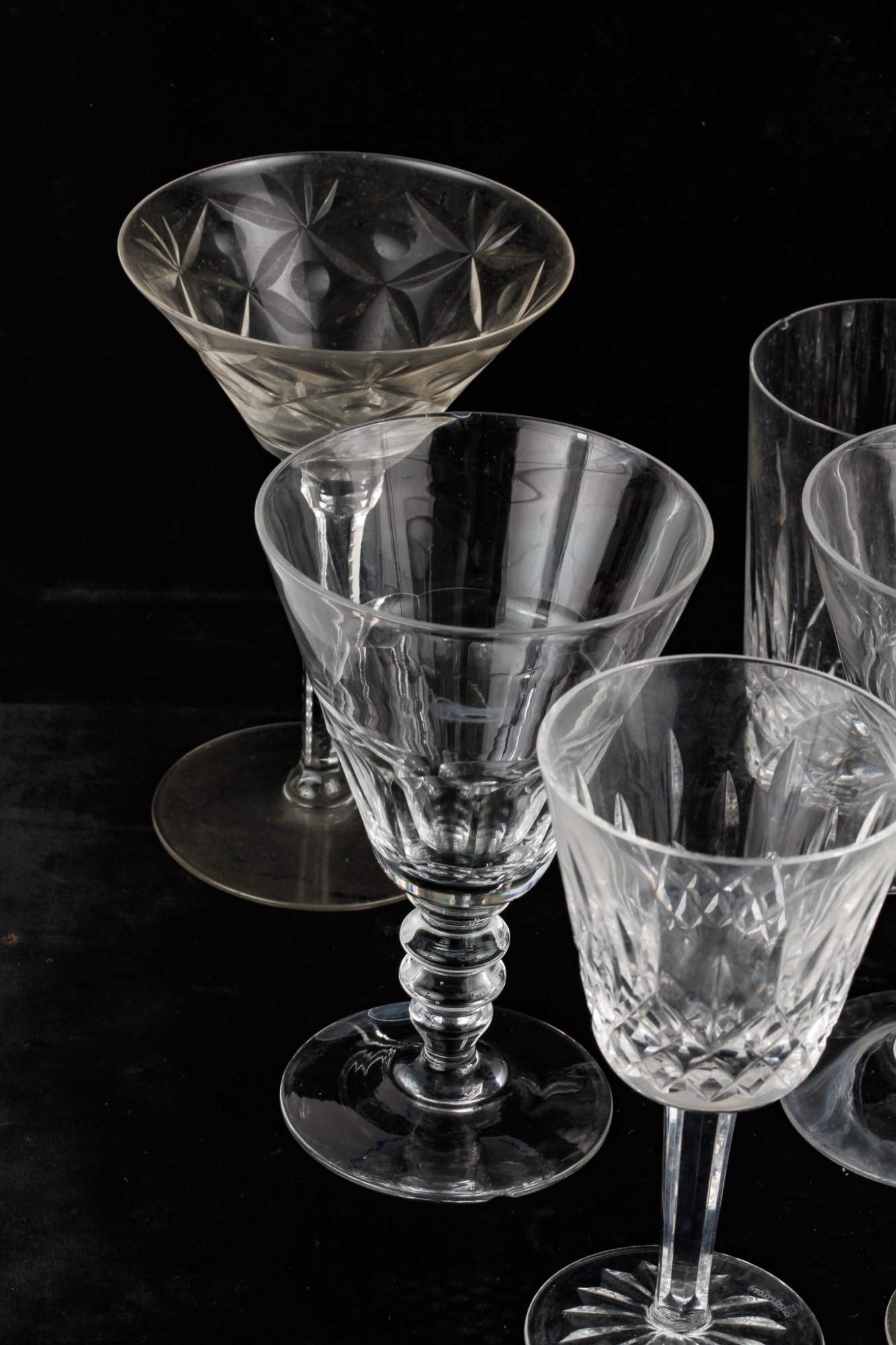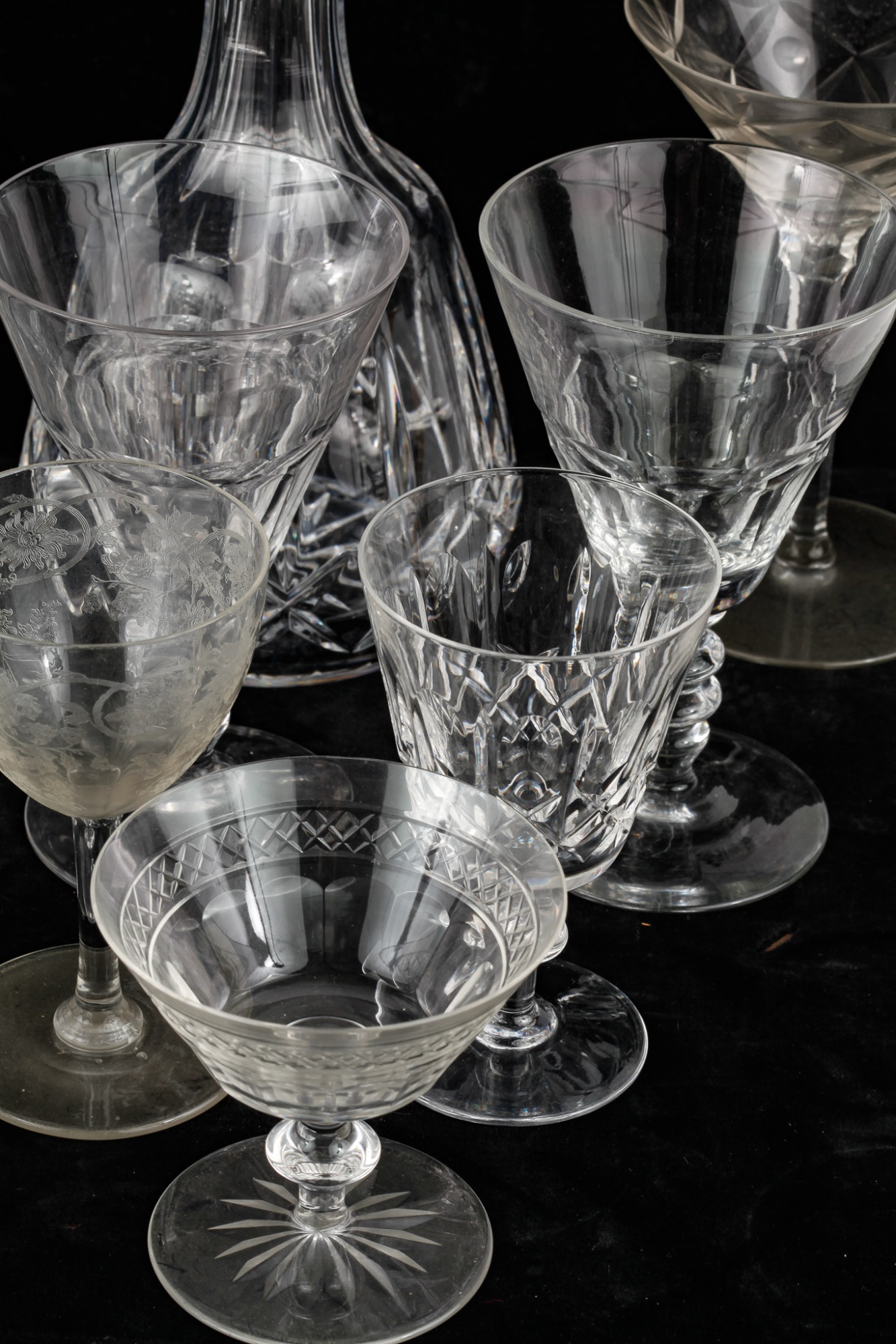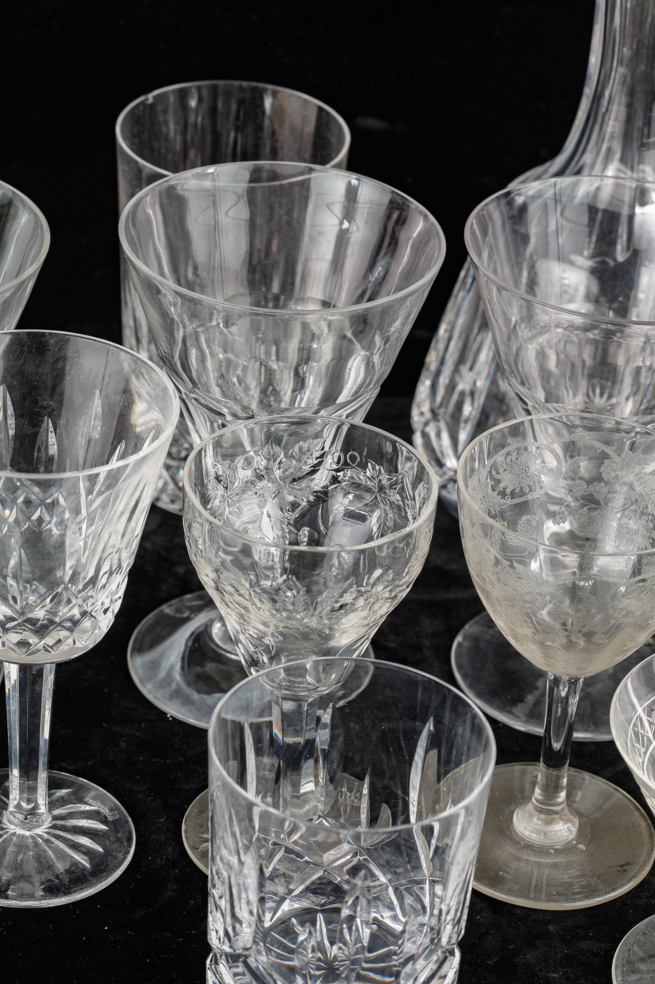 Including 11 1/4" signed Atlantis decanter (good), (1) signed Waterford 5 3/4" wine glass and misc other stems and glasses