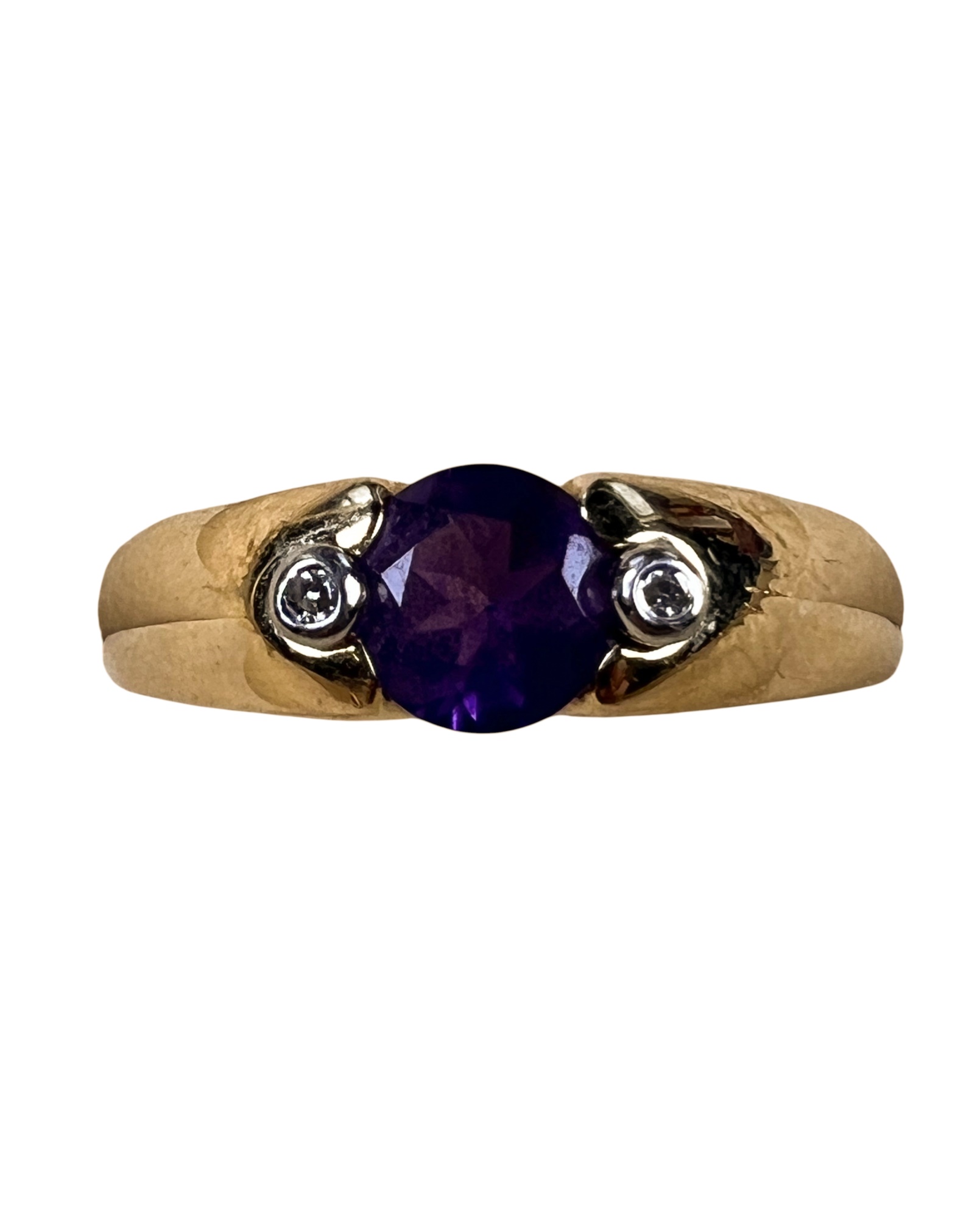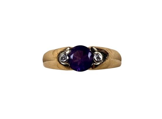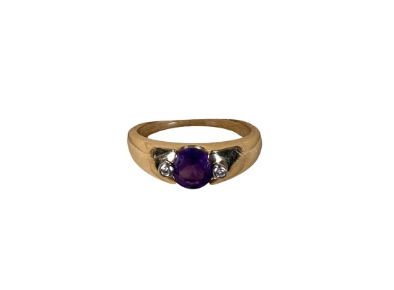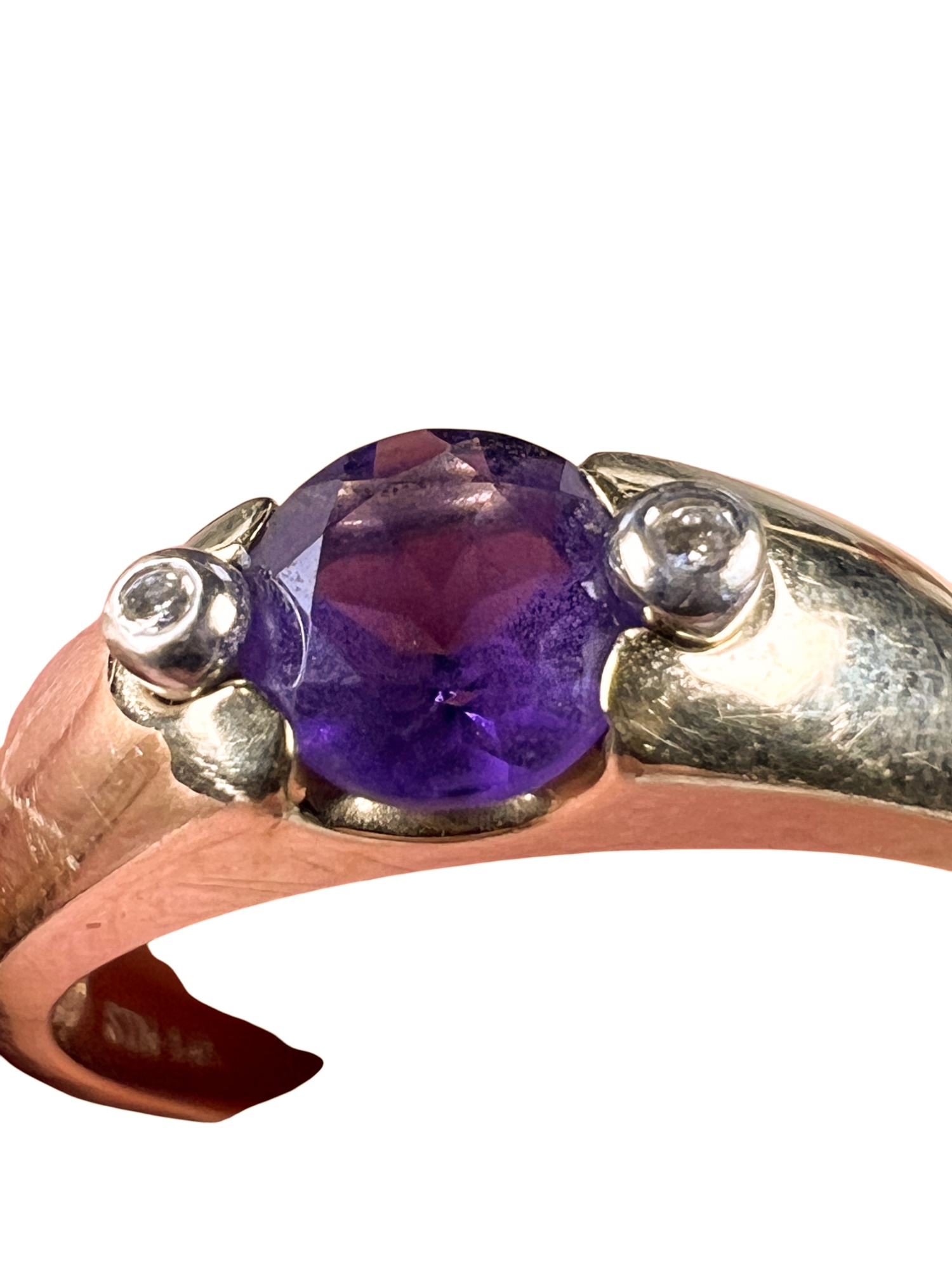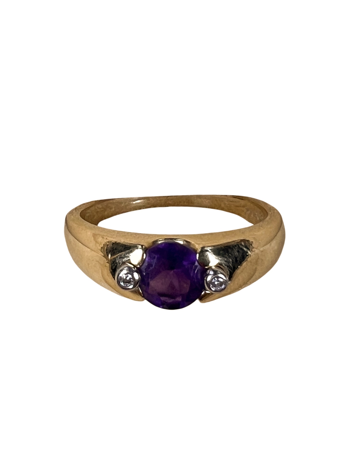 Central amethyst flanked by (2) small diamonds. Marked 14K. 2.7 DWT. Size 8 1/2 Condition: Good, used