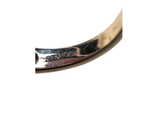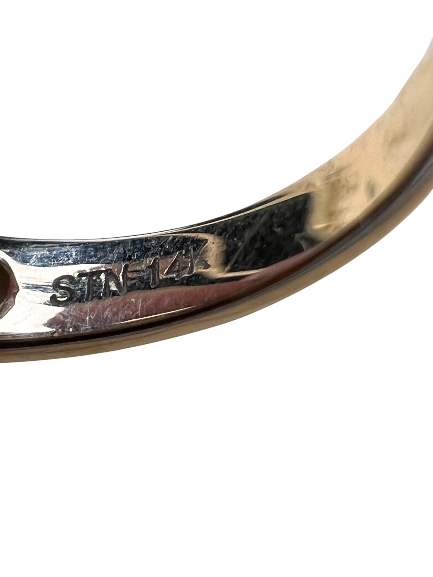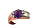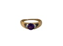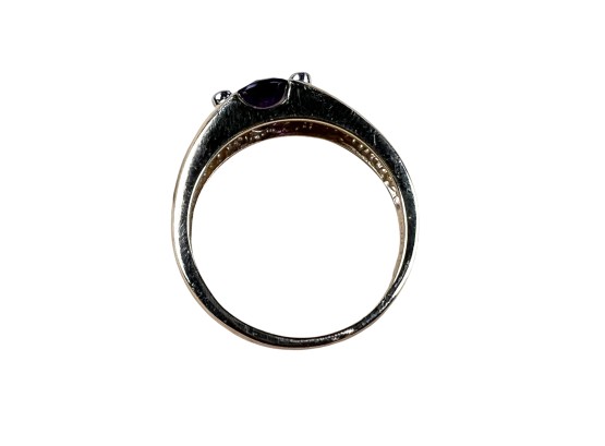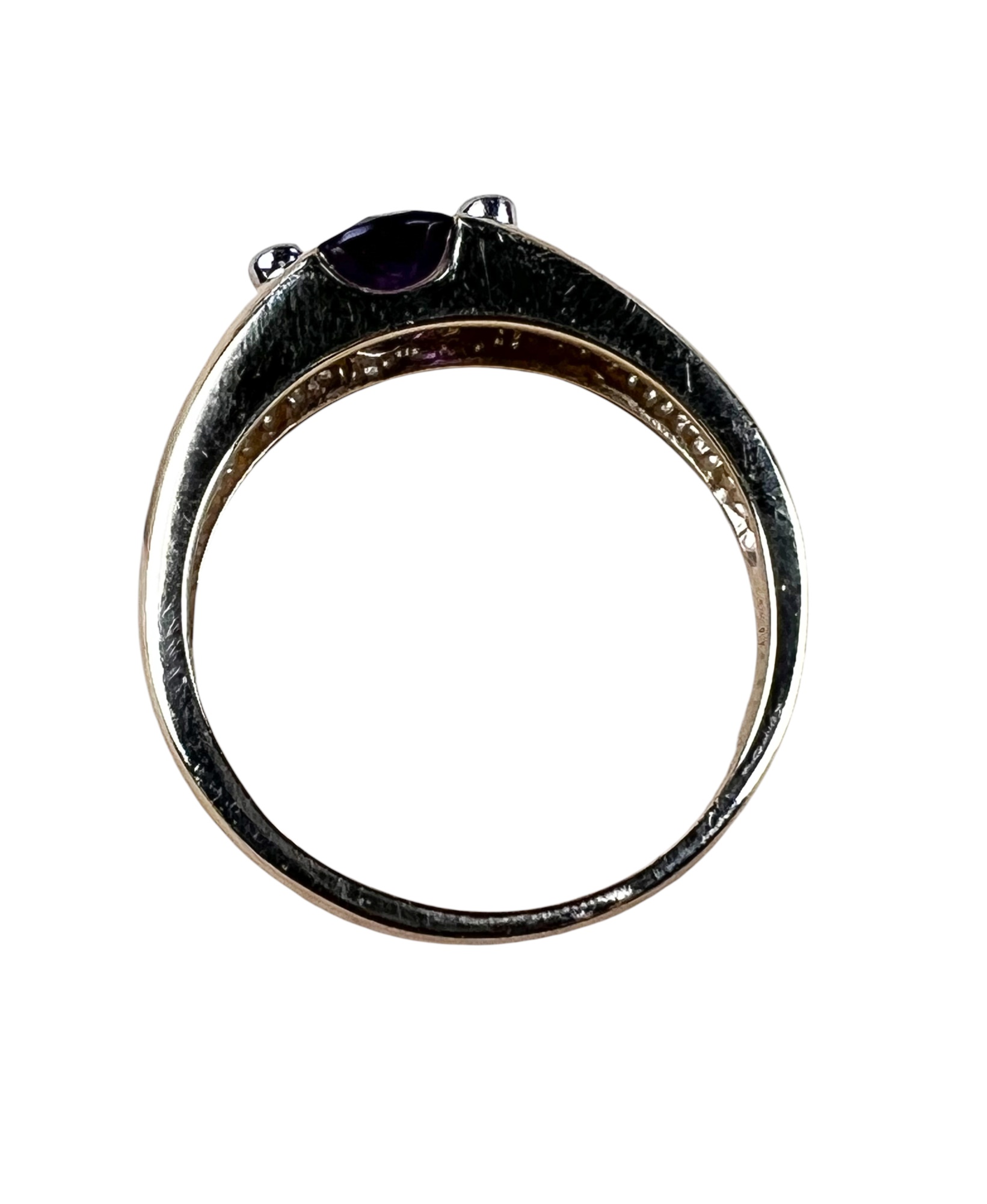 Central amethyst flanked by (2) small diamonds. Marked 14K. 2.7 DWT. Size 8 1/2 Condition: Good, used
