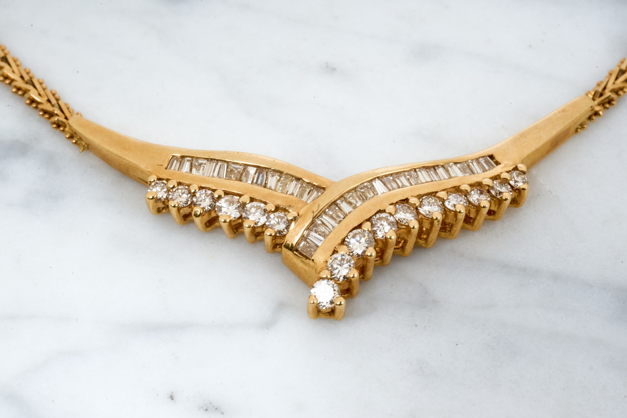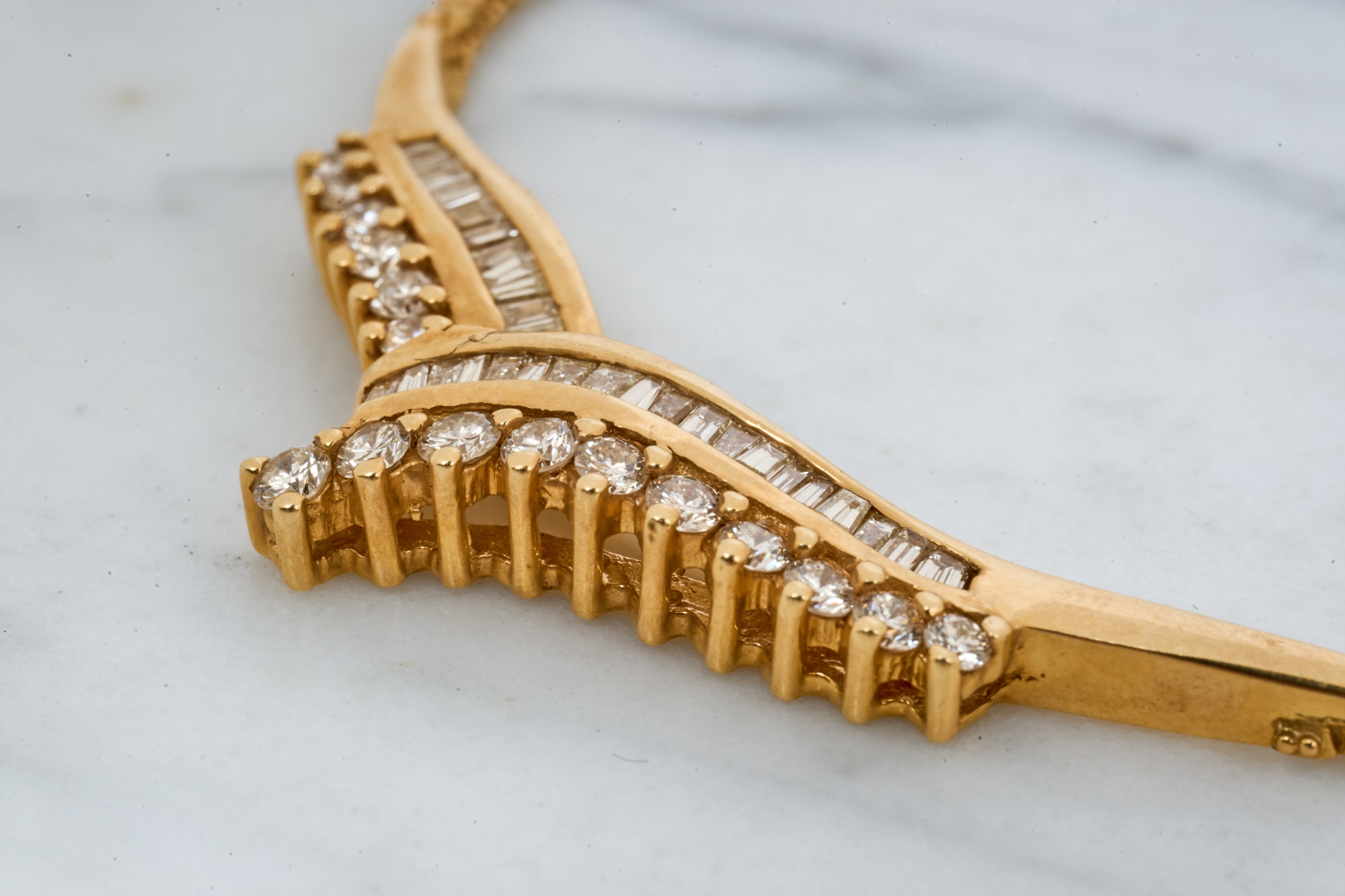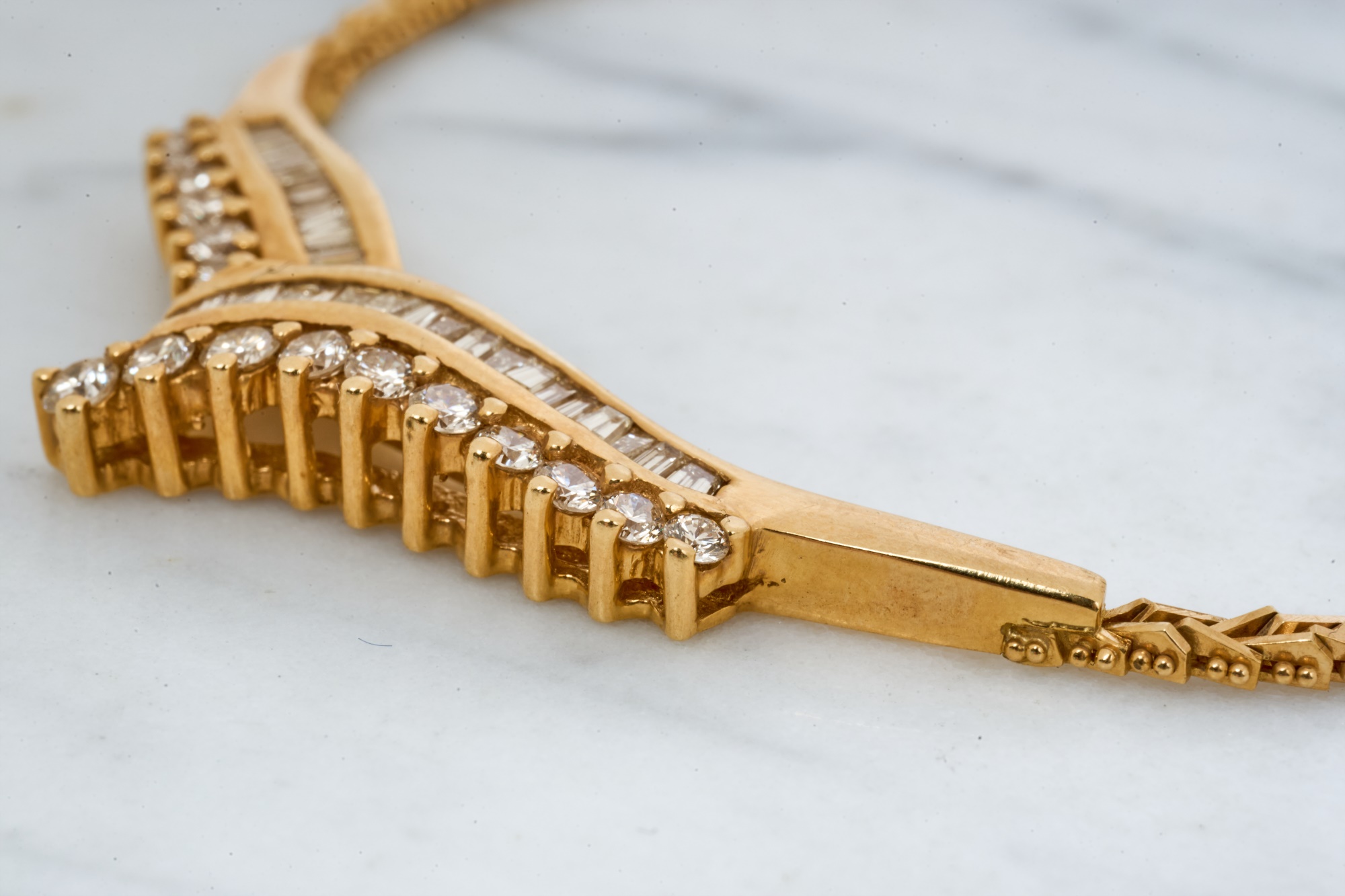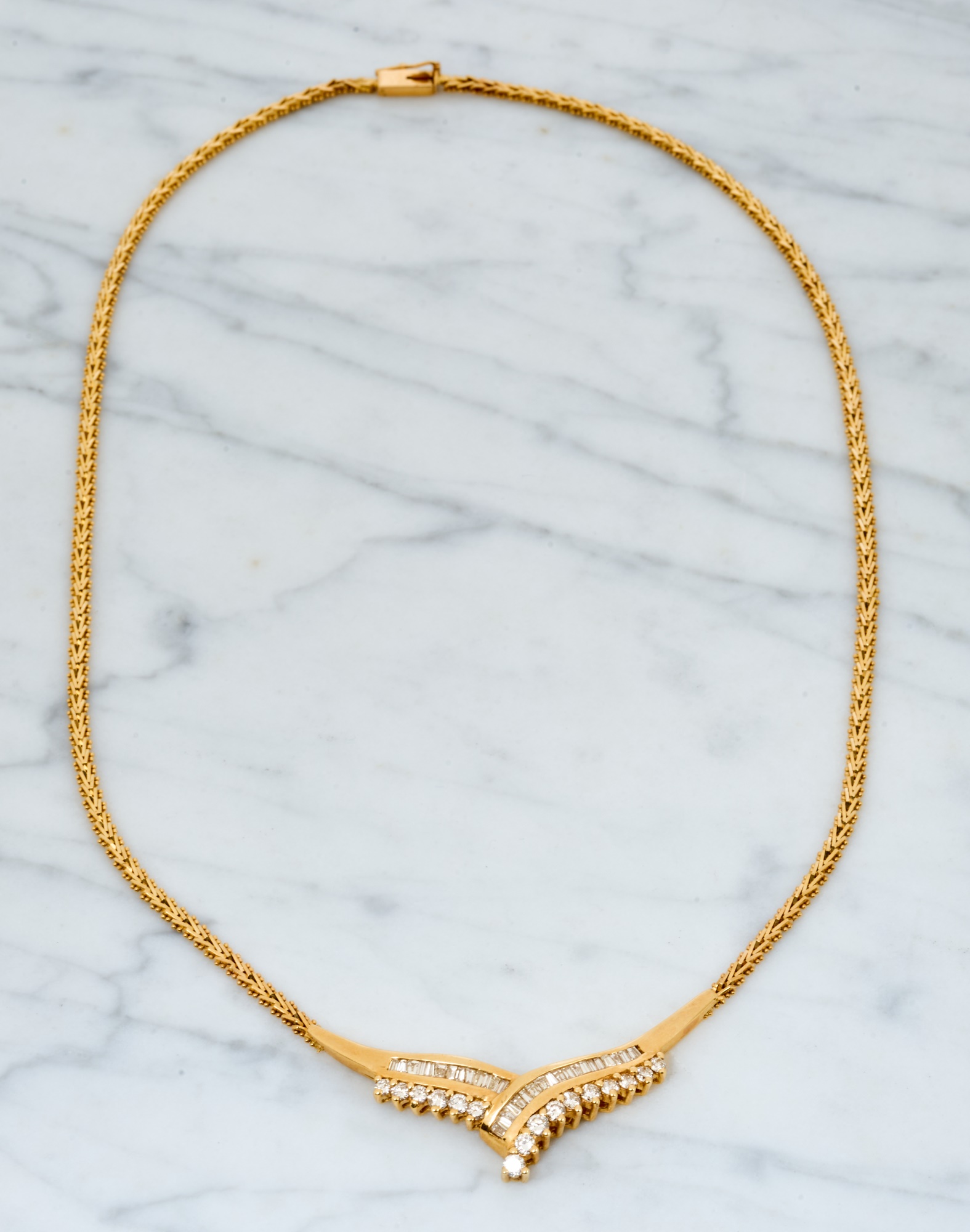 Emerald and round cut diamonds approx 2mm. 16 inches. 10.7 dwt. Condition: Good