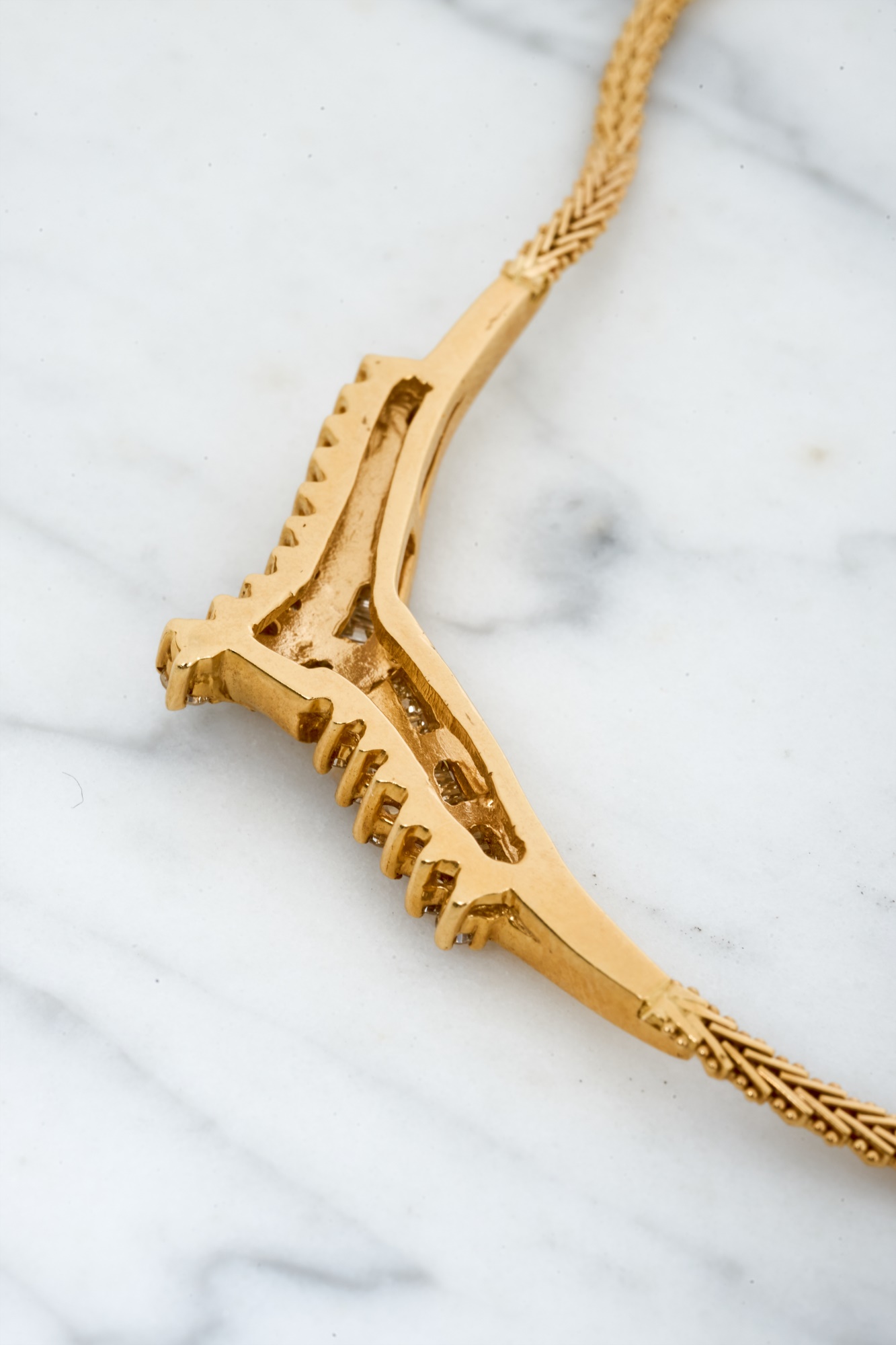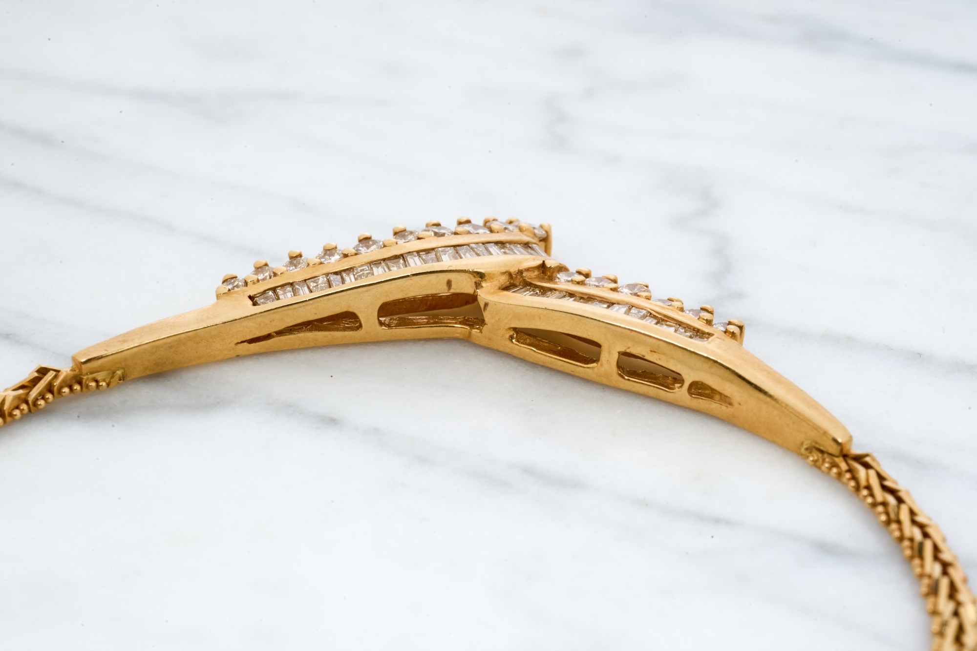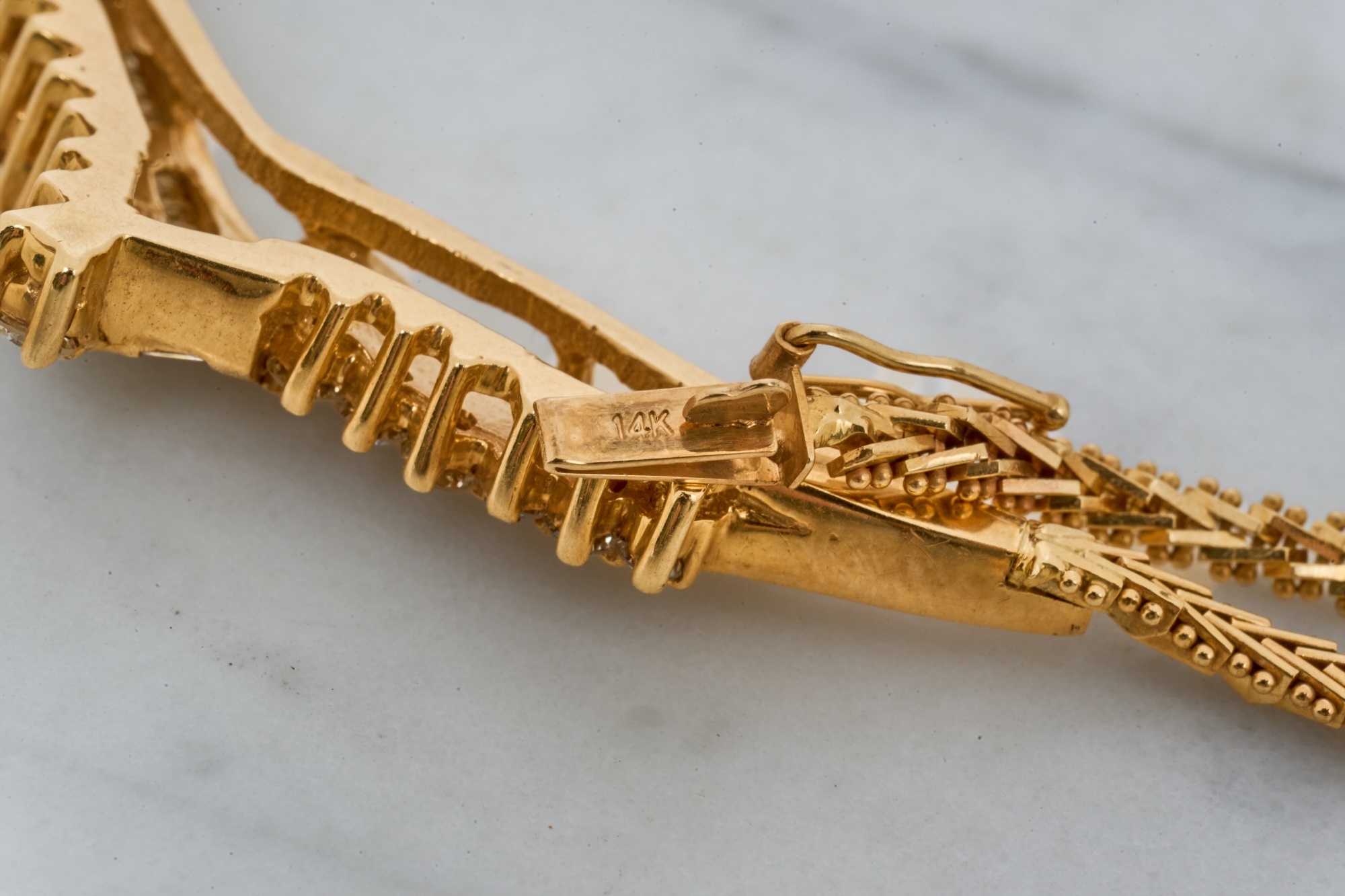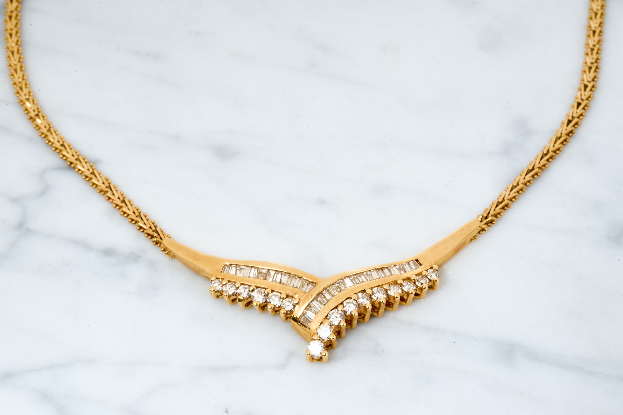 Emerald and round cut diamonds approx 2mm. 16 inches. 10.7 dwt. Condition: Good