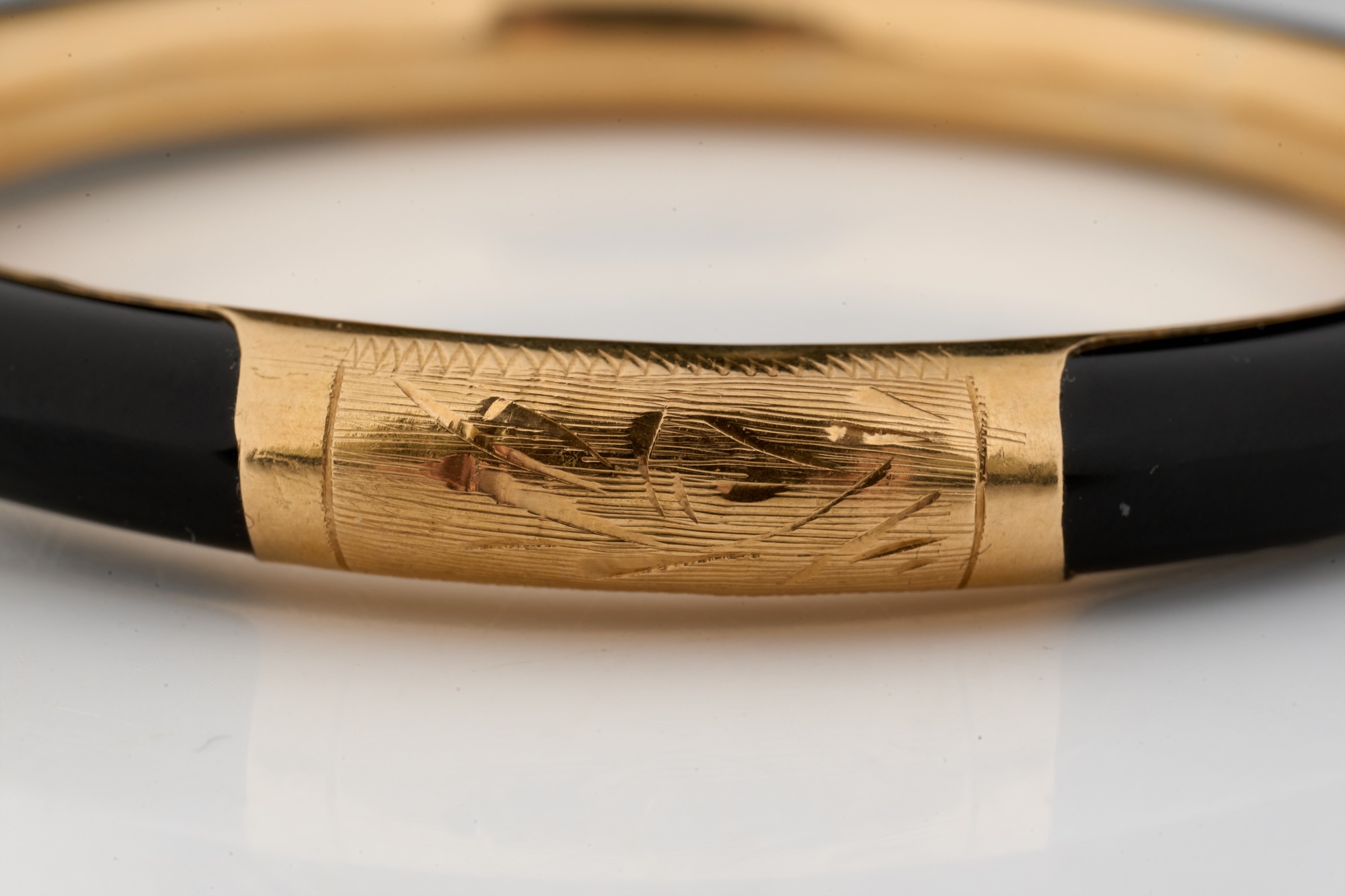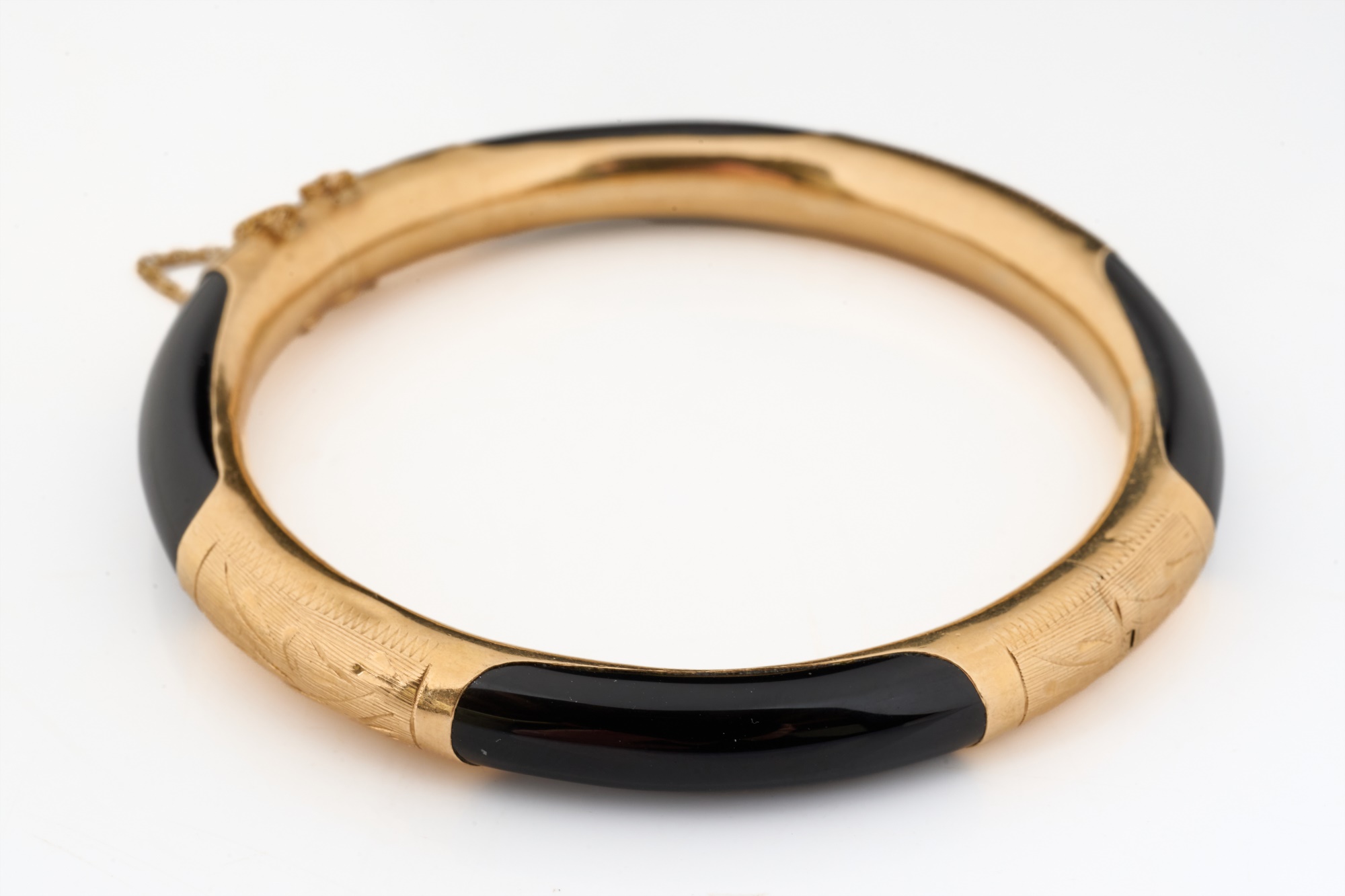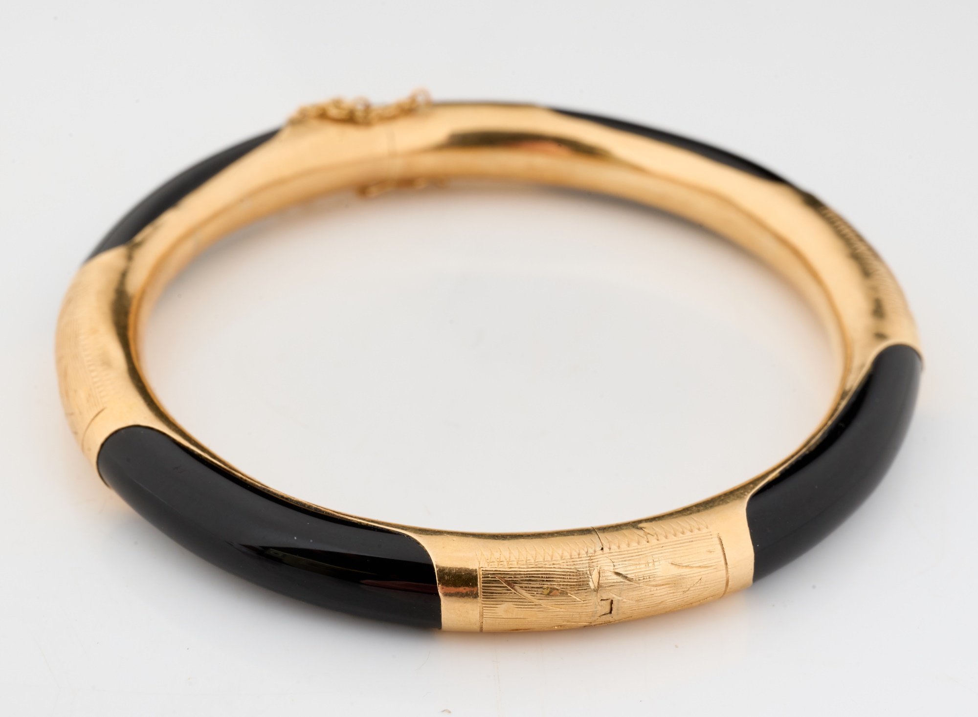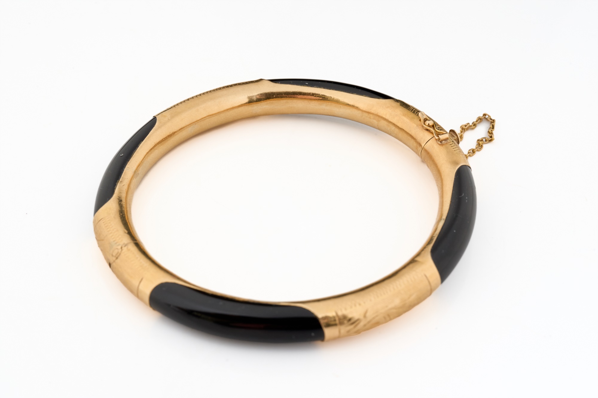 Engraved rose gold and onyx. 2.75 inches (diameter). 13.5 dwt (gross weight) Condition: Good