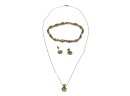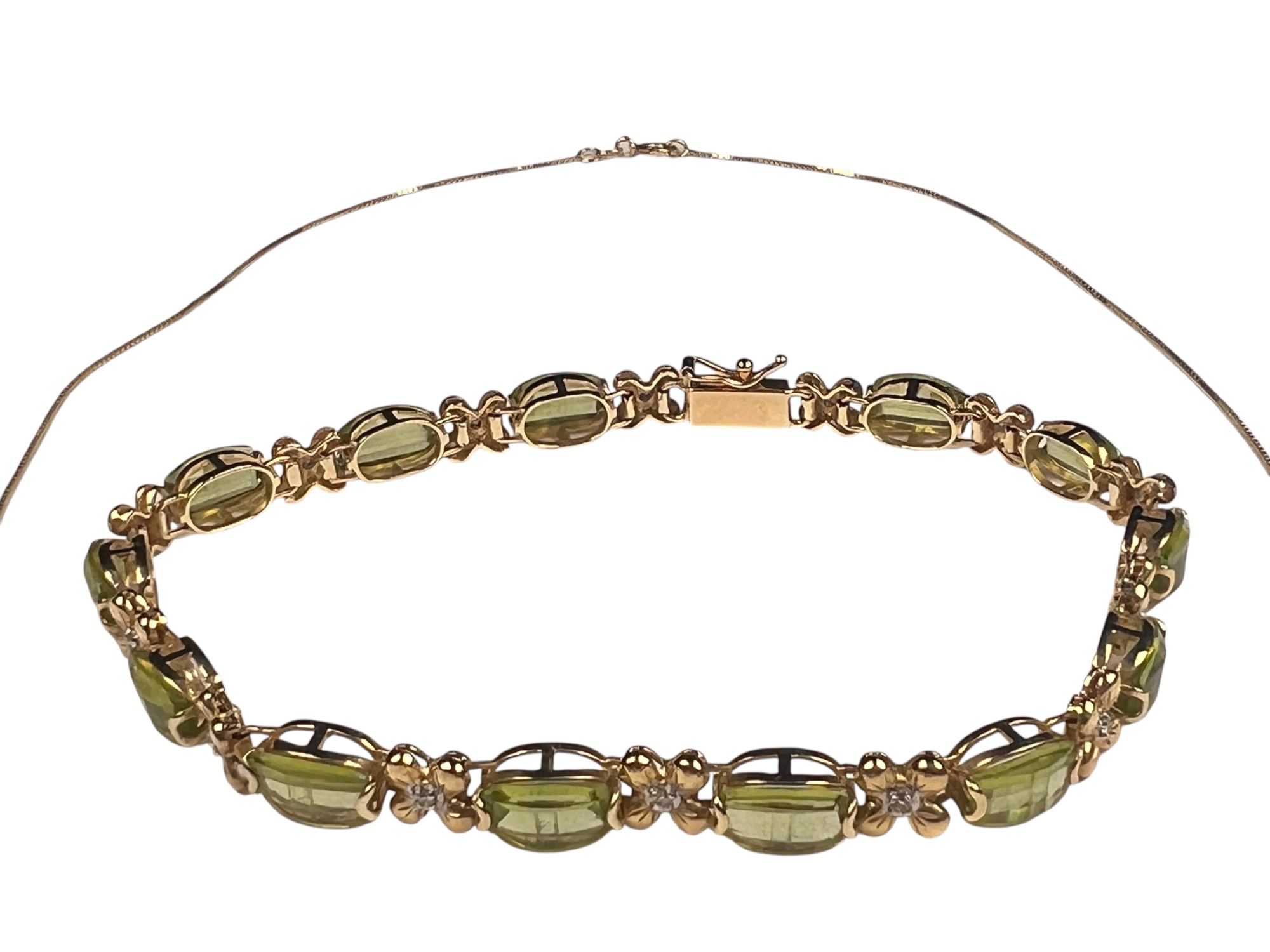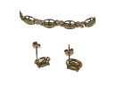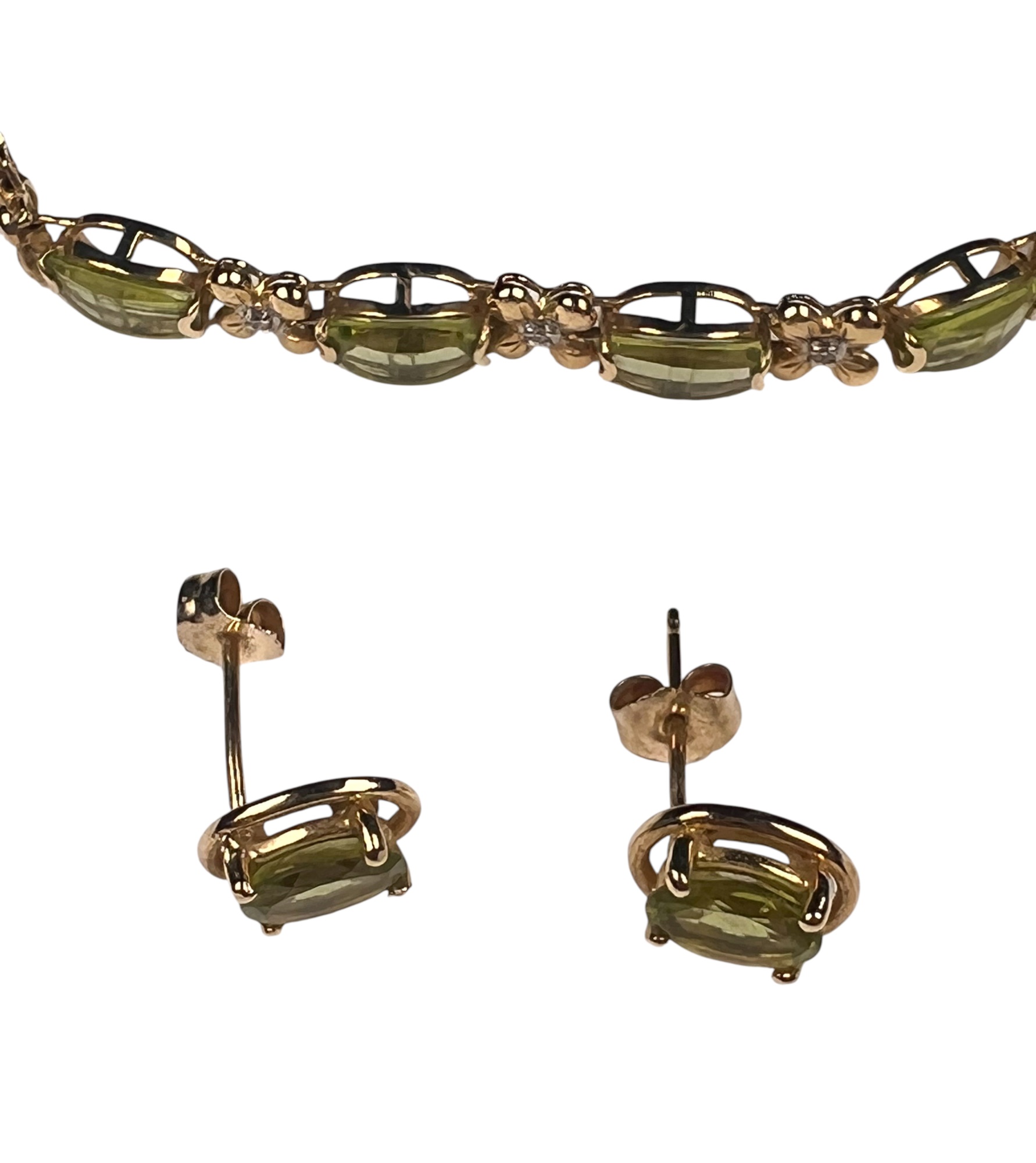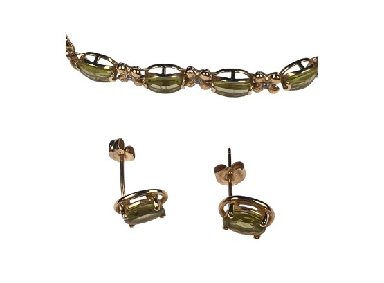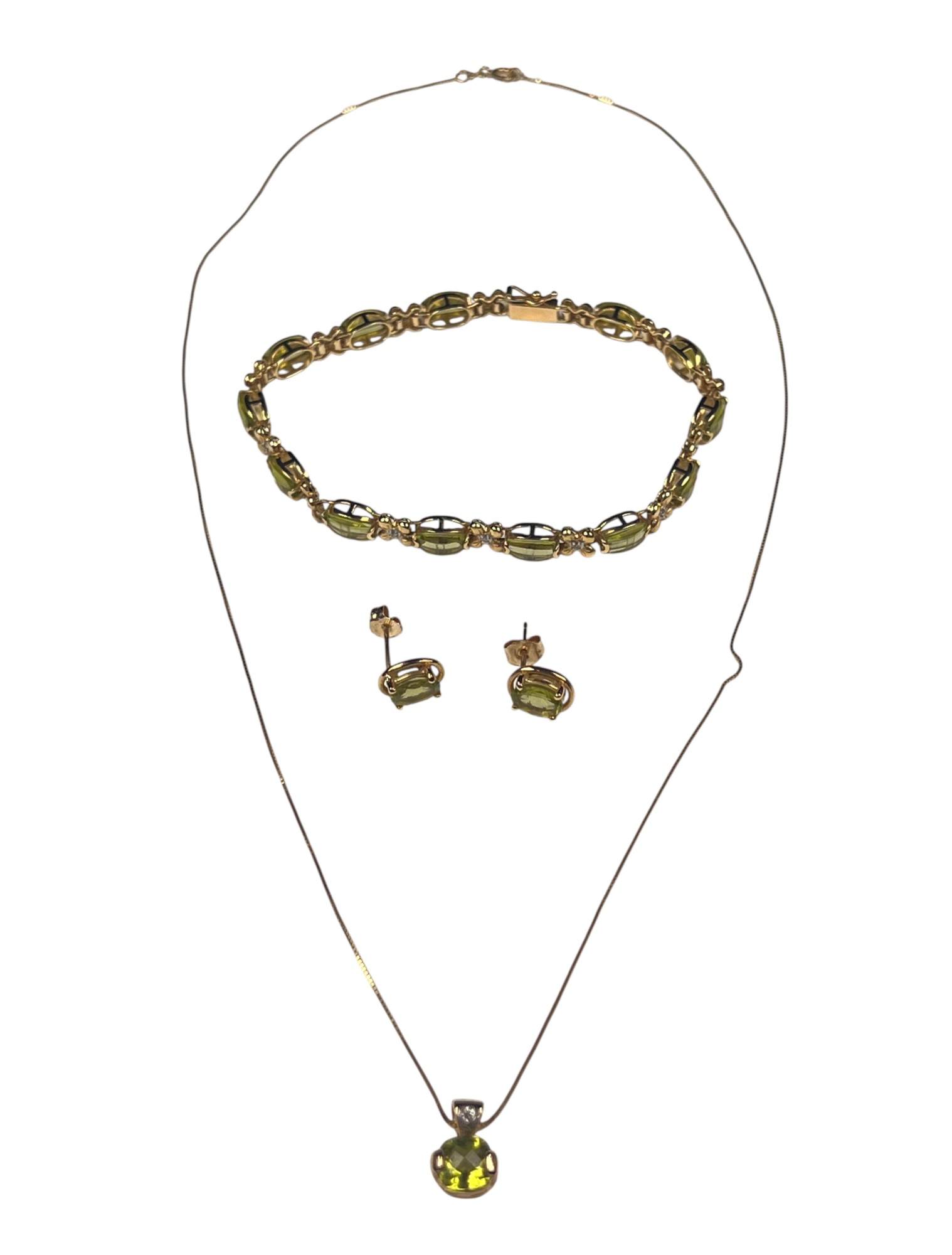 Including necklace with drop, pair of earrings, and a tennis bracelet. All marked 14K and set with Peridot stones. Necklace 18" long. 8.2 DWT Condition: Good, used