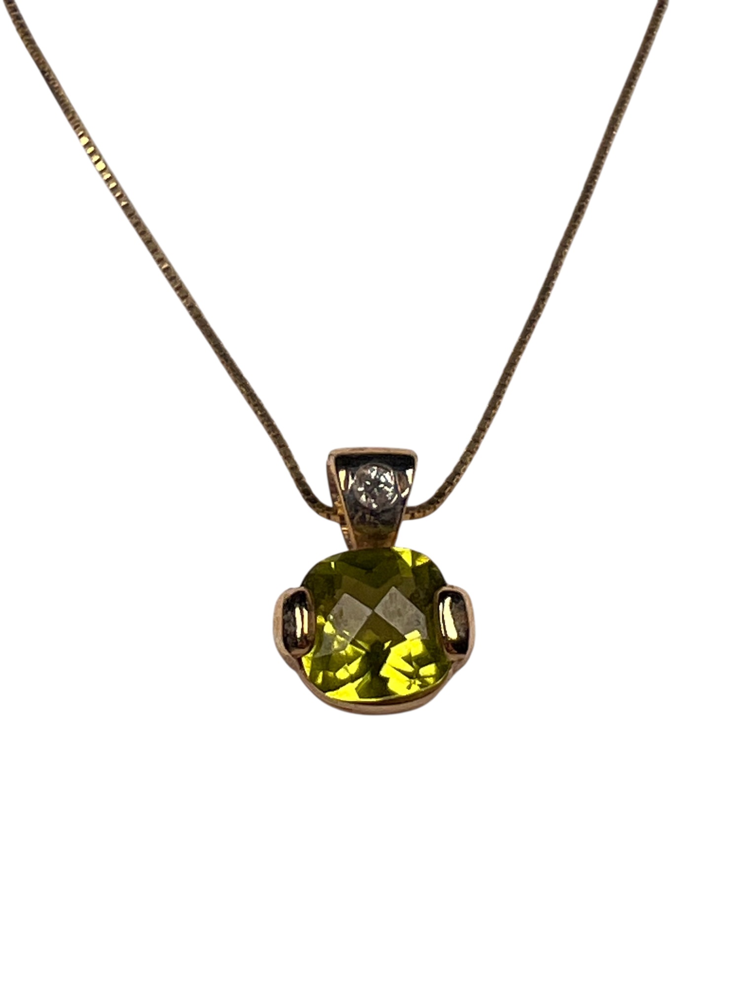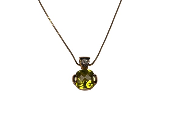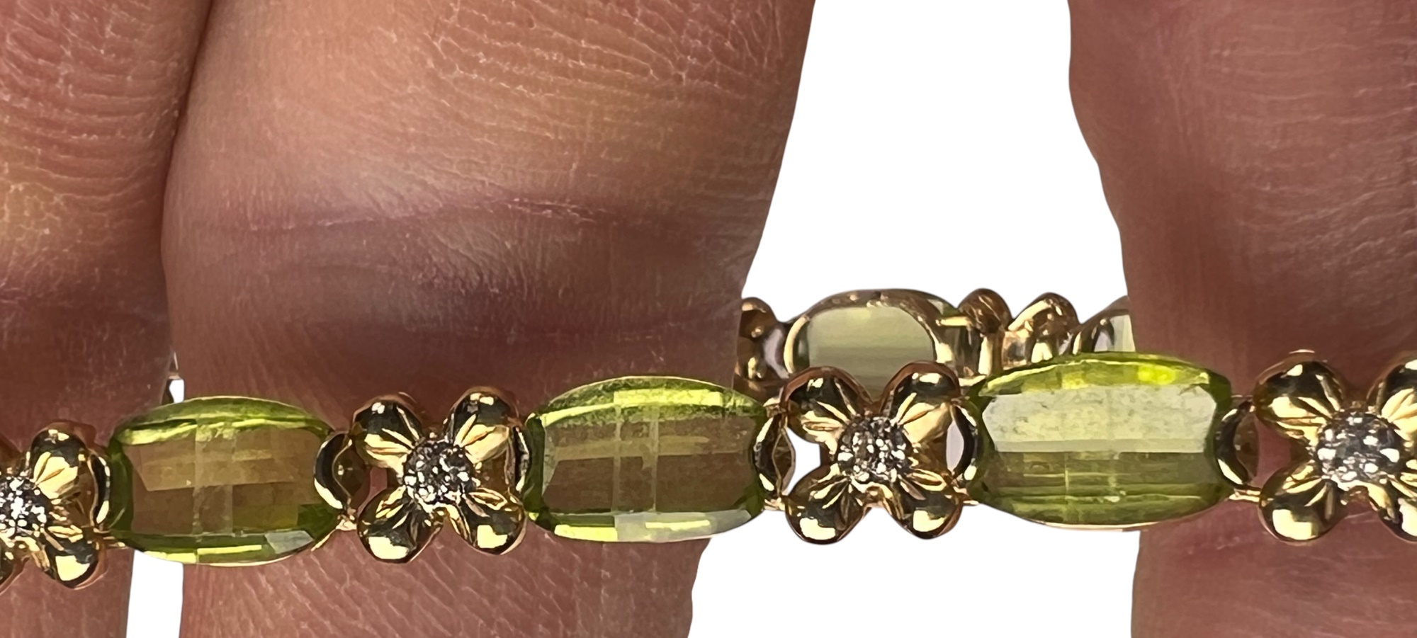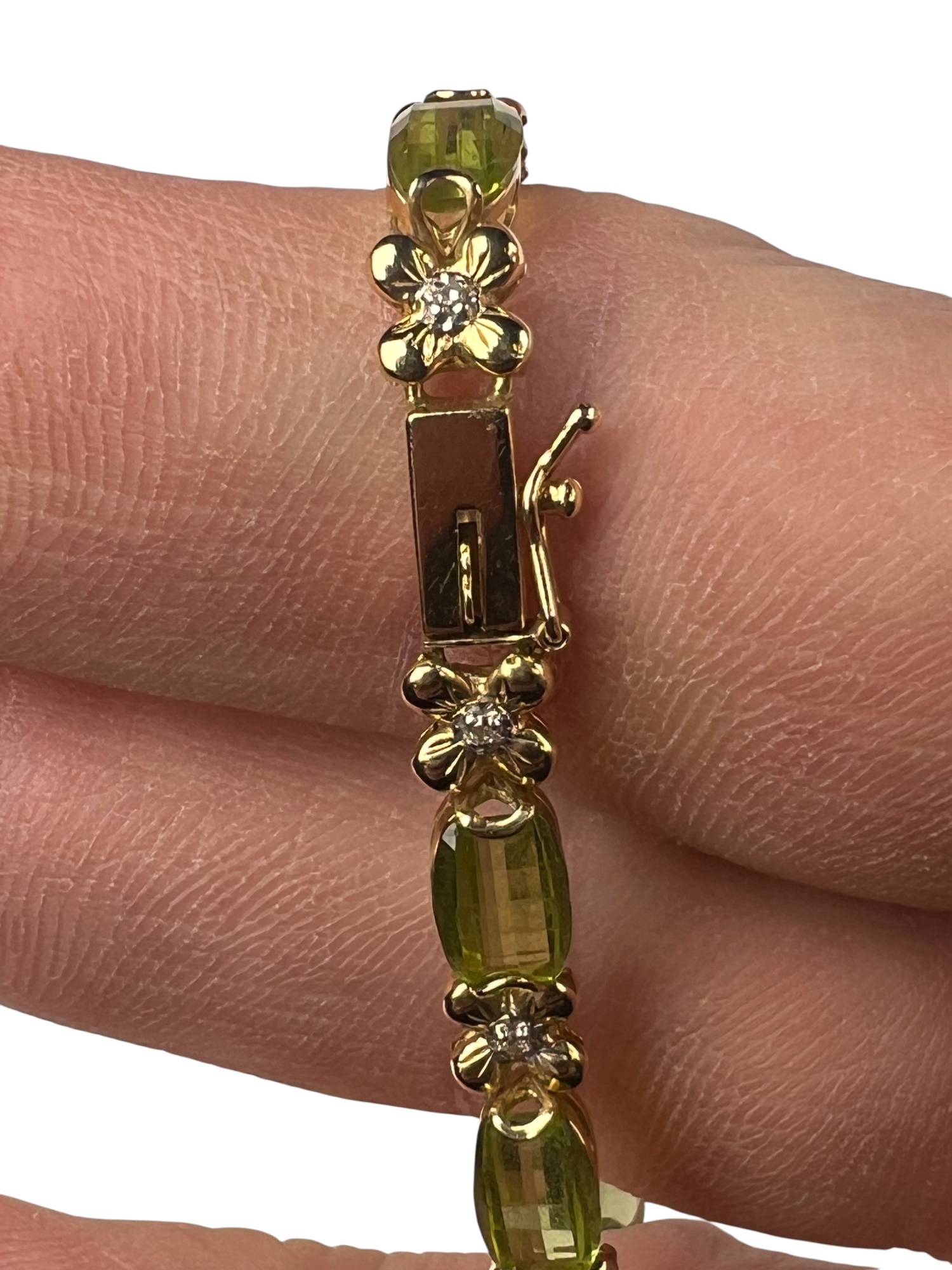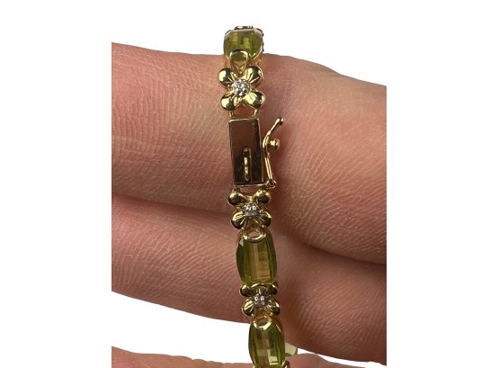 Including necklace with drop, pair of earrings, and a tennis bracelet. All marked 14K and set with Peridot stones. Necklace 18" long. 8.2 DWT Condition: Good, used