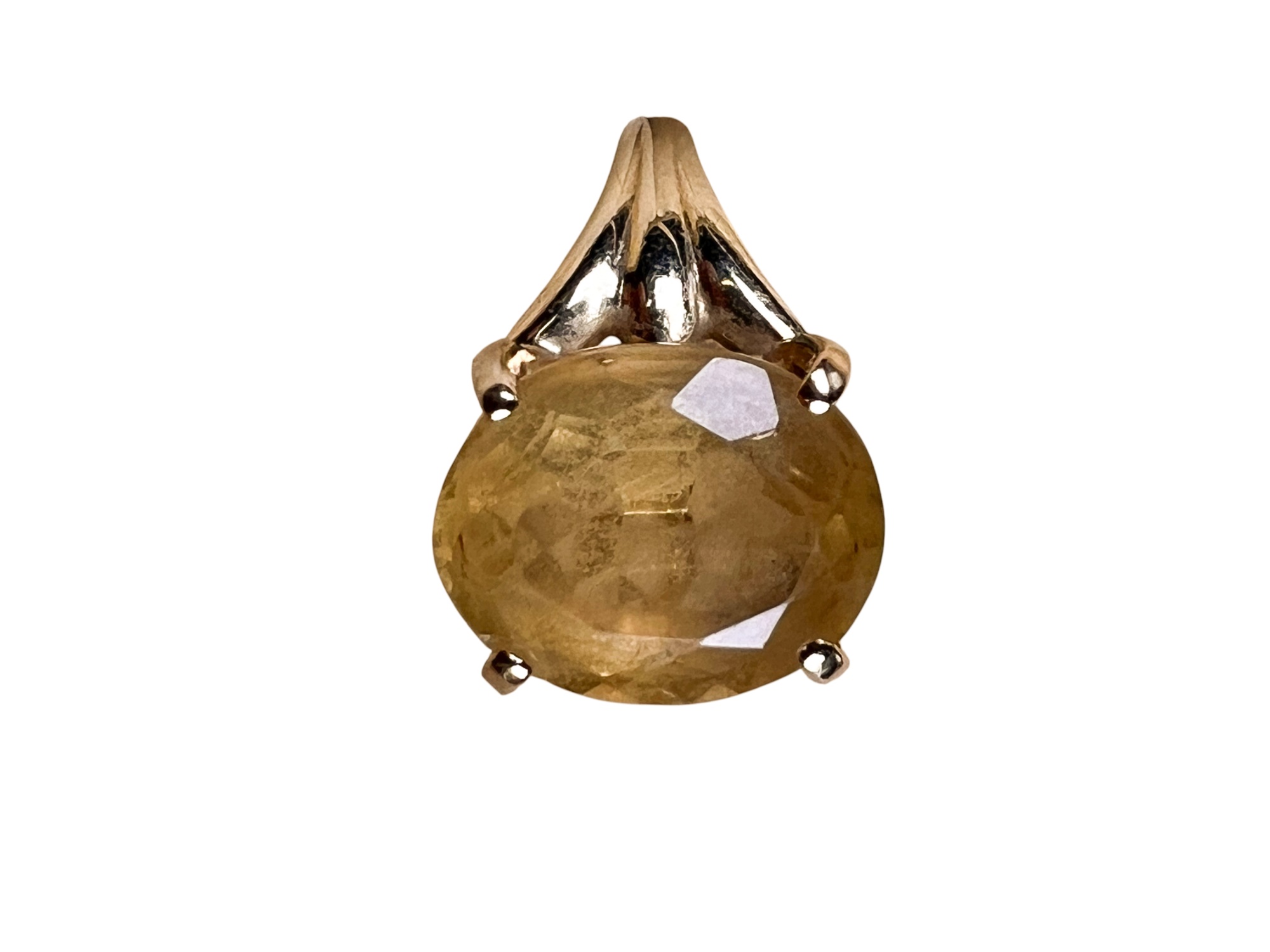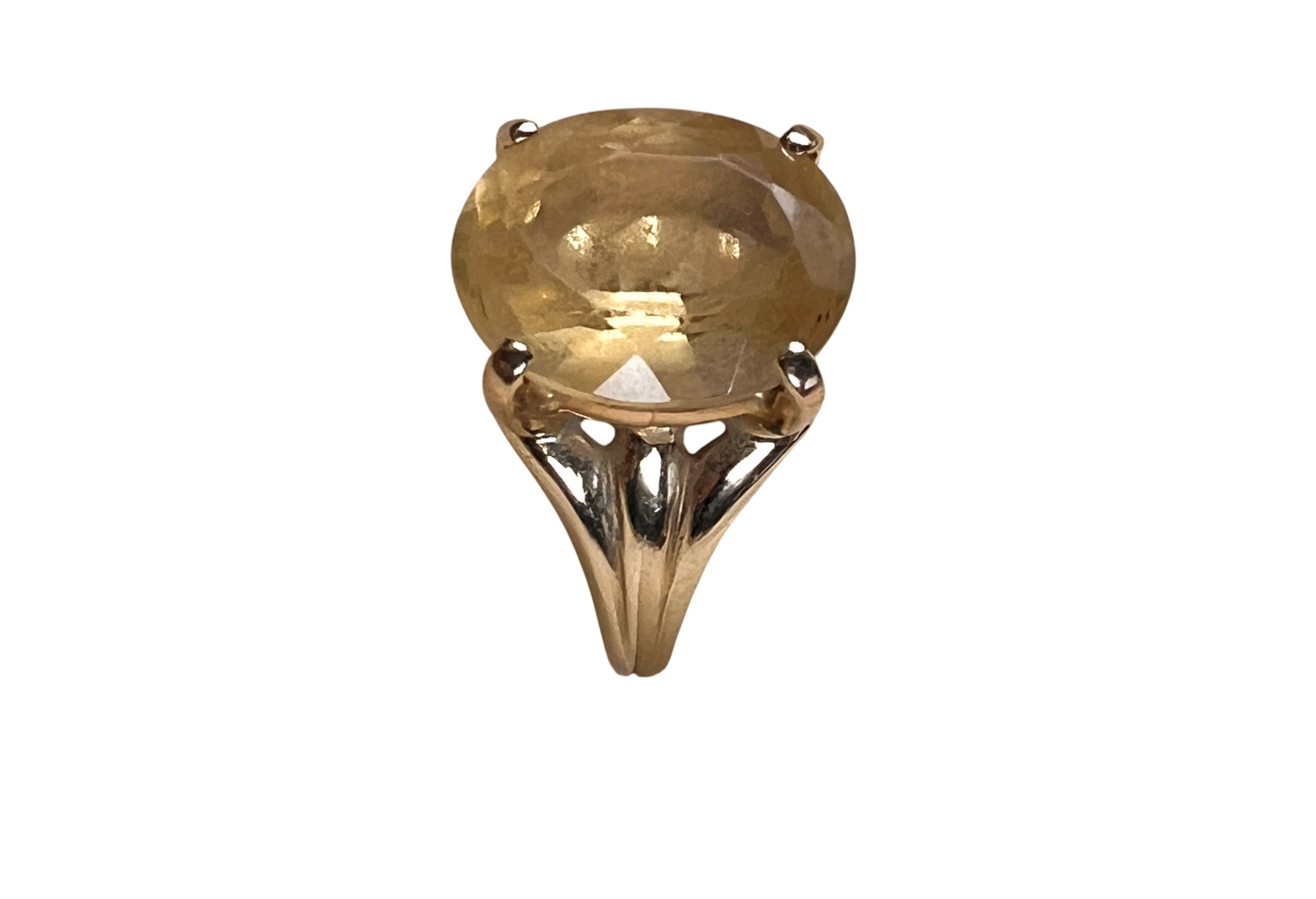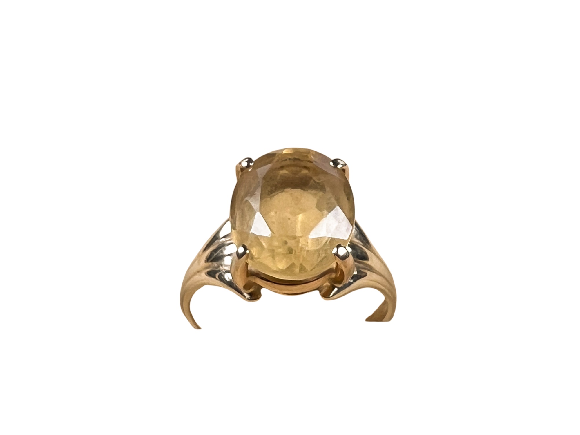 Marked 14K. Stone tests as citrine but is most likely synthetic. 2.4 DWT. Size 8. Condition: Good, used