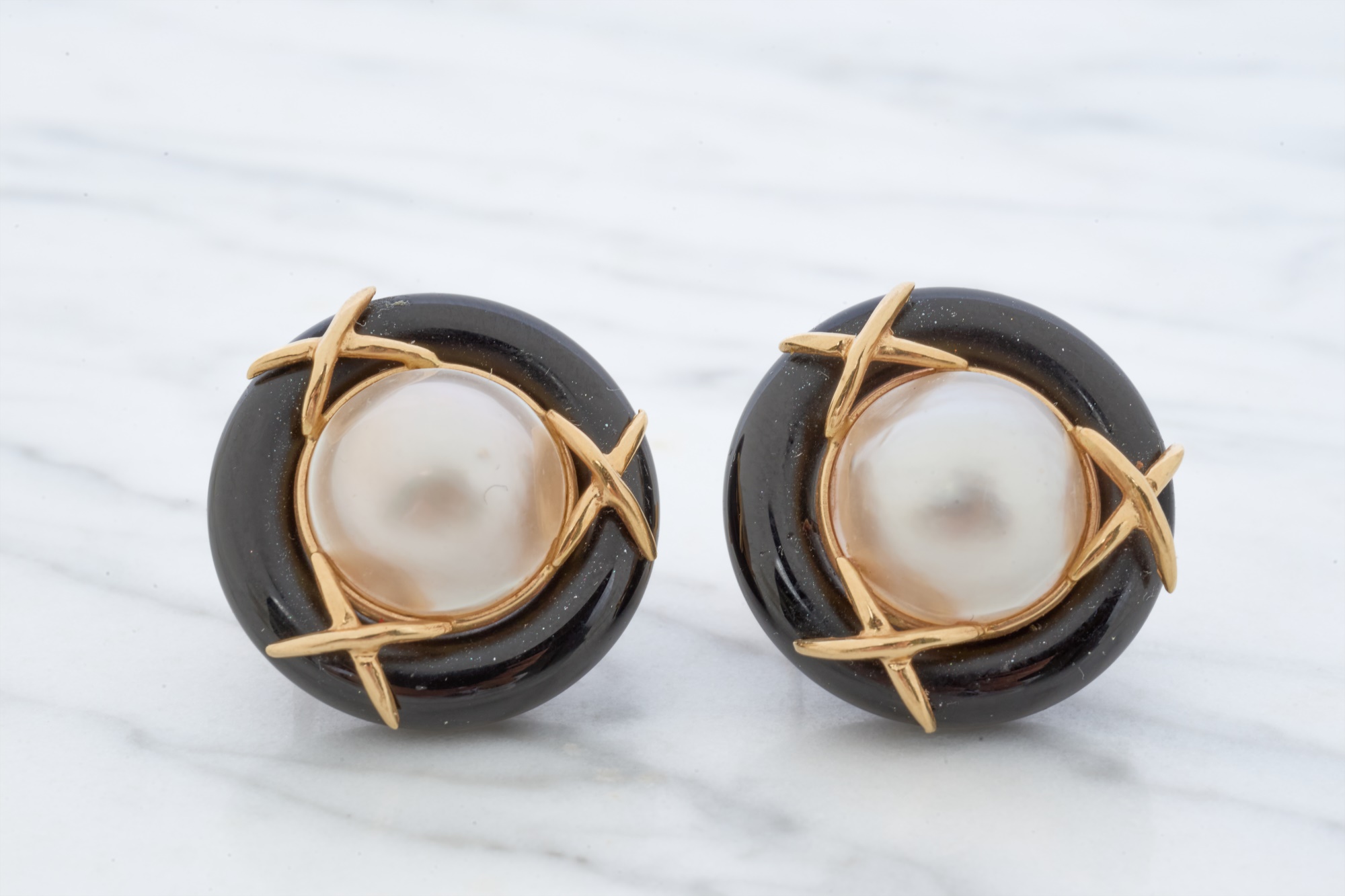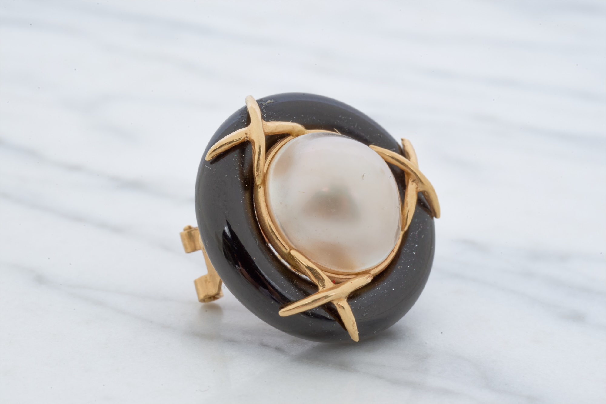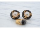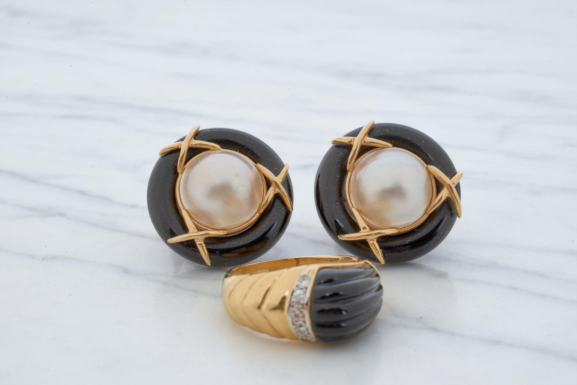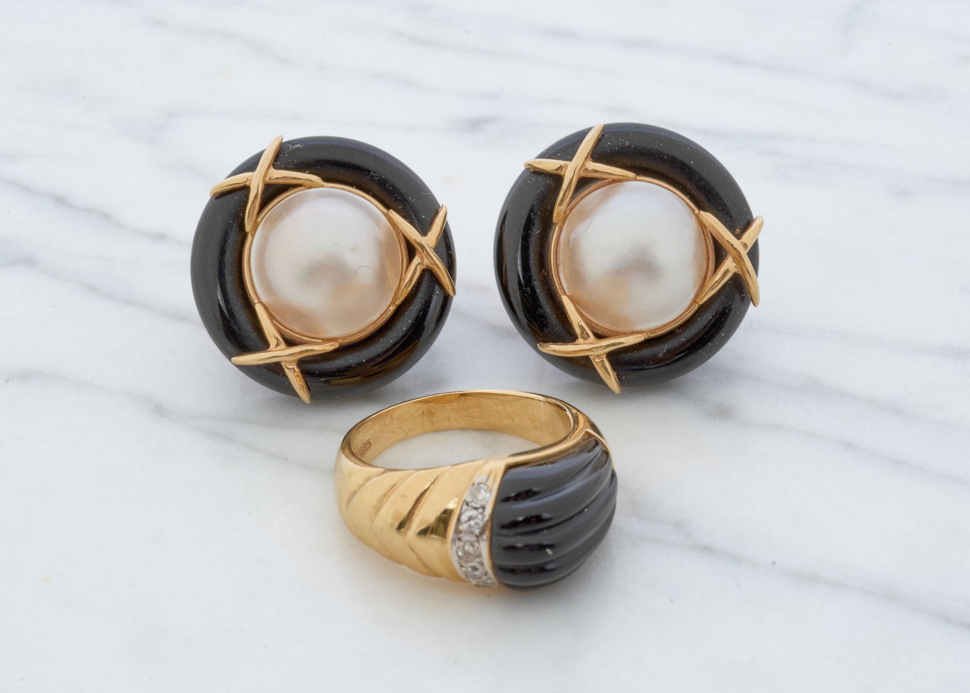 12mm Mabe pearl in .87 inch setting. Ring size 7.5 is set with accent diamonds under 1mm. 4.6 dwt (ring) 12.1 dwt (gross weight for both) Condition: Not a matching set Good