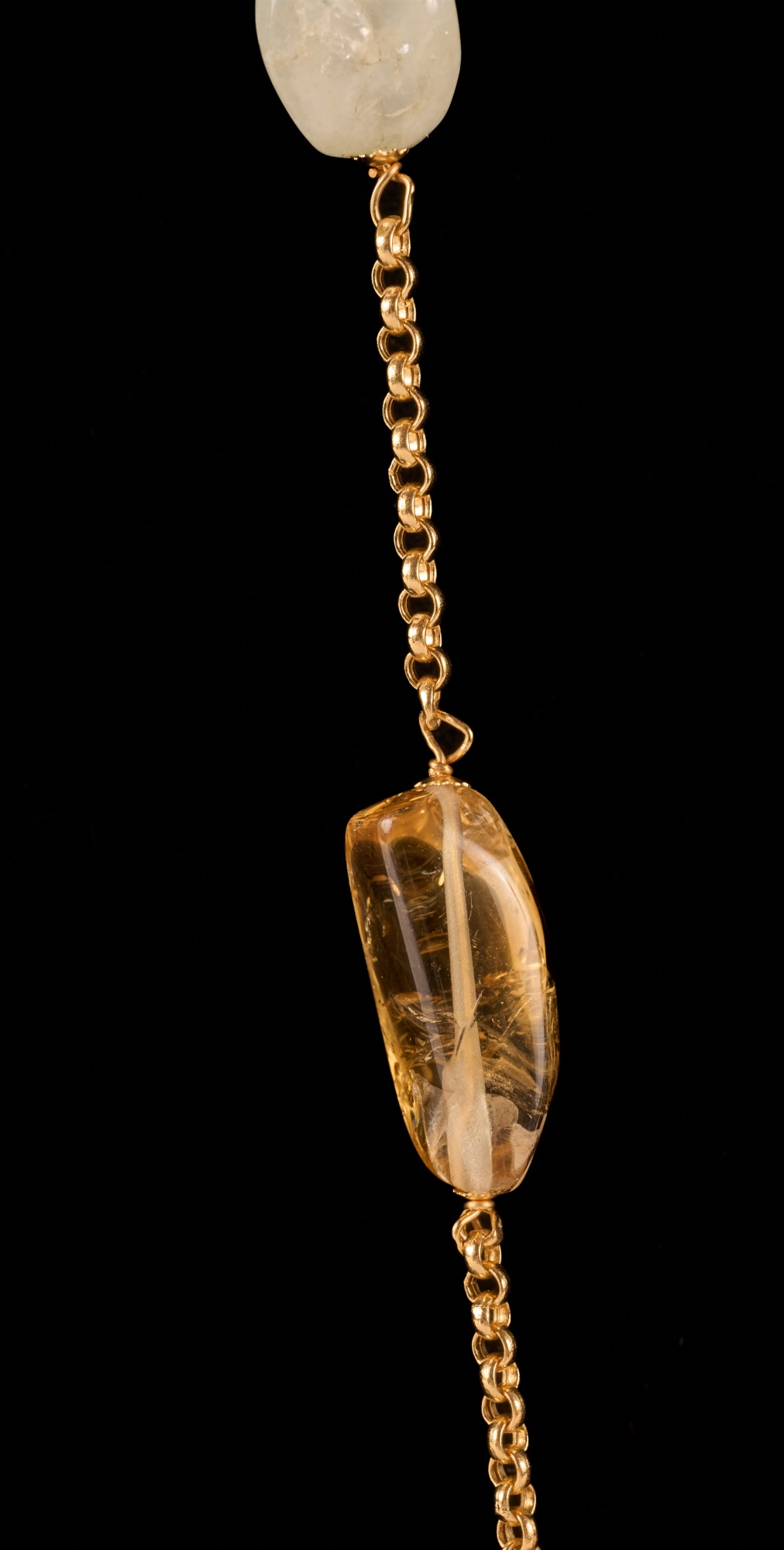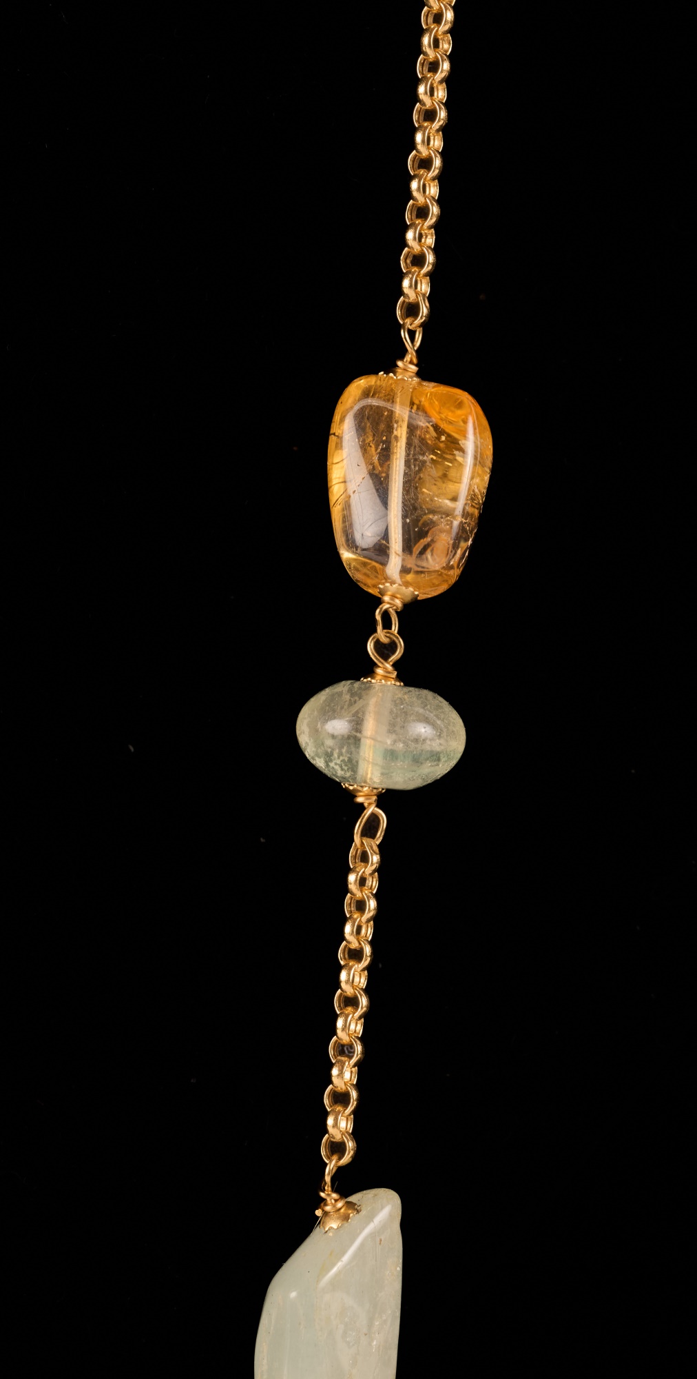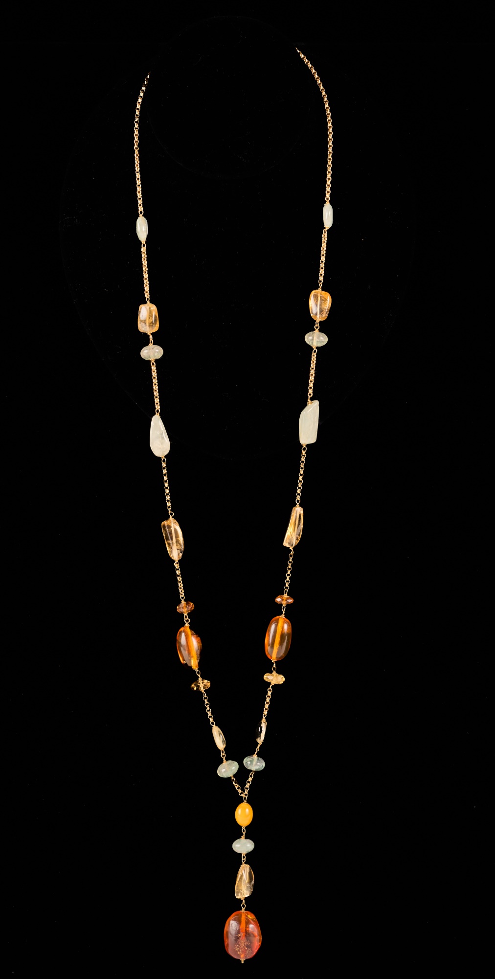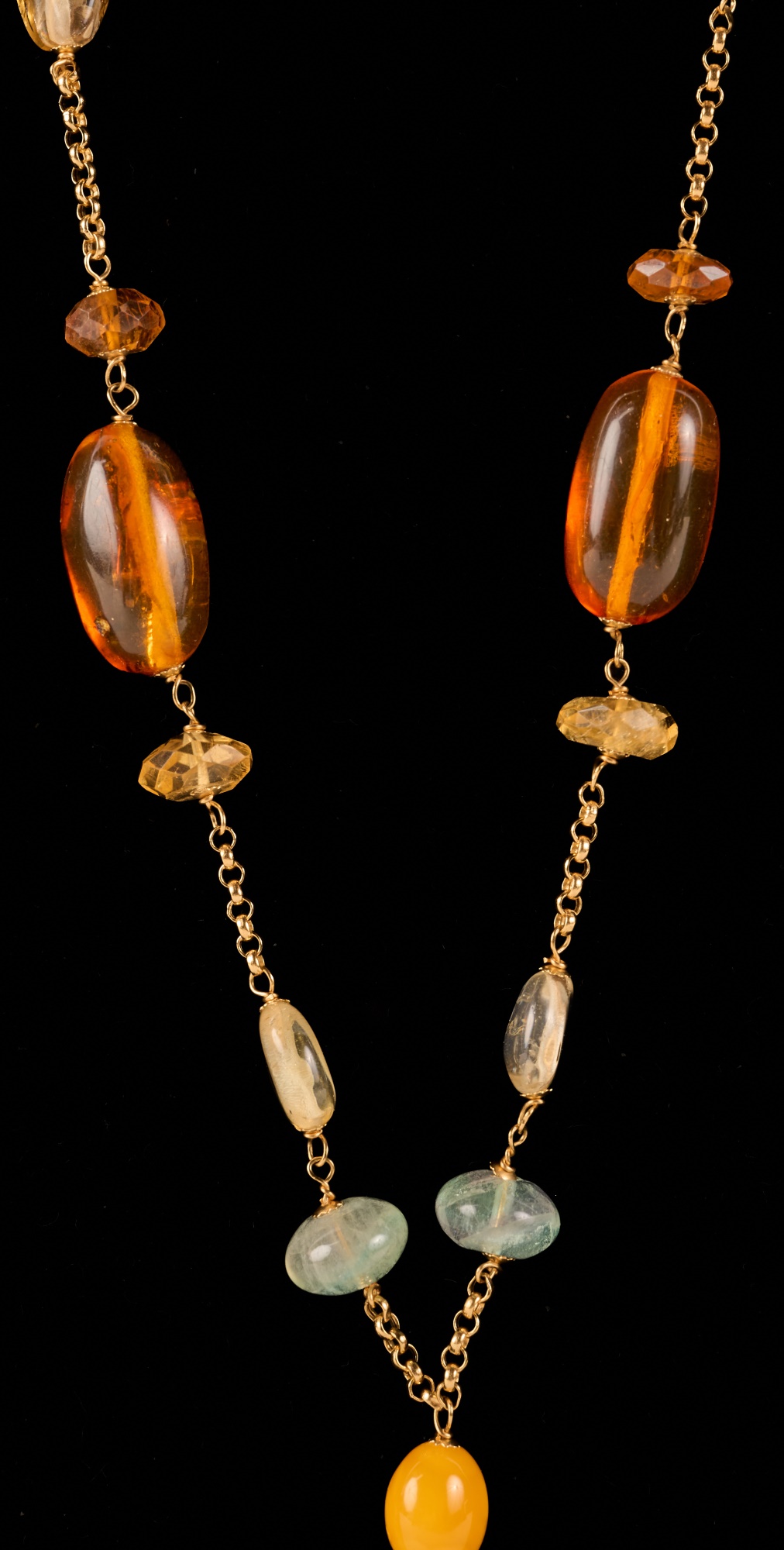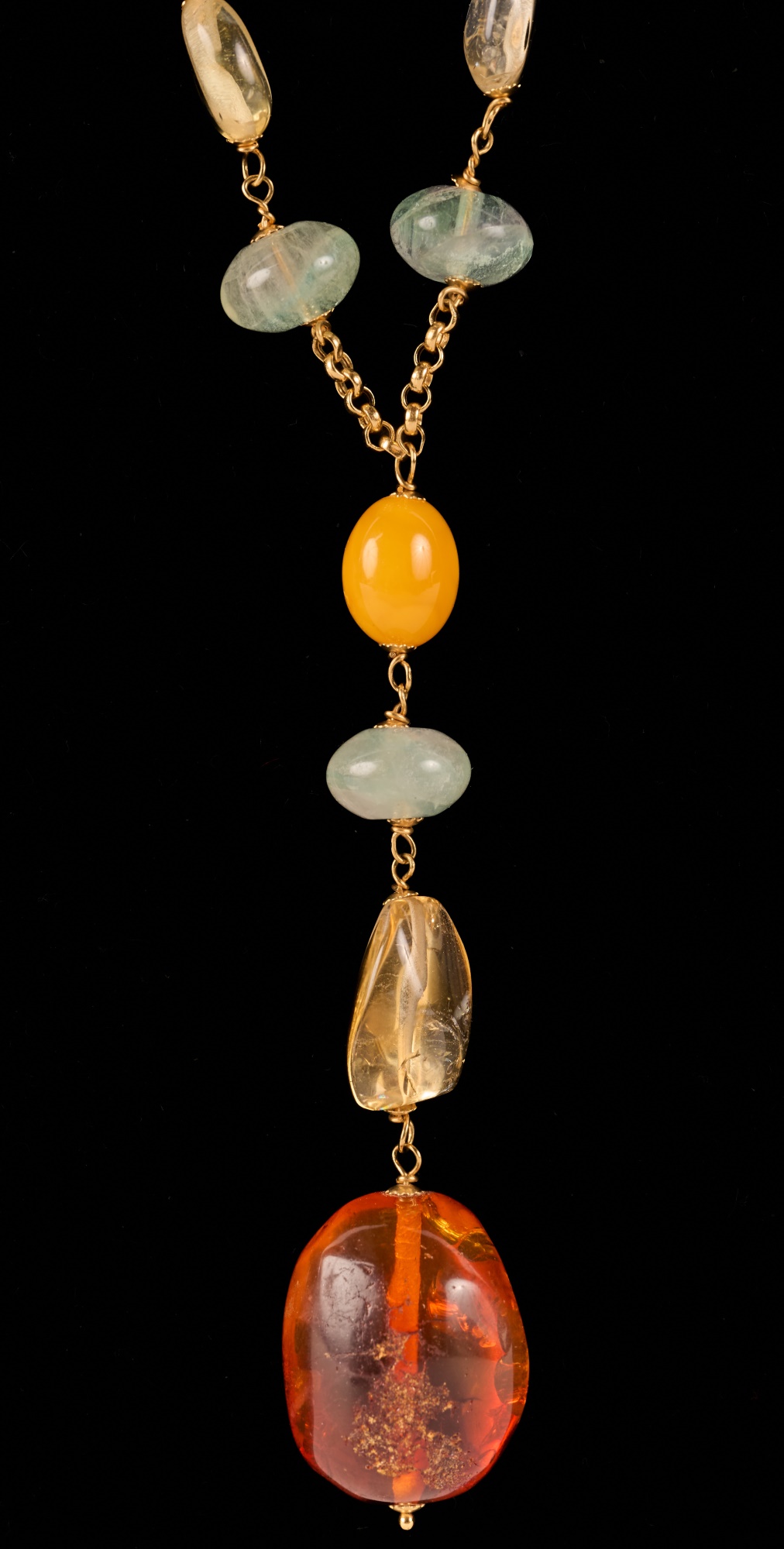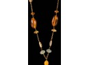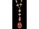 Strung with semi-precious stones including amber. 16 inches with (3) inch (4) stone pendant. 28.2 dwt. (not marked / tested) Condition: Good