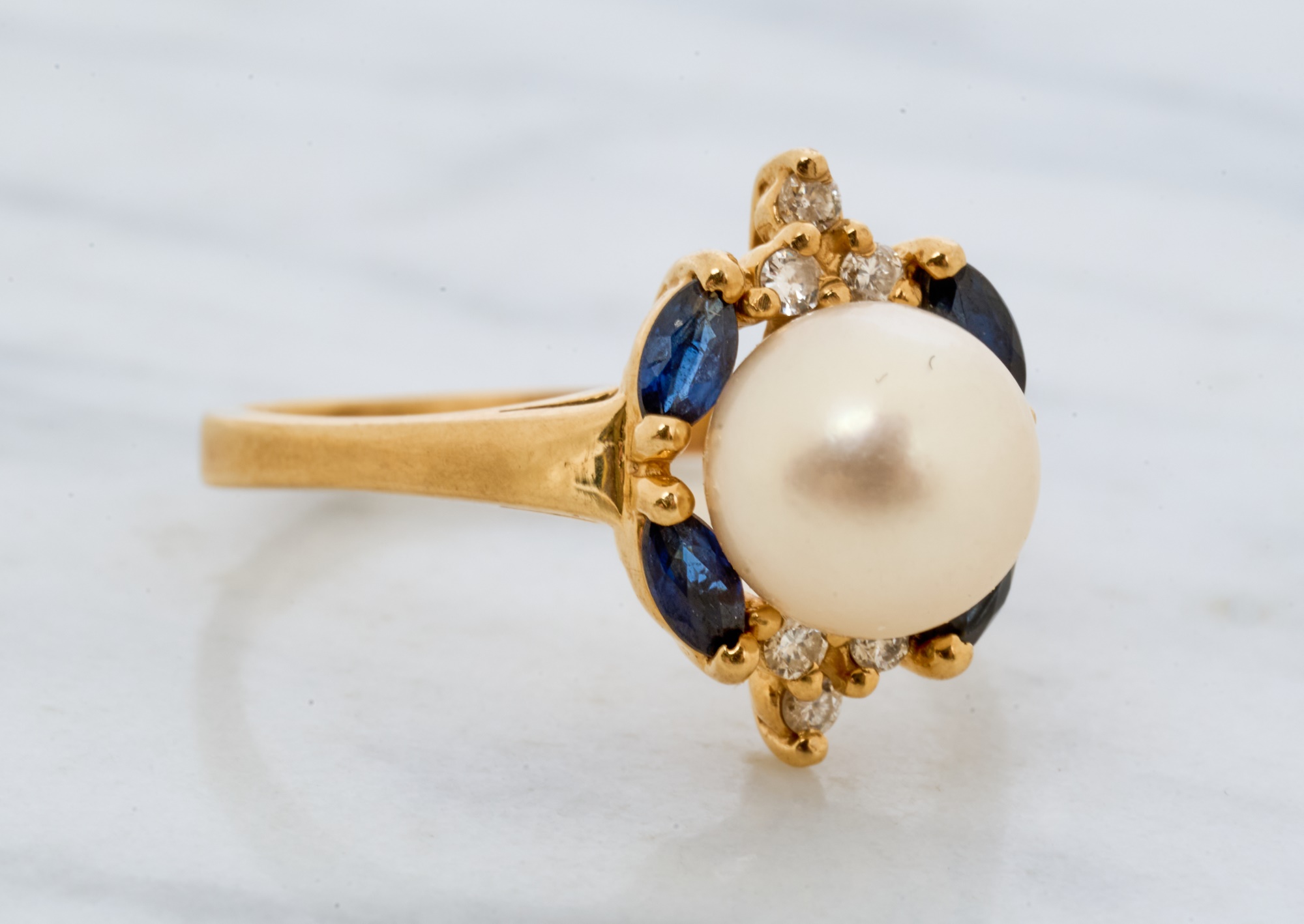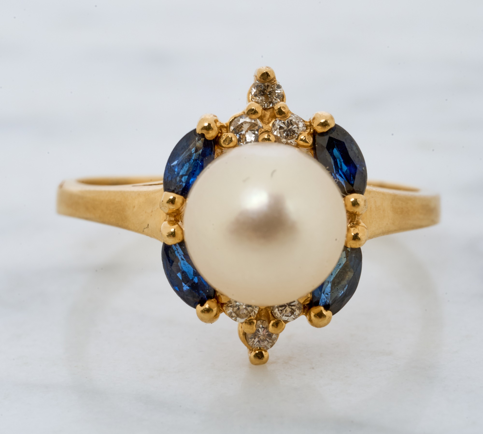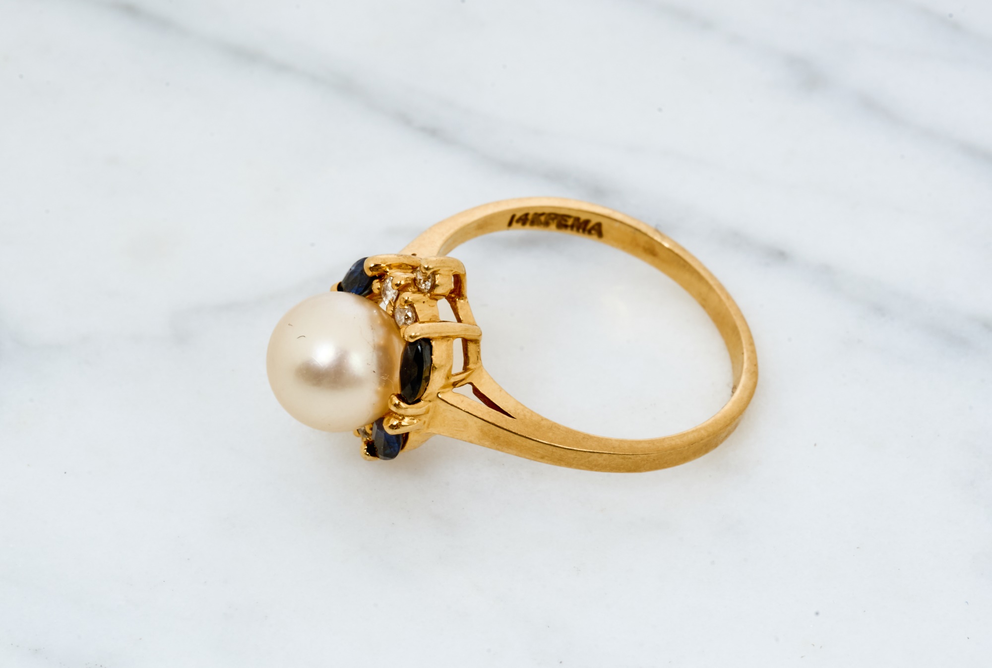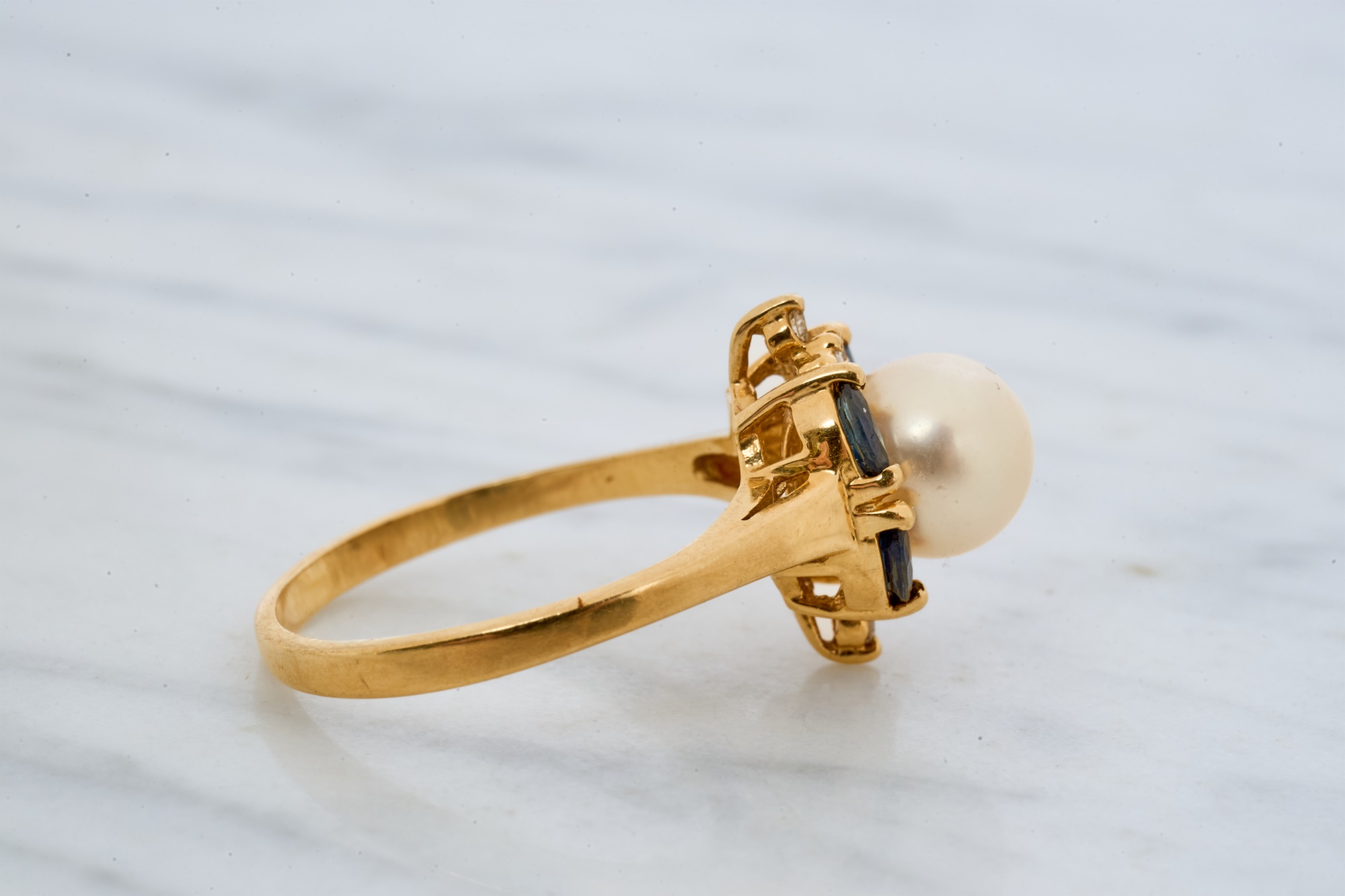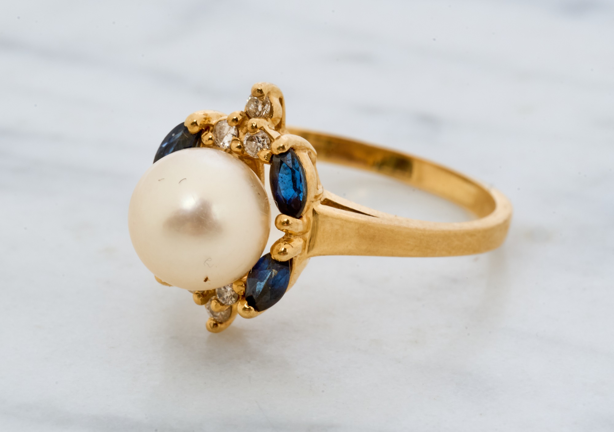 7mm pearl with 4mm sapphires and 1mm diamonds. Size 7.5. 2.2 dwt. Condition: Good