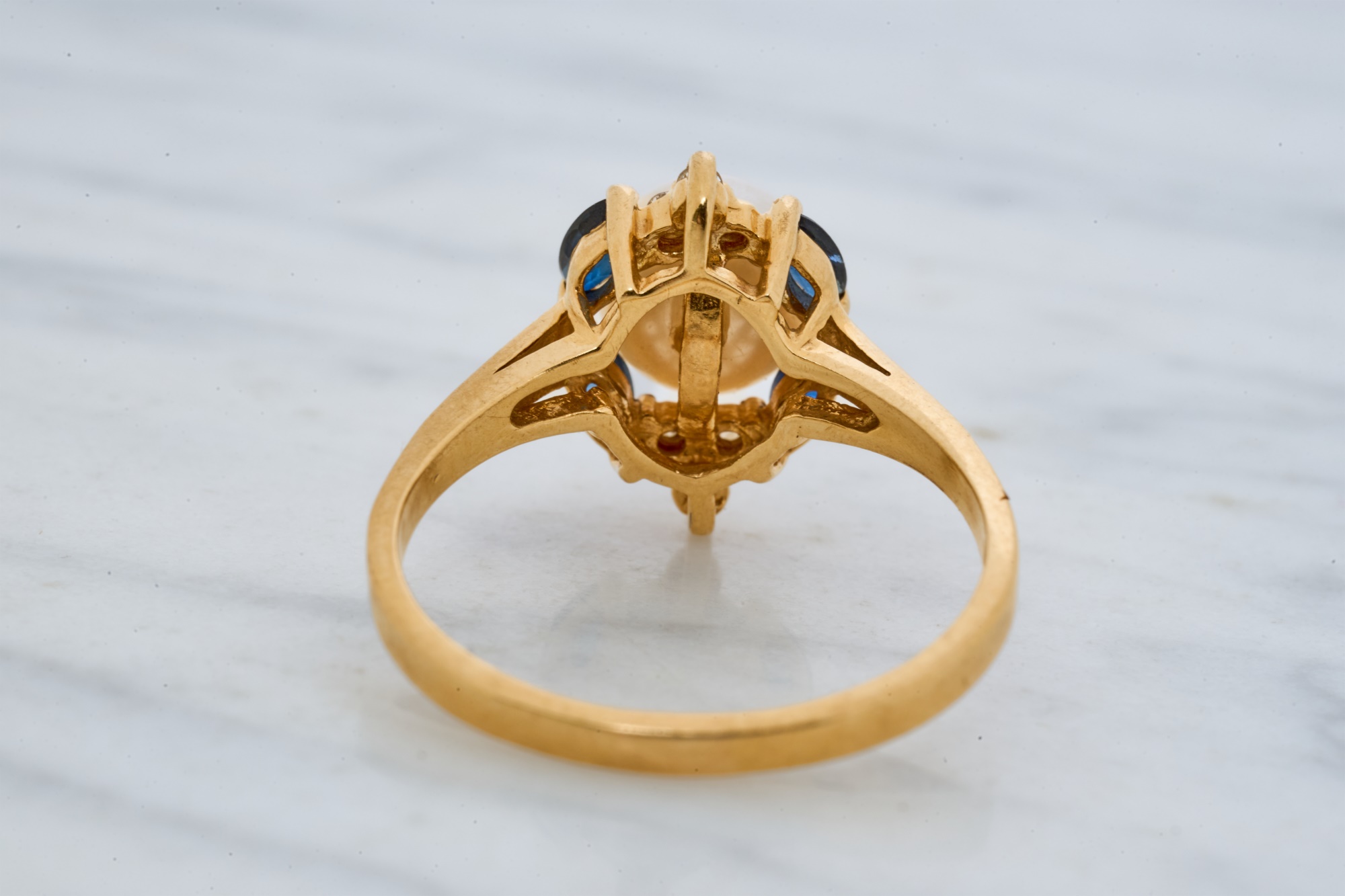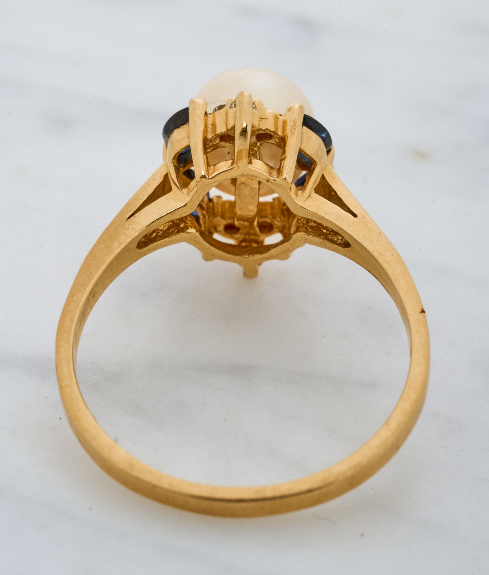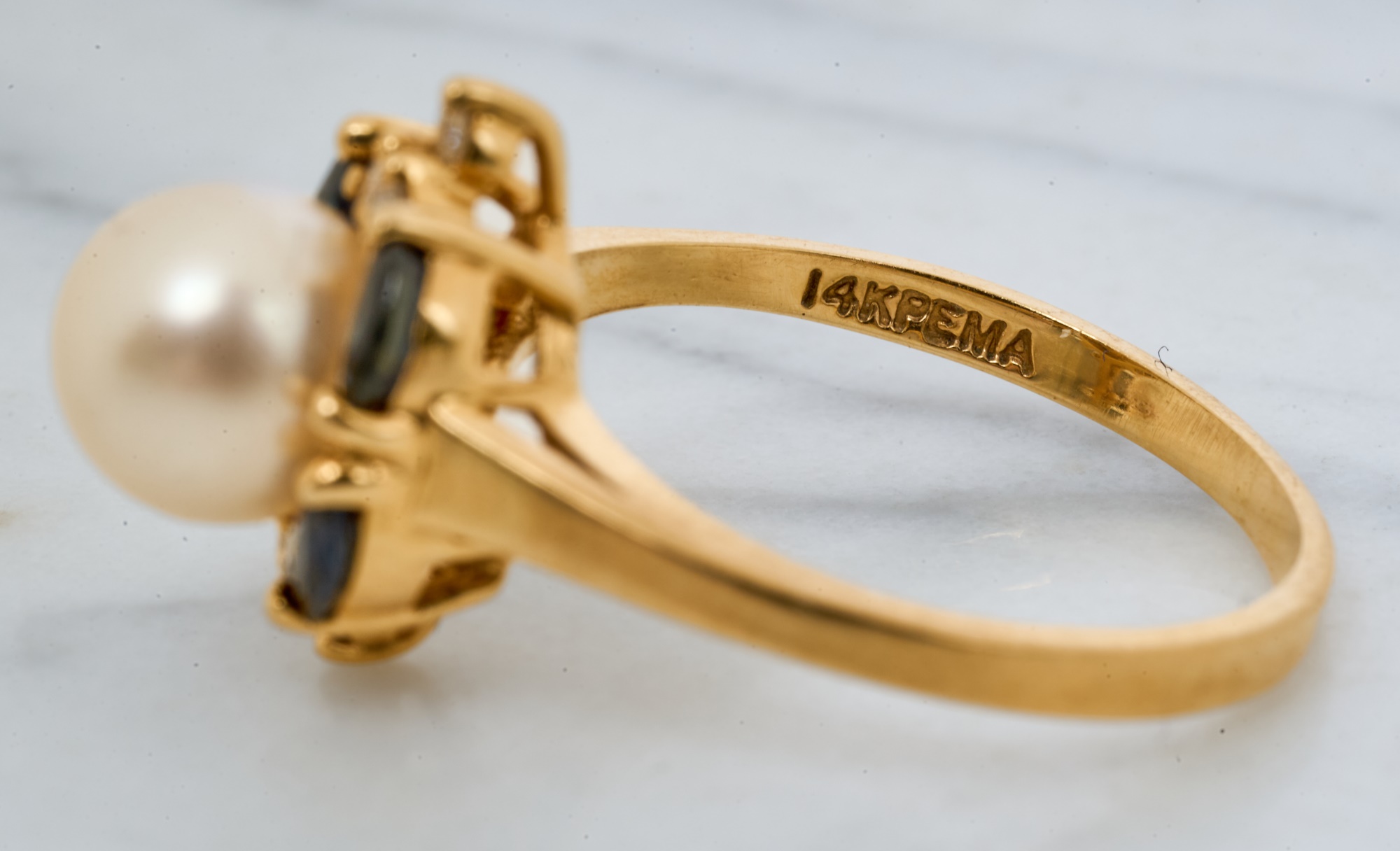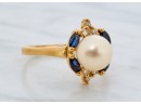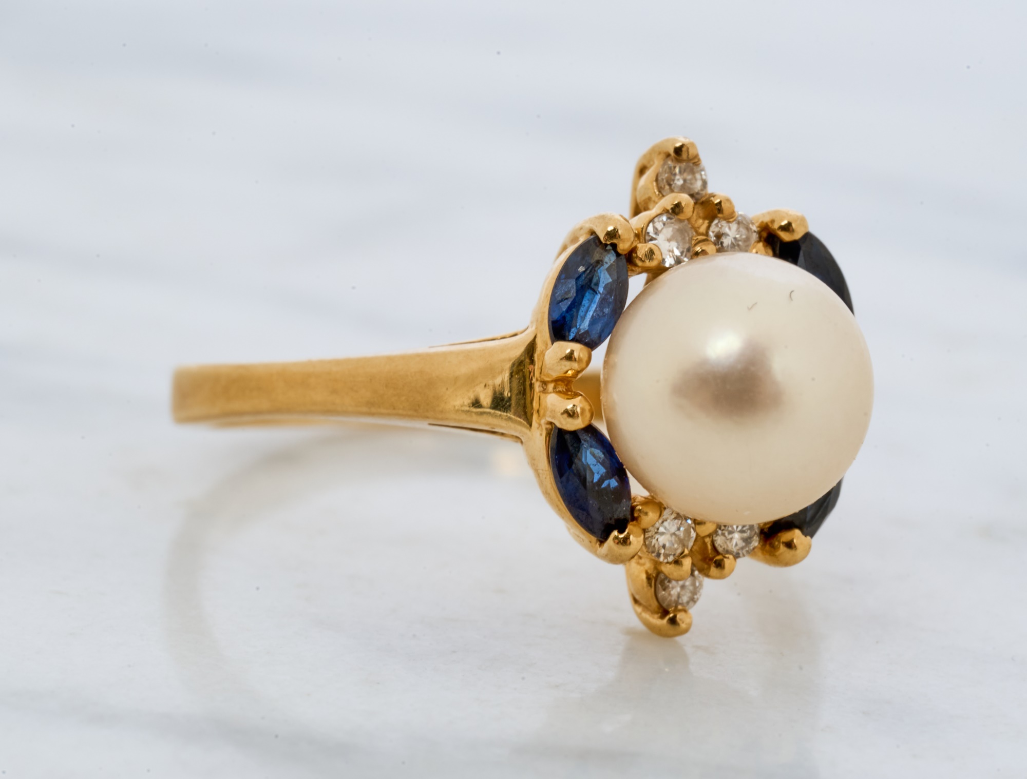 7mm pearl with 4mm sapphires and 1mm diamonds. Size 7.5. 2.2 dwt. Condition: Good