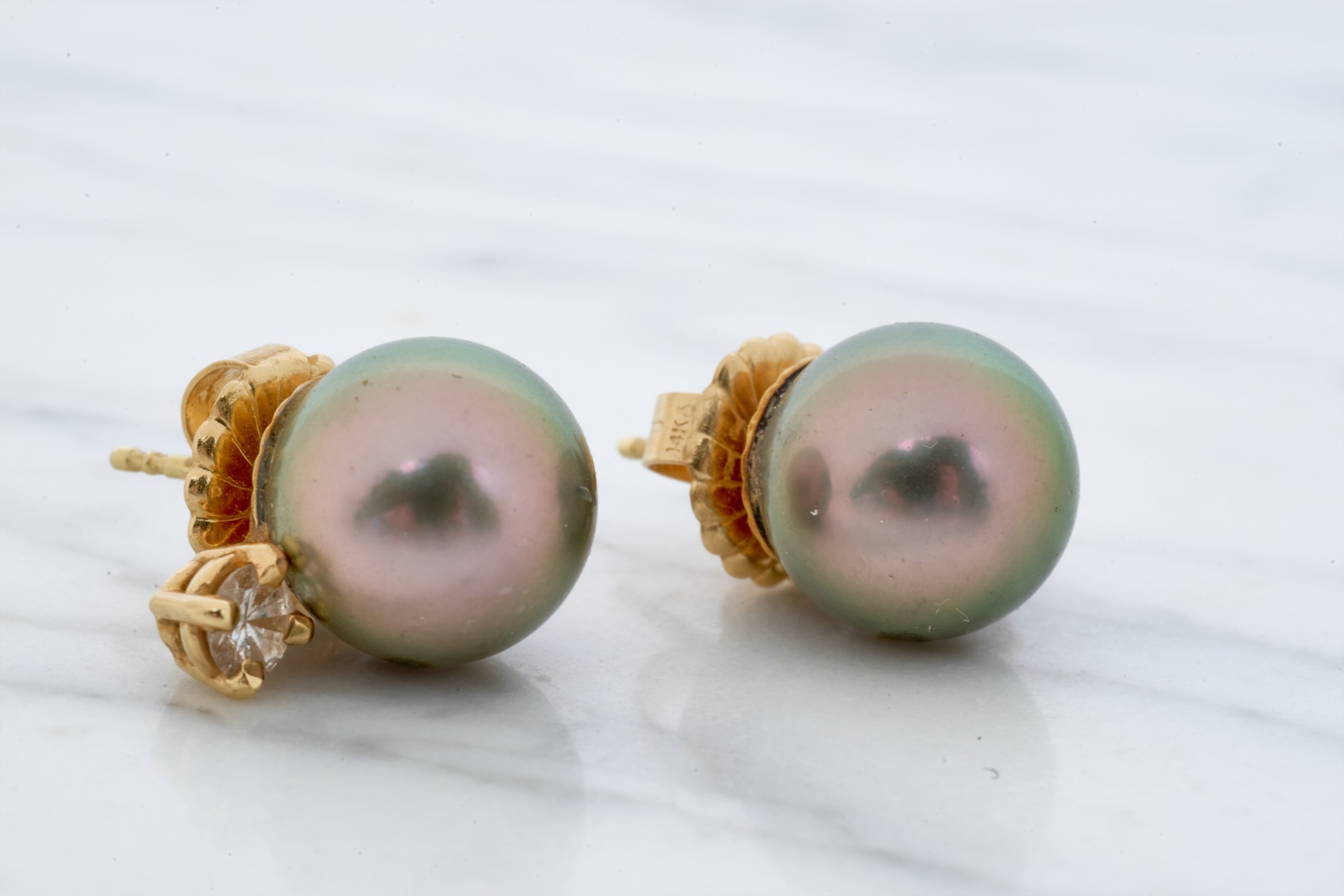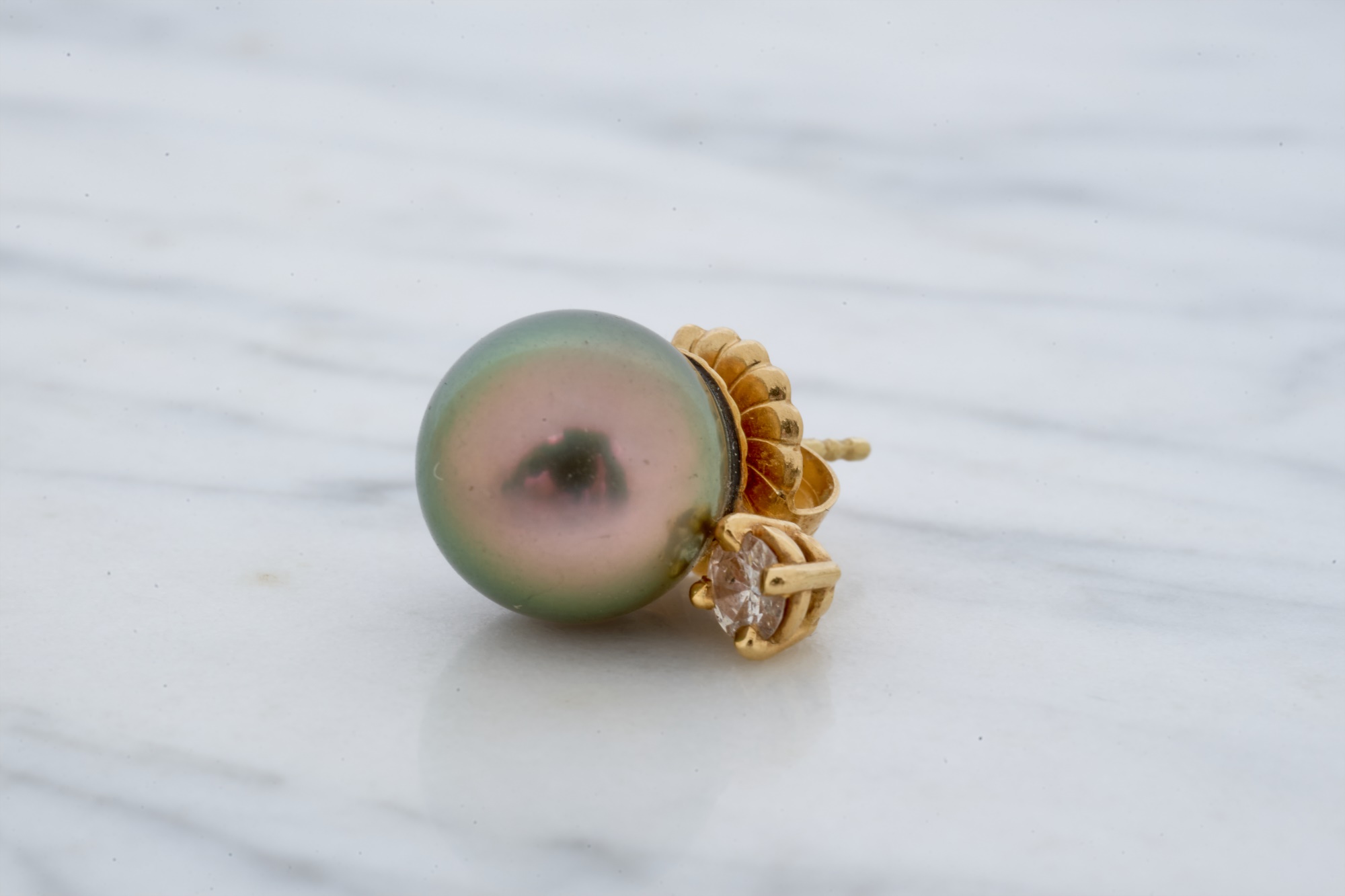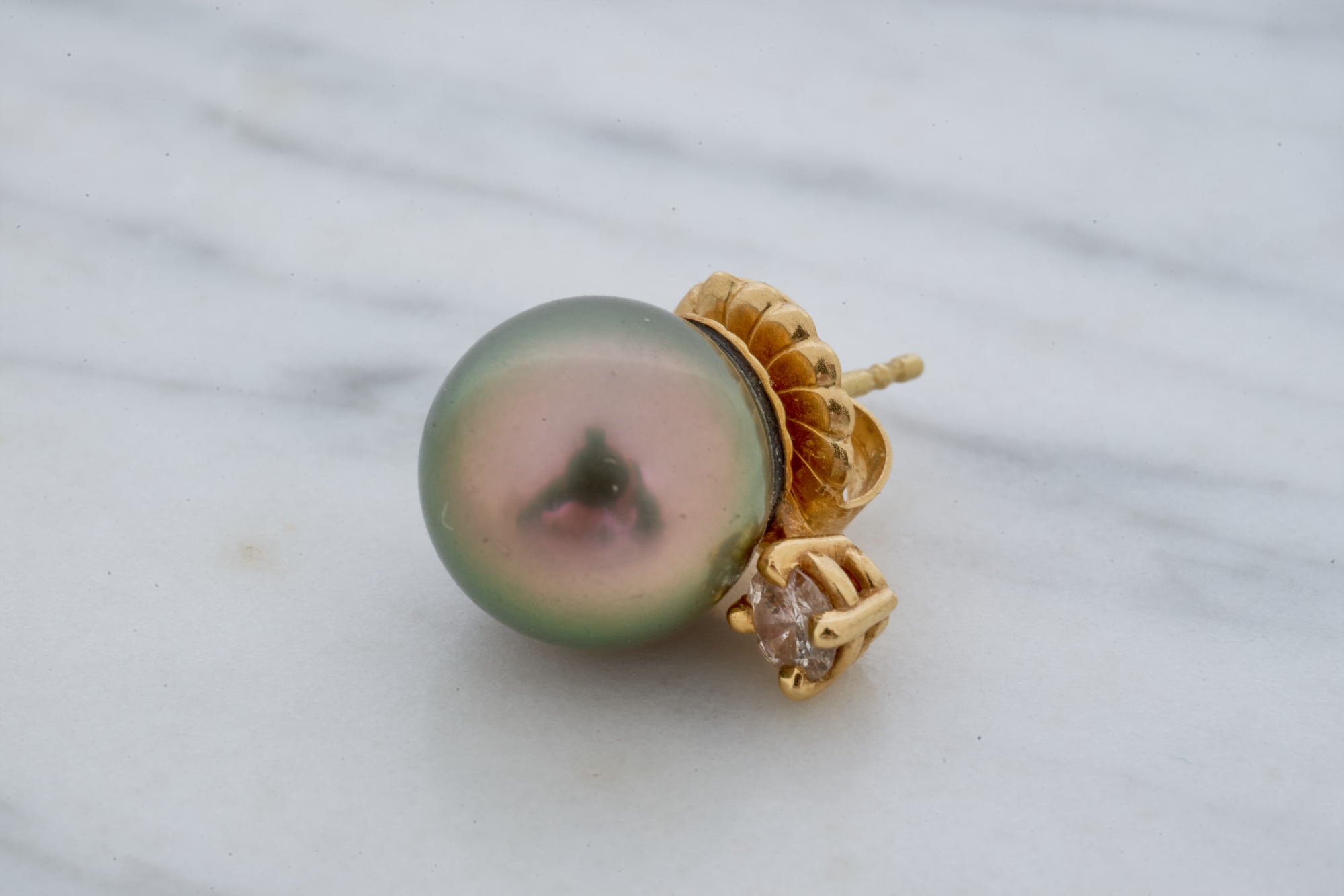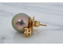 Set with 4mm satellite diamonds 11mm (diameter). Together with a pair of 9mm Mabe pearl earrings. 9.5 dwt (gross weight) Condition: Good