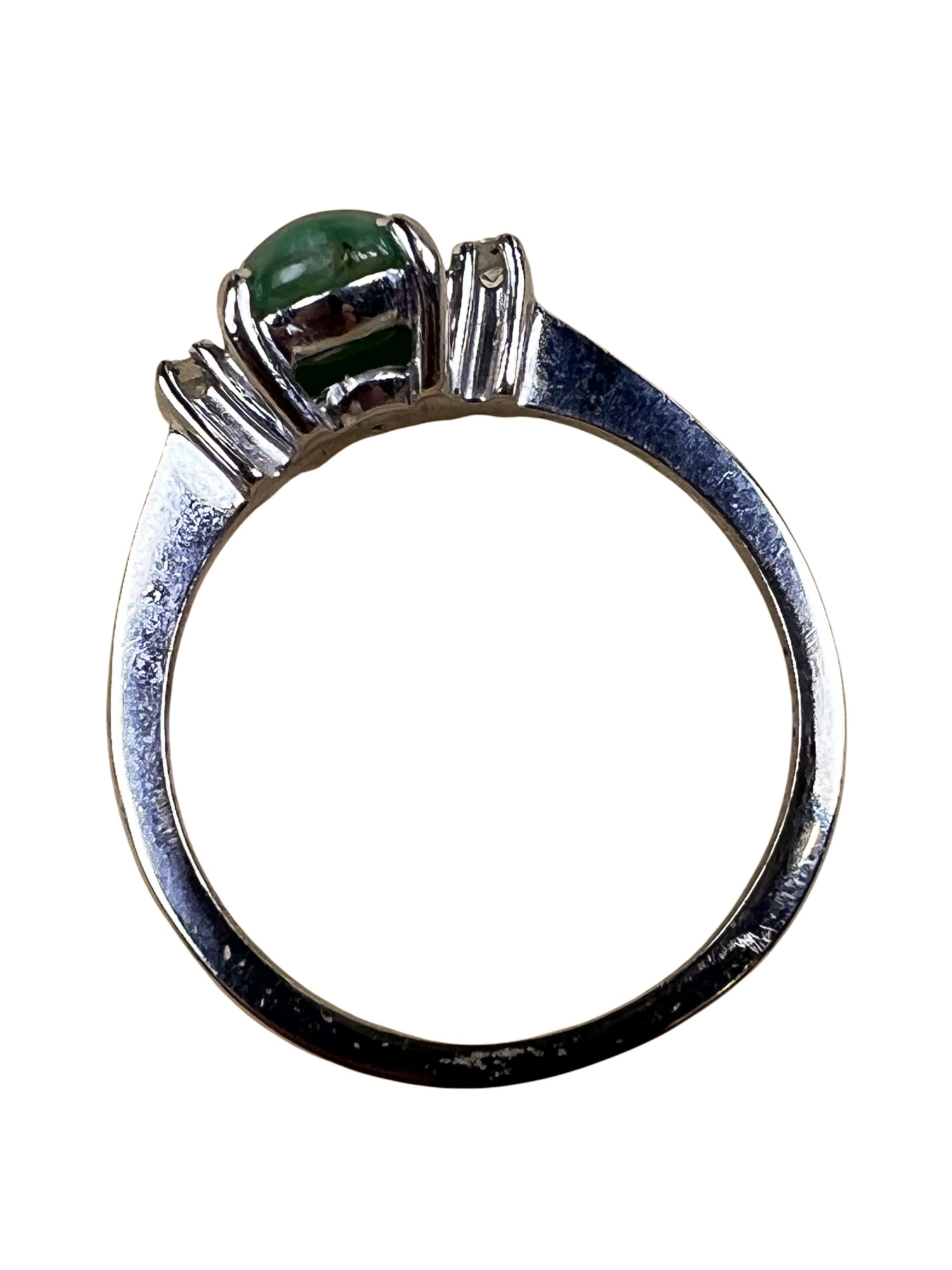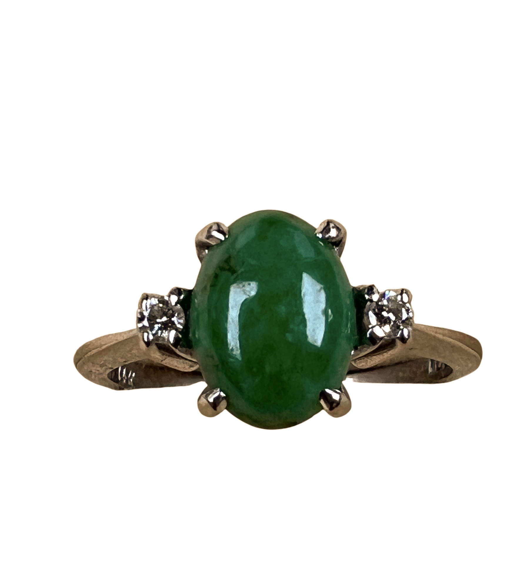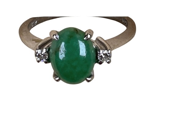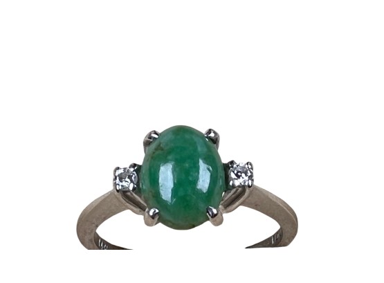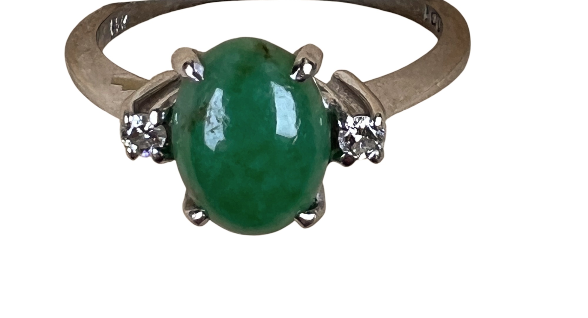 Marked 14K. Central jade flanked by (2) small diamonds. 1.9 DWT. Size 7 1/2. Condition: Good, used