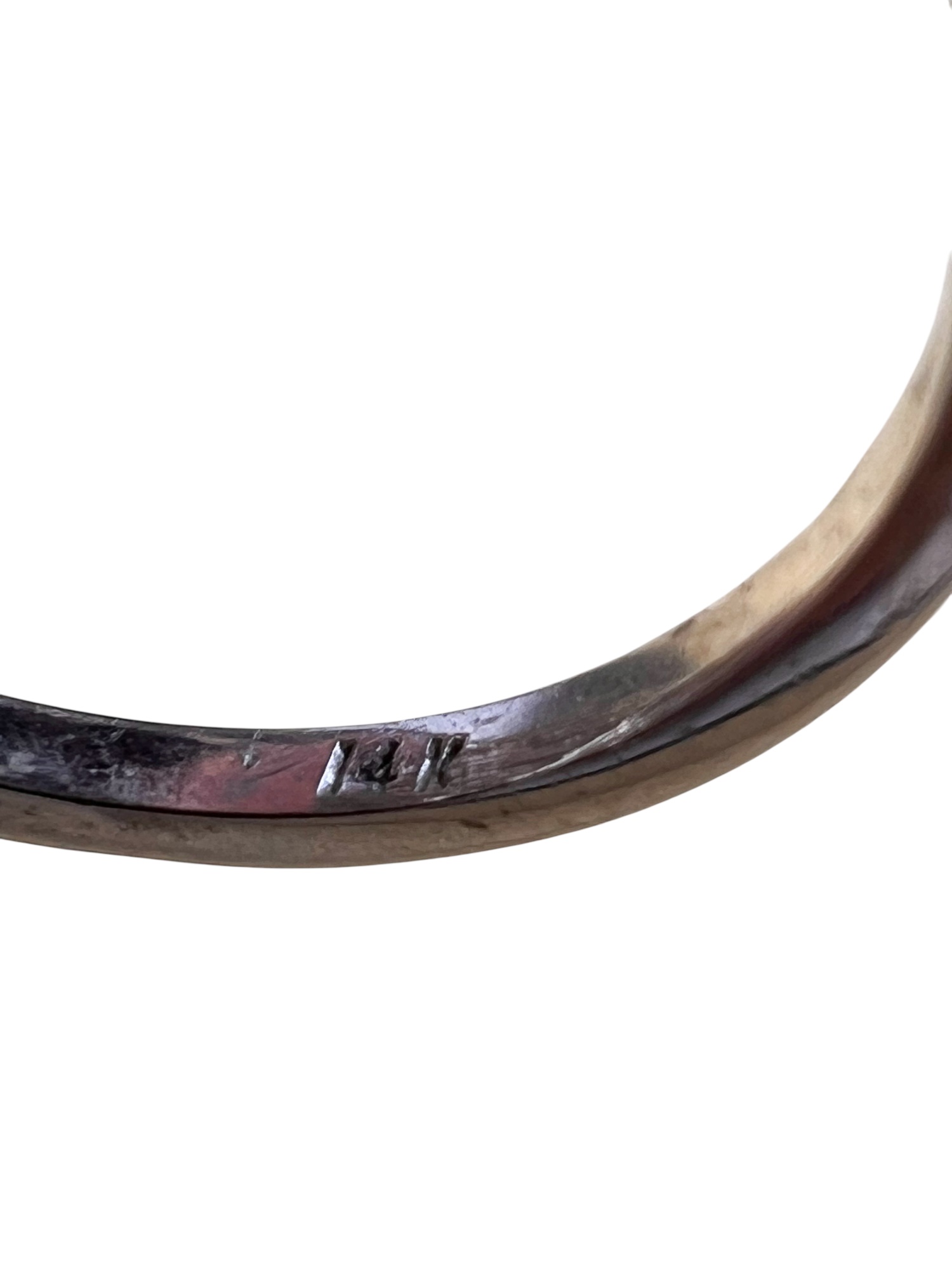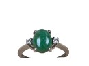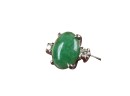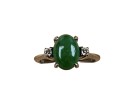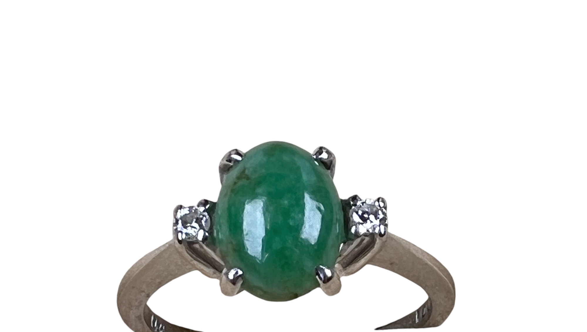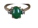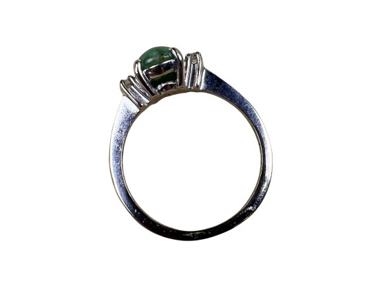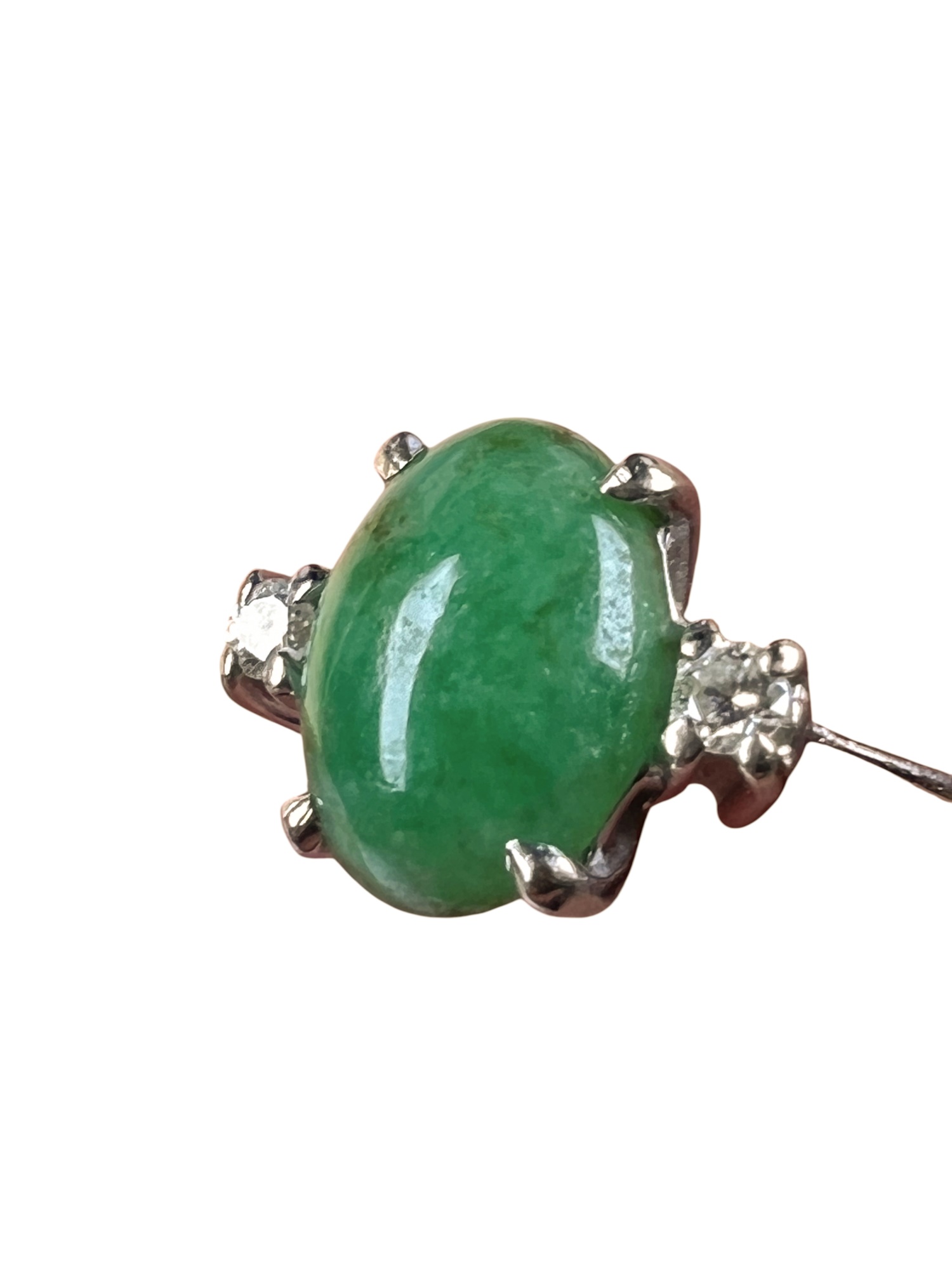 Marked 14K. Central jade flanked by (2) small diamonds. 1.9 DWT. Size 7 1/2. Condition: Good, used
