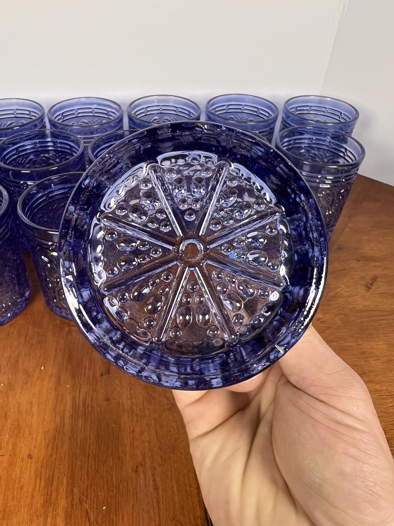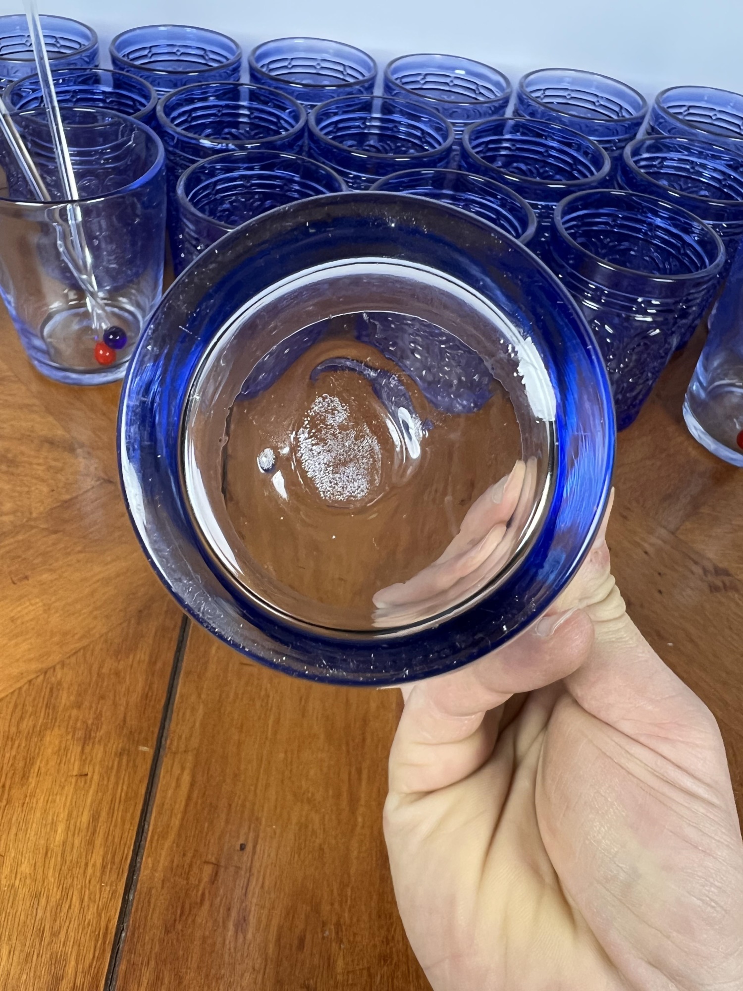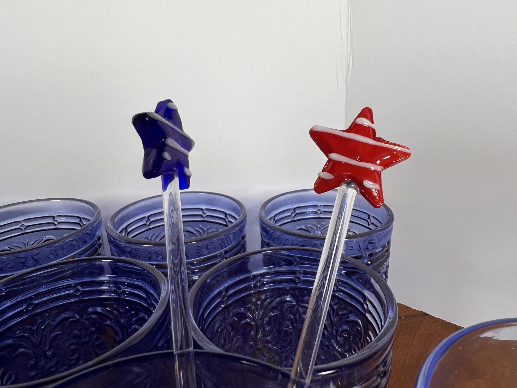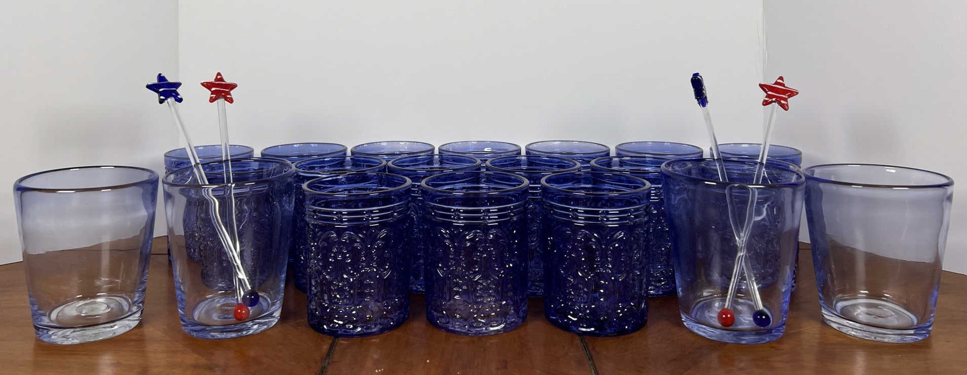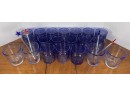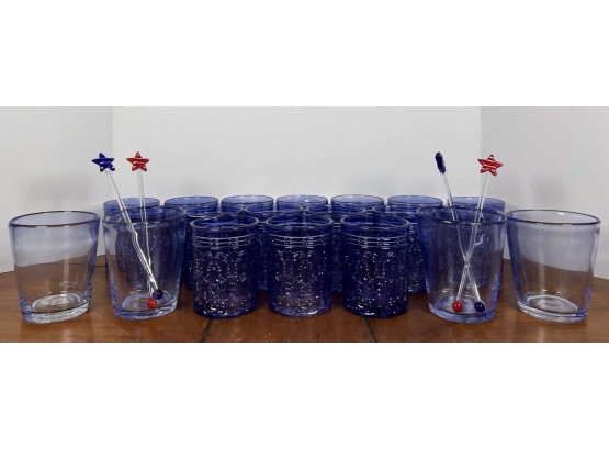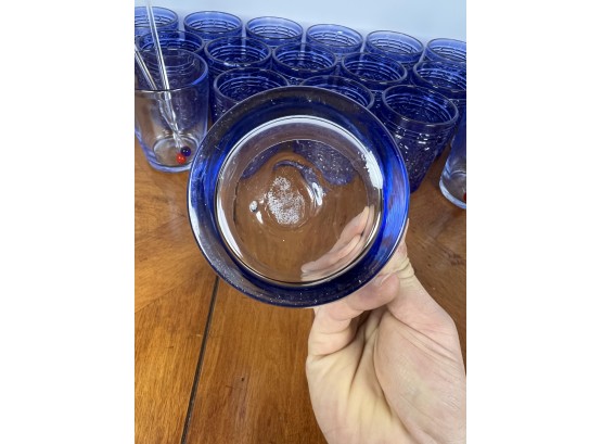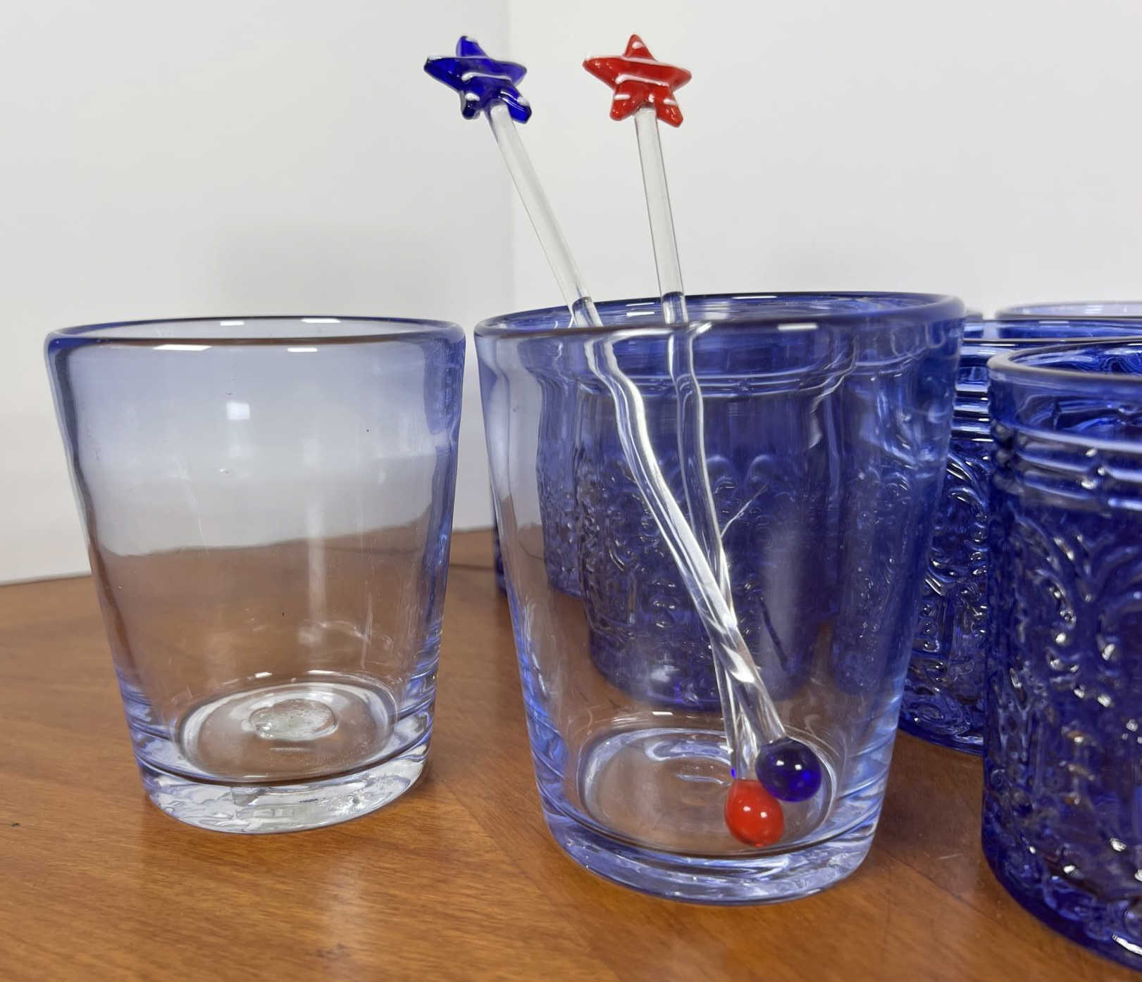 Along with (4) blue tinted tumblers and (4) glass swizzle sticks. Tallest glasses 4 1/4" Condition: Good Temp No 6428