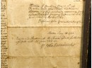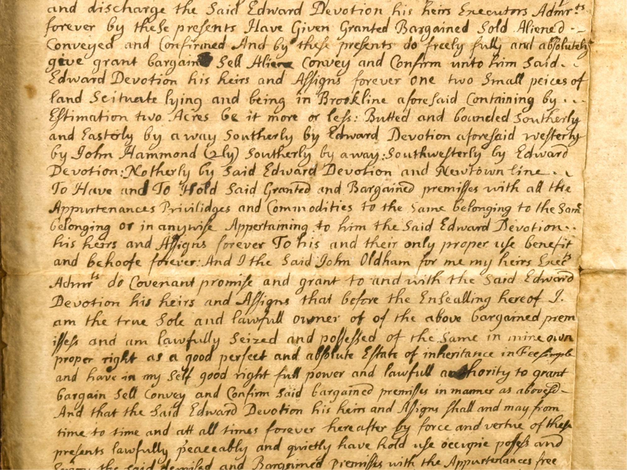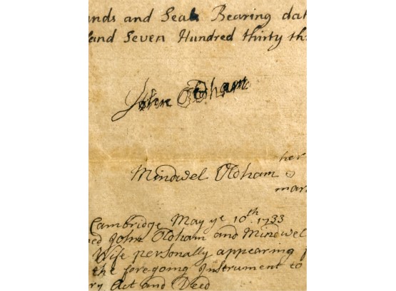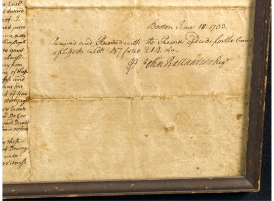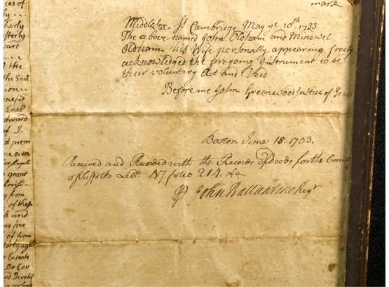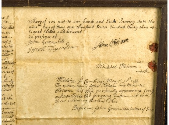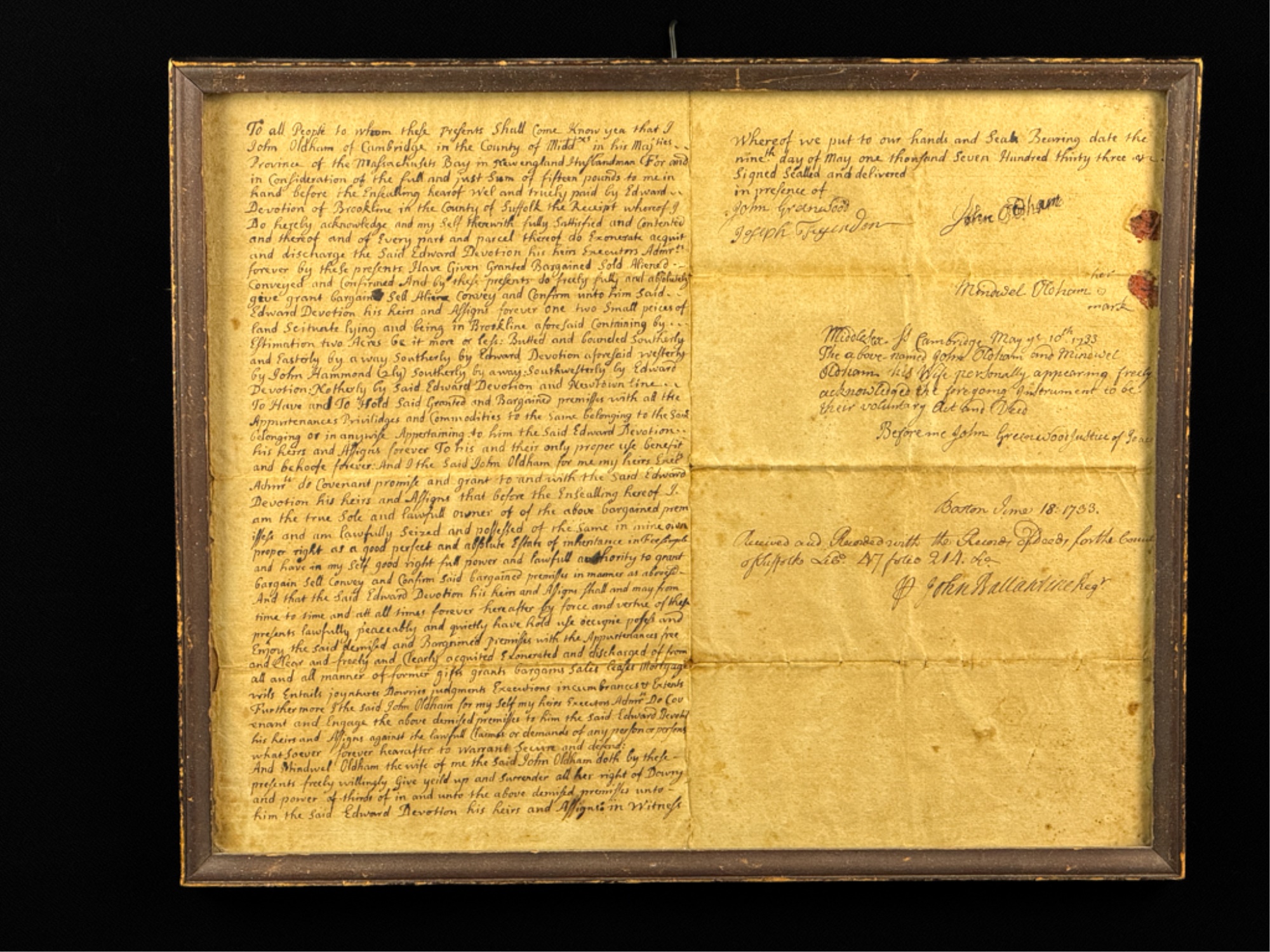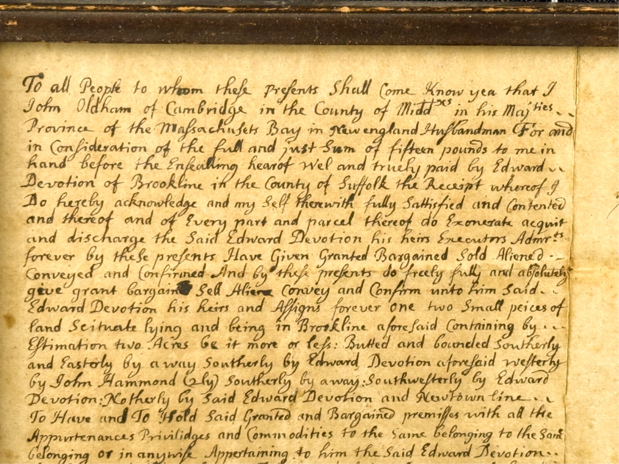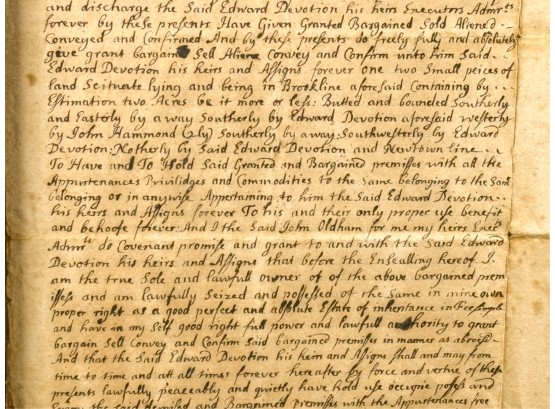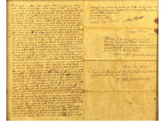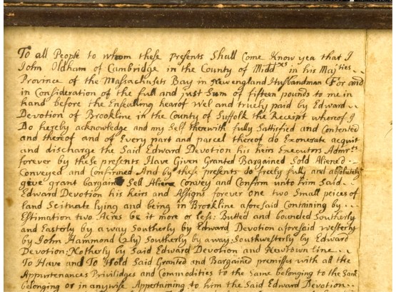 John Oldham of Cambridge agrees to sell "two small pieces of land" in Brookline to Edward Devotion for 15 pounds. Framed. 13 x 16 inches. Condition: Good, age expected wear, creases, etc.