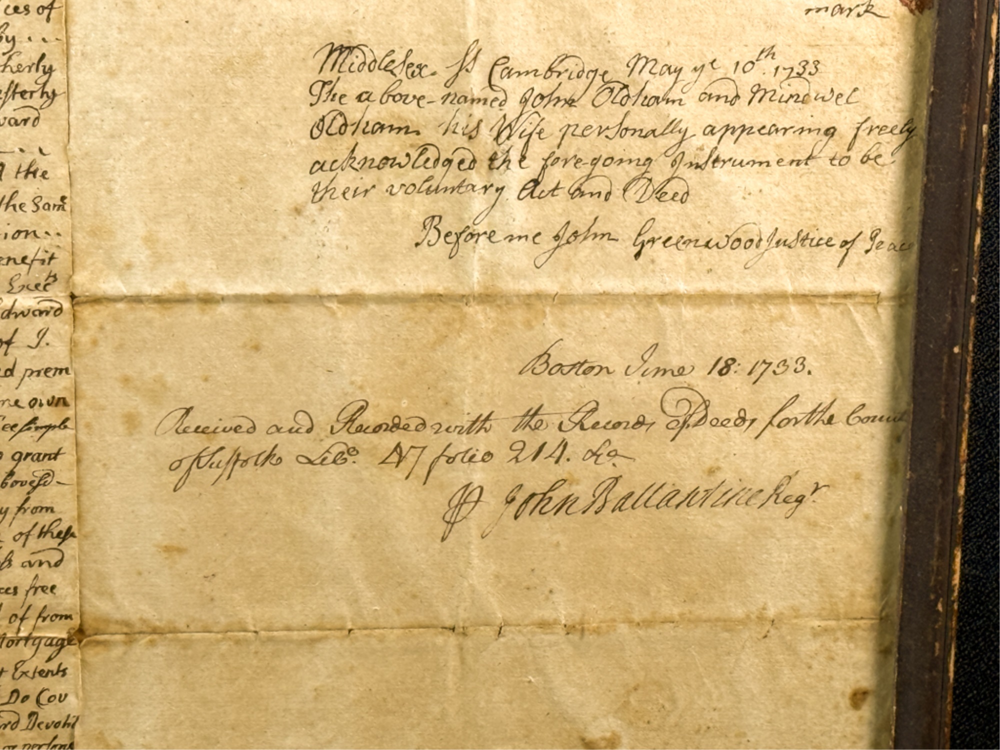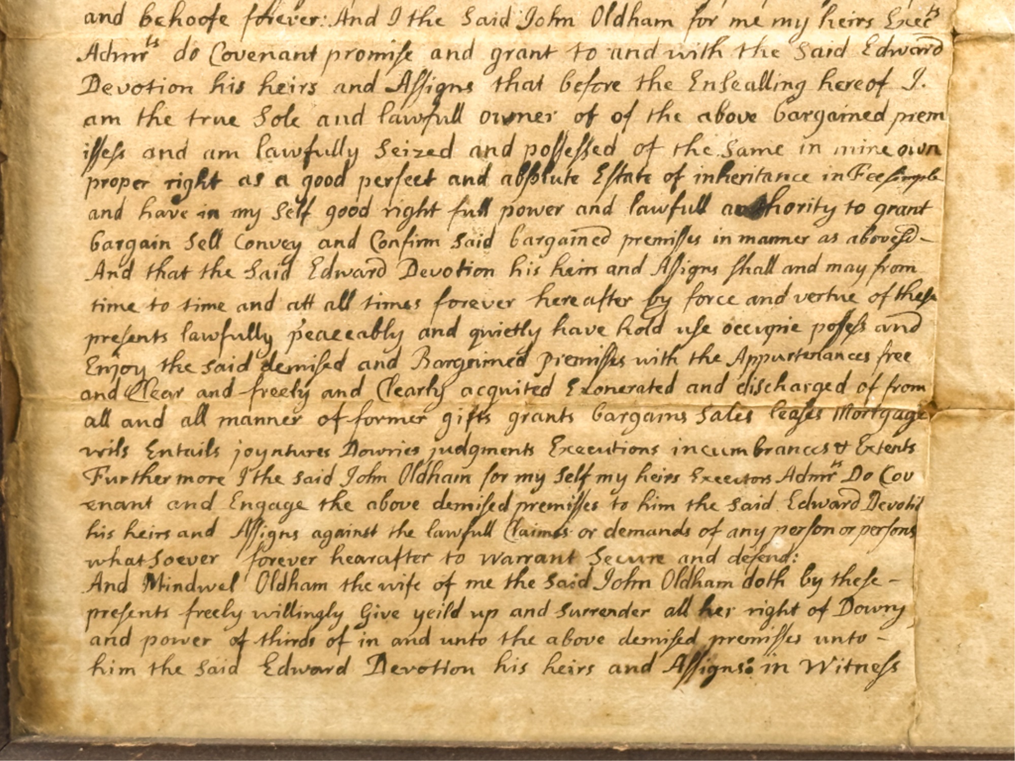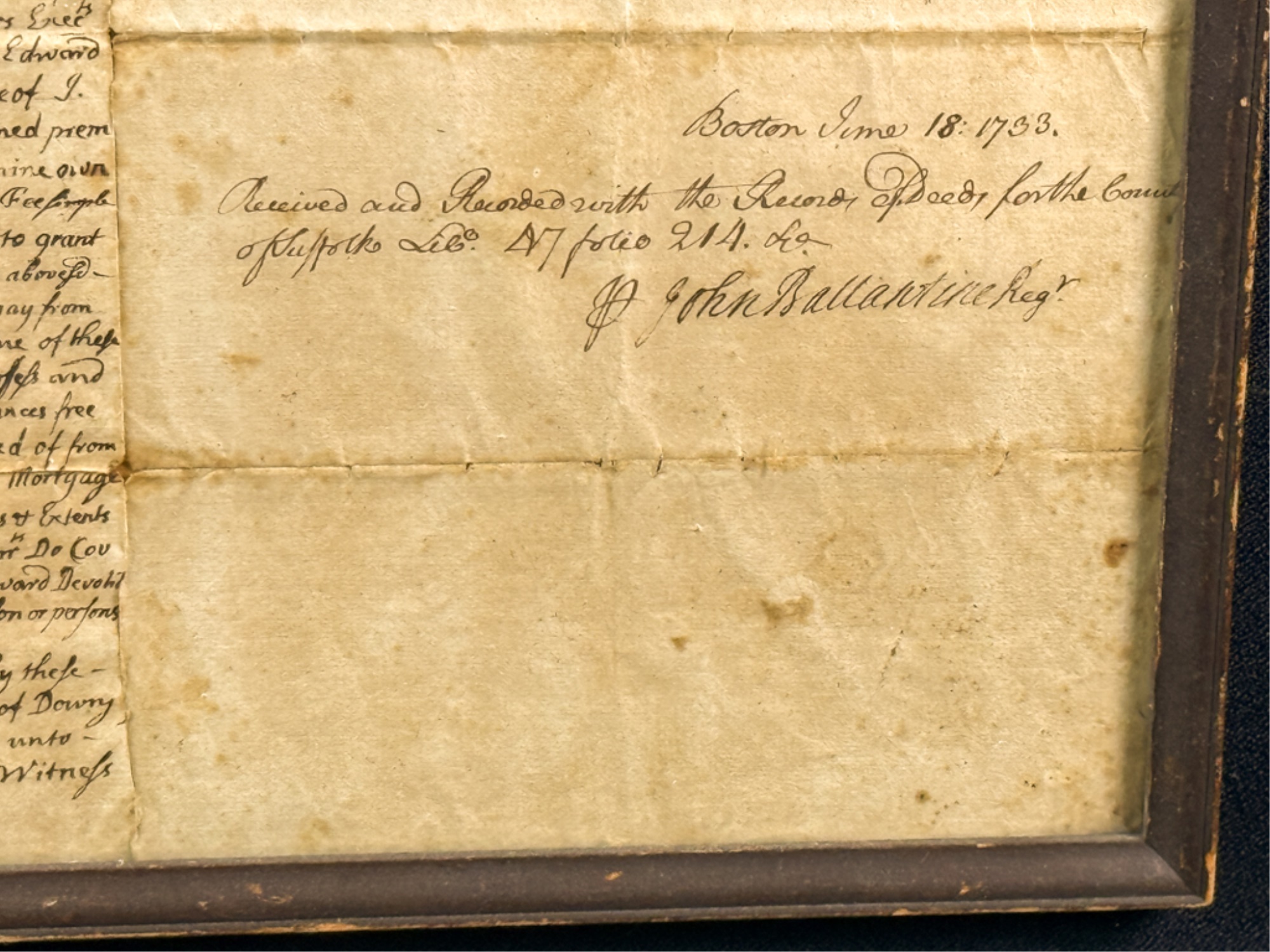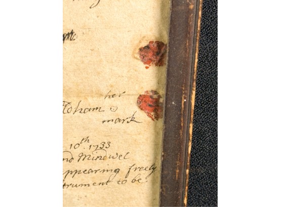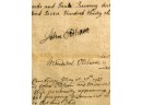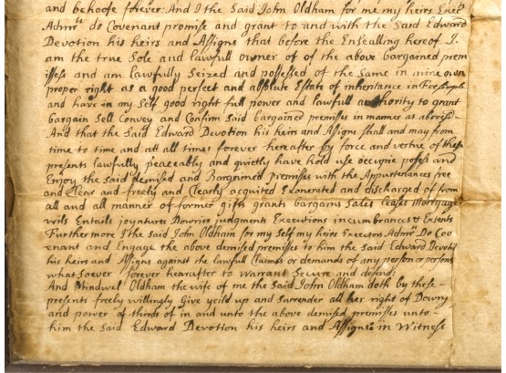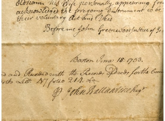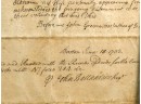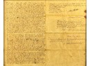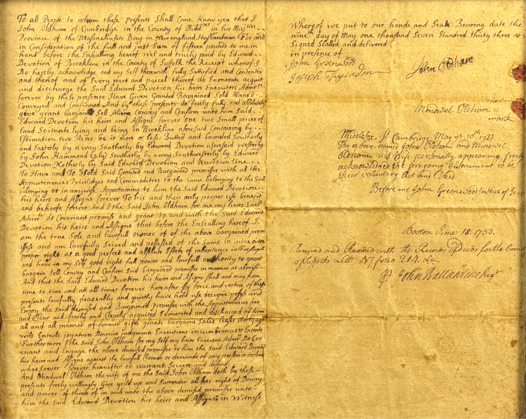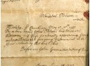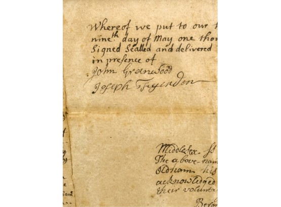 John Oldham of Cambridge agrees to sell "two small pieces of land" in Brookline to Edward Devotion for 15 pounds. Framed. 13 x 16 inches. Condition: Good, age expected wear, creases, etc.