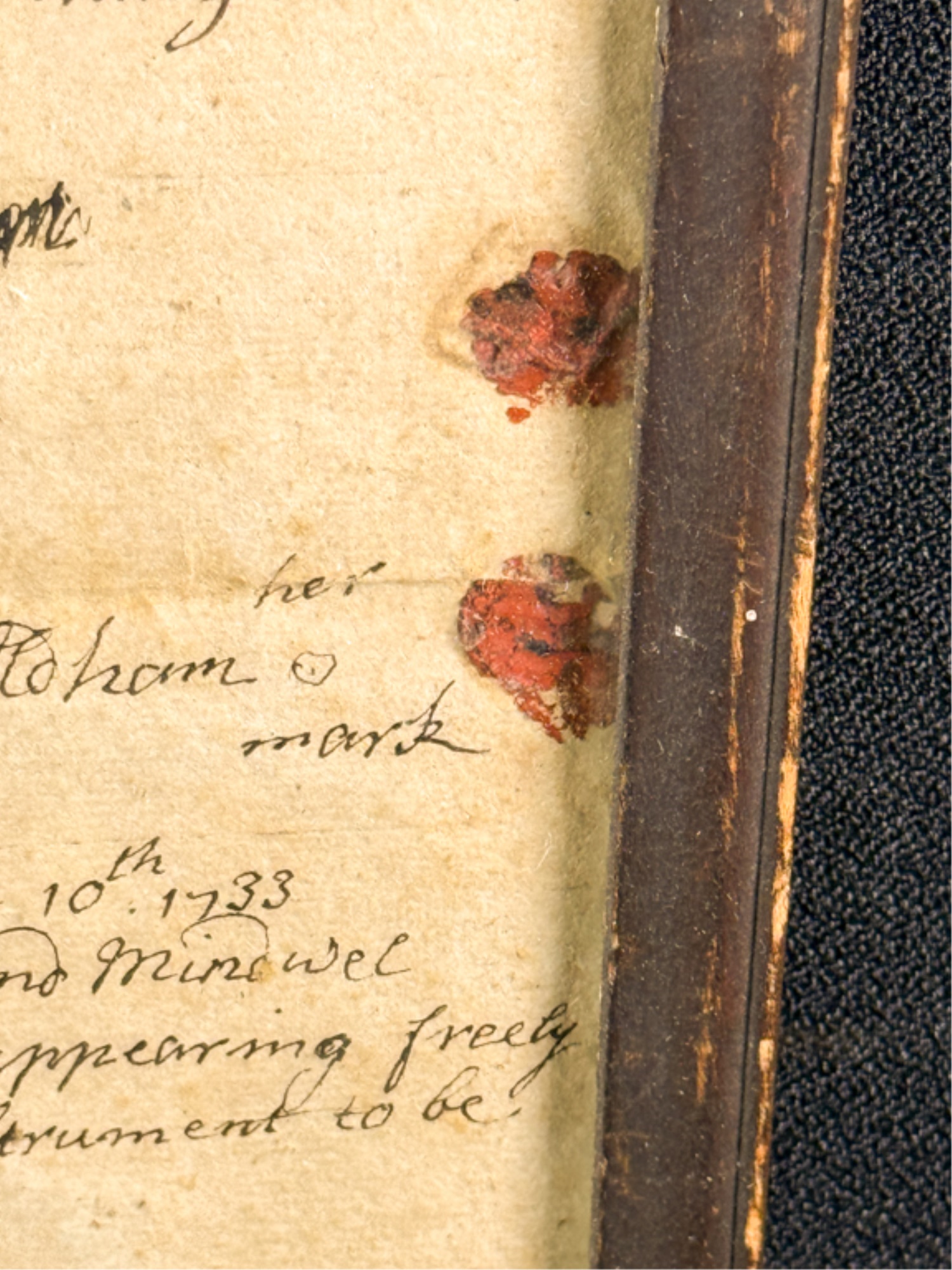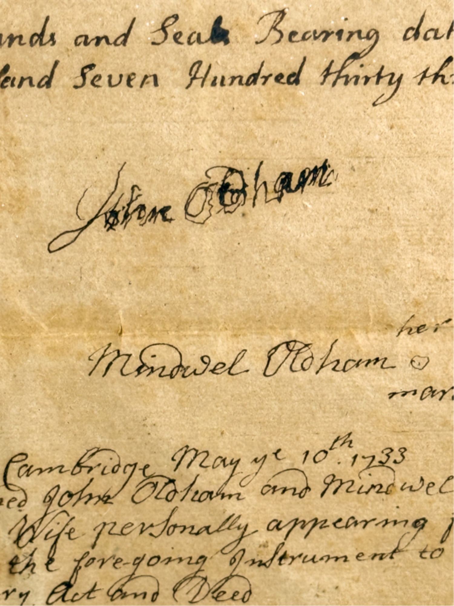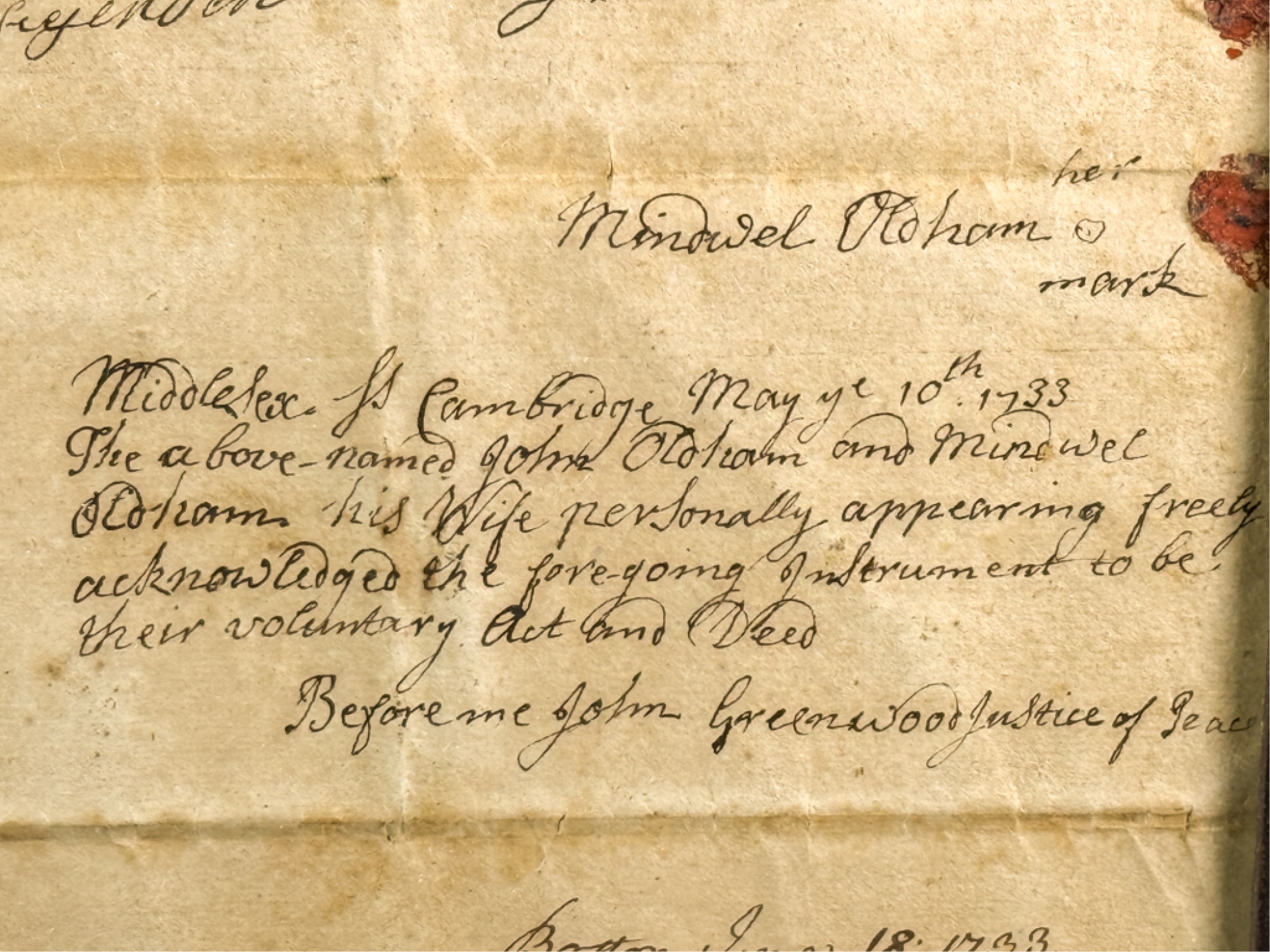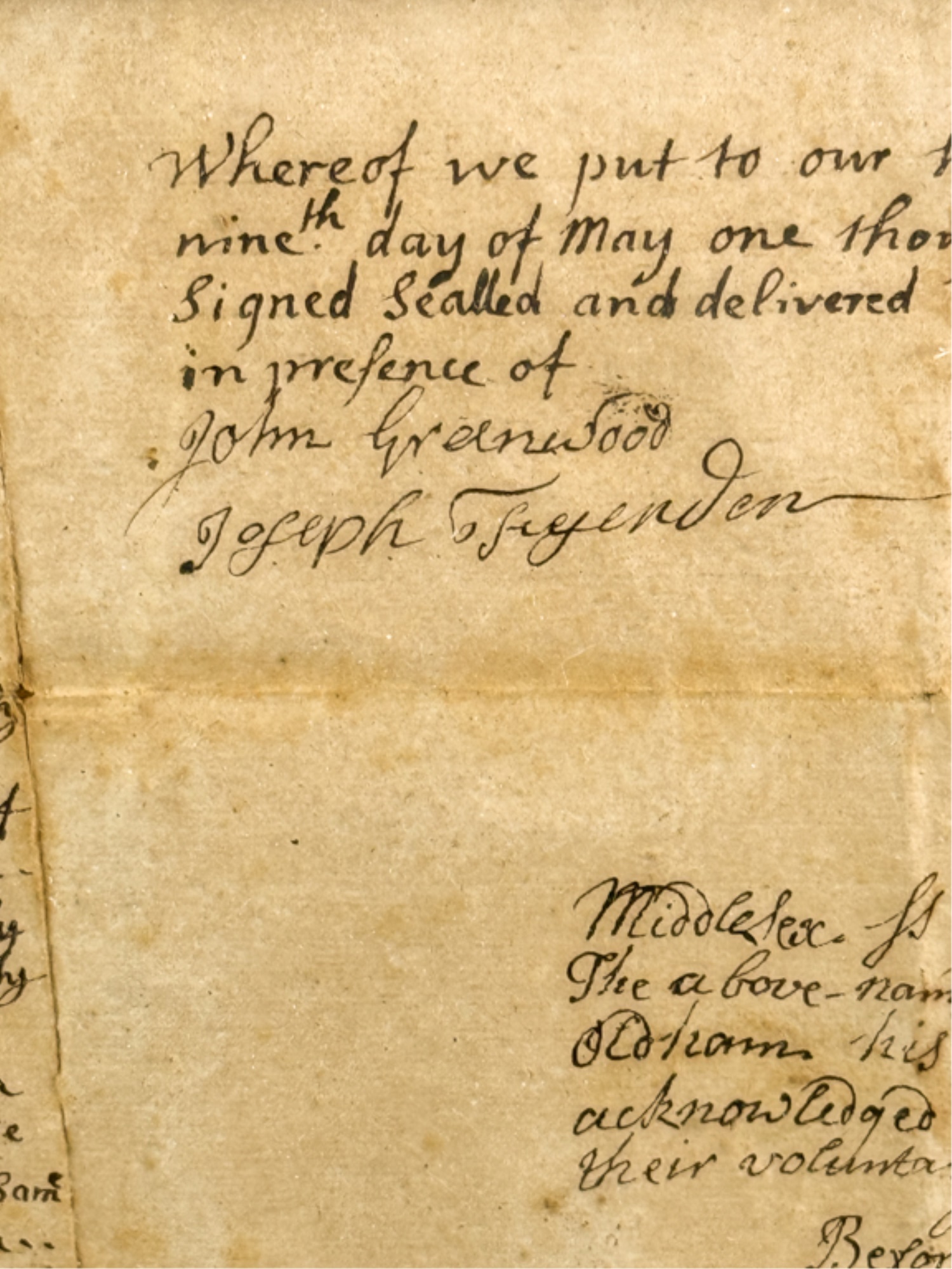 John Oldham of Cambridge agrees to sell "two small pieces of land" in Brookline to Edward Devotion for 15 pounds. Framed. 13 x 16 inches. Condition: Good, age expected wear, creases, etc.