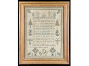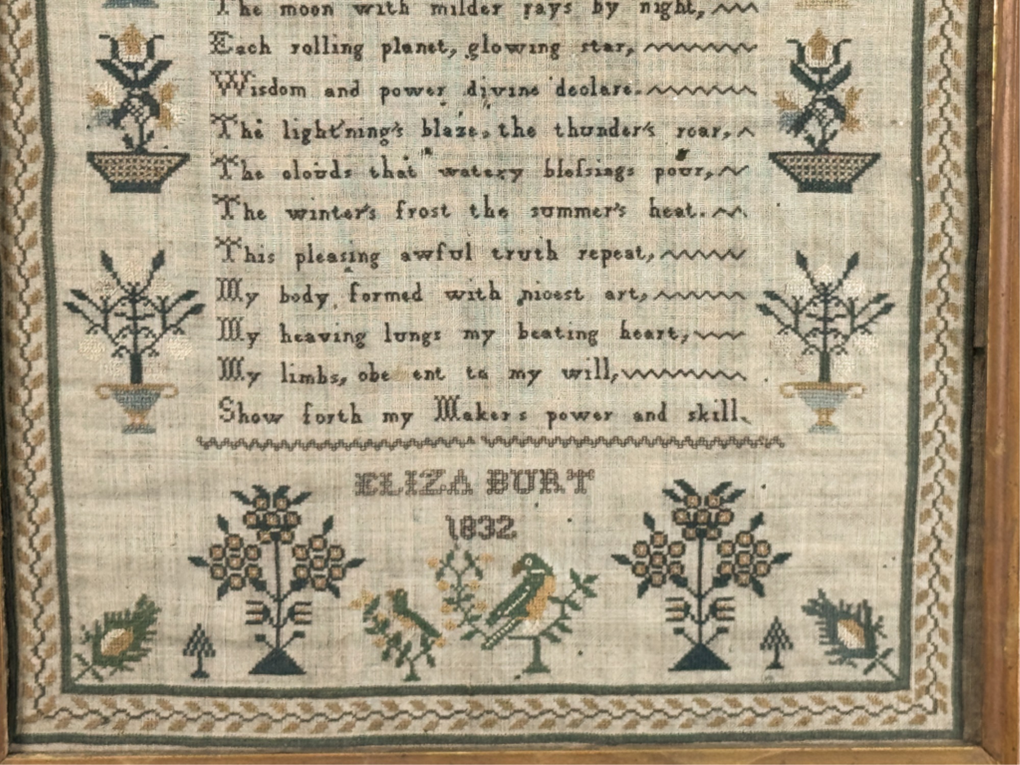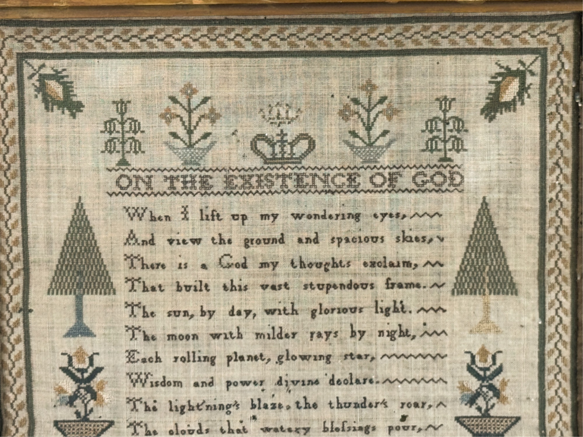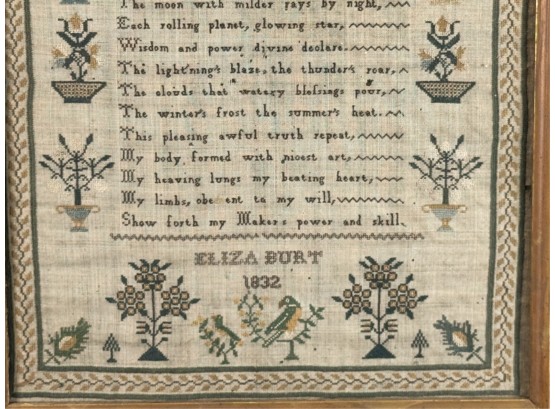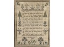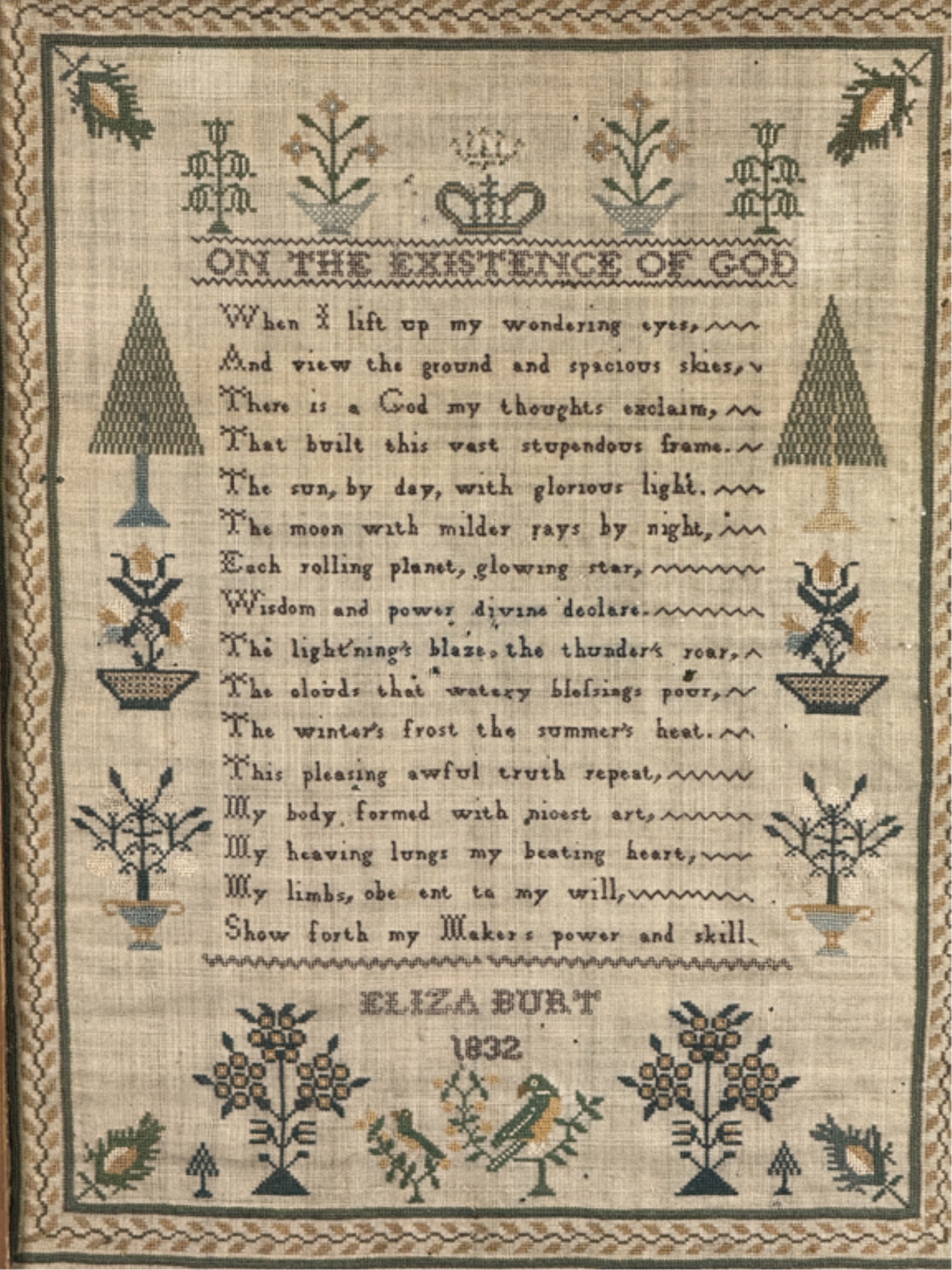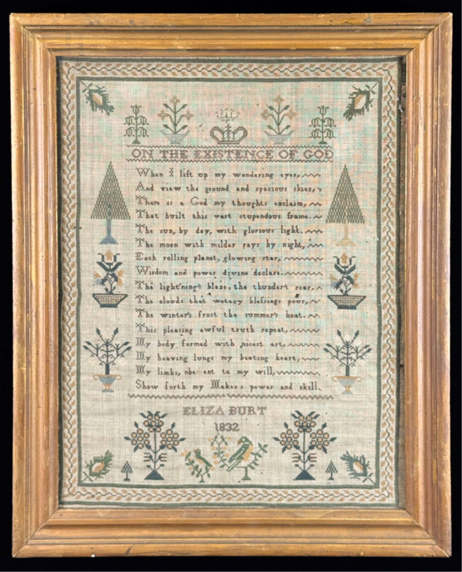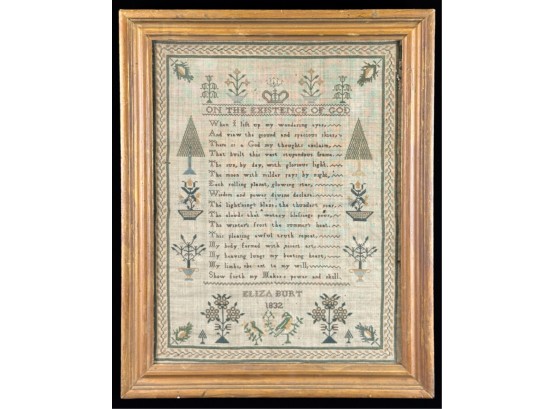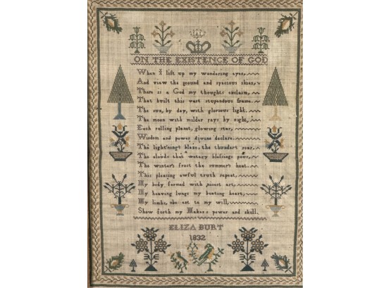 "On the Existence of God". Decorated with pine trees a song bird and floral arrangements. With repeating border. Framed. 18 1/2 x 15 inches. Condition: Age expected wear.