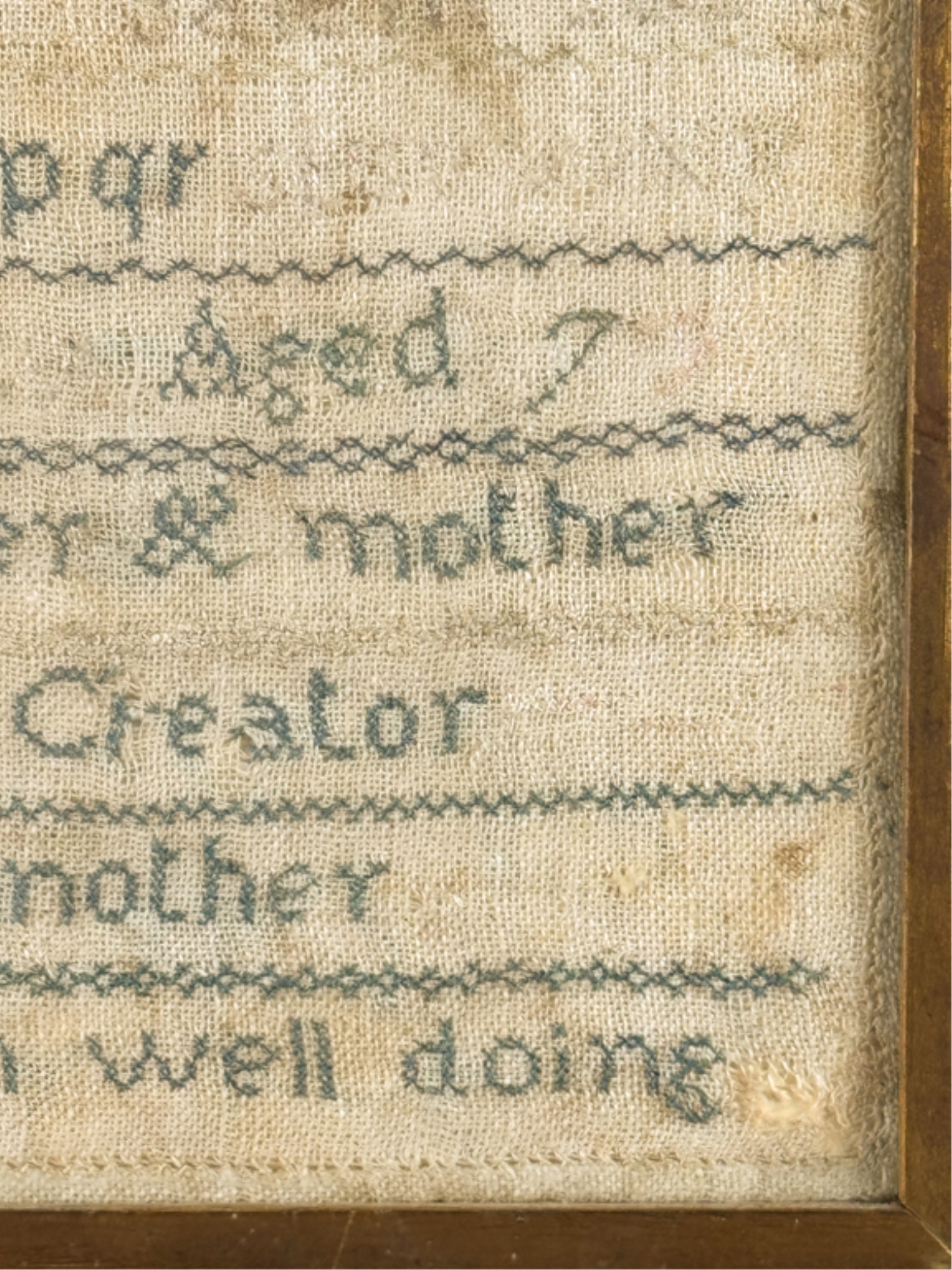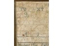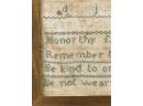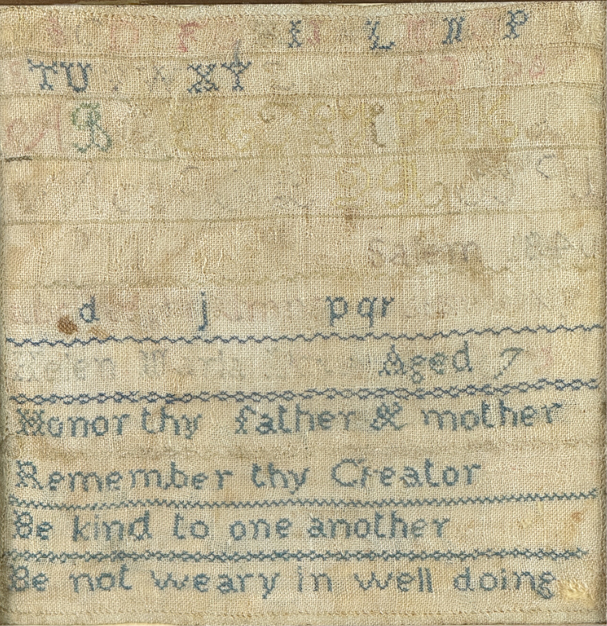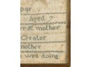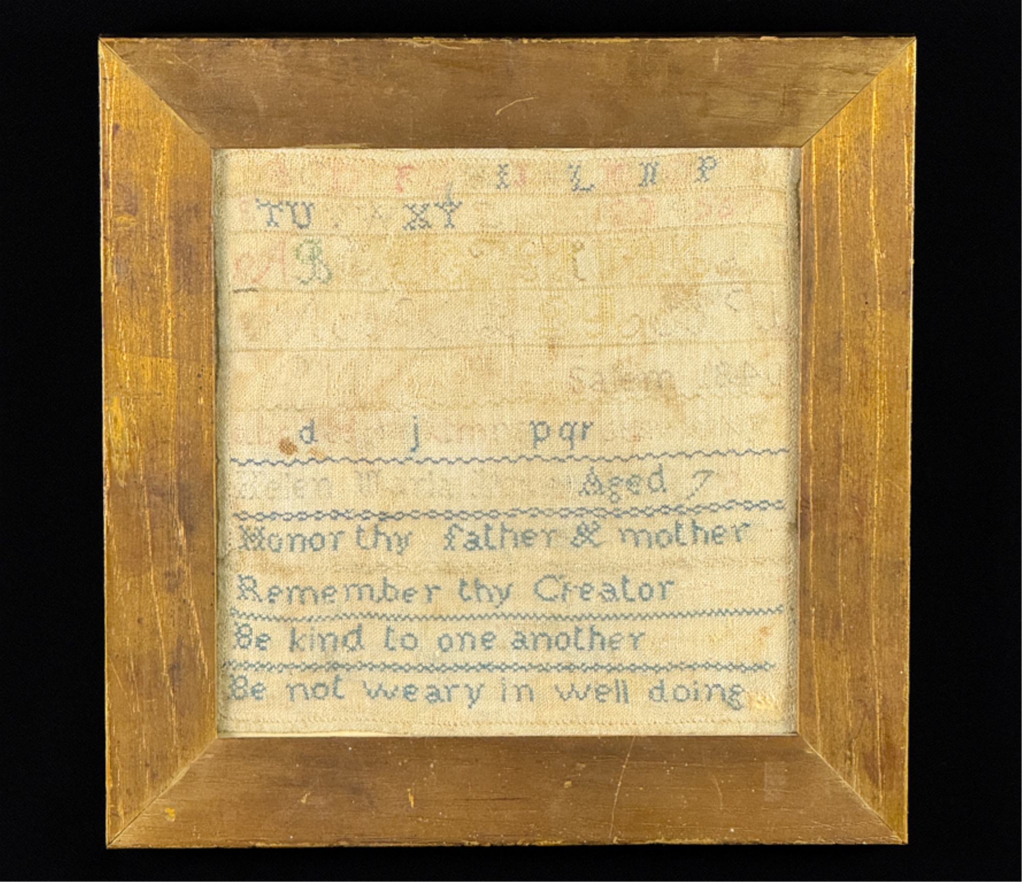 Exhibited at the Wenham Museum collection. Alpha numeric sampler with motto. Helen Marla Dow aged 7. In lemon gold frame. 14 1/2 x 14 1/2 inches. Condition: Fading, threadbare in spots, discoloration, etc. See photos.