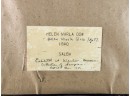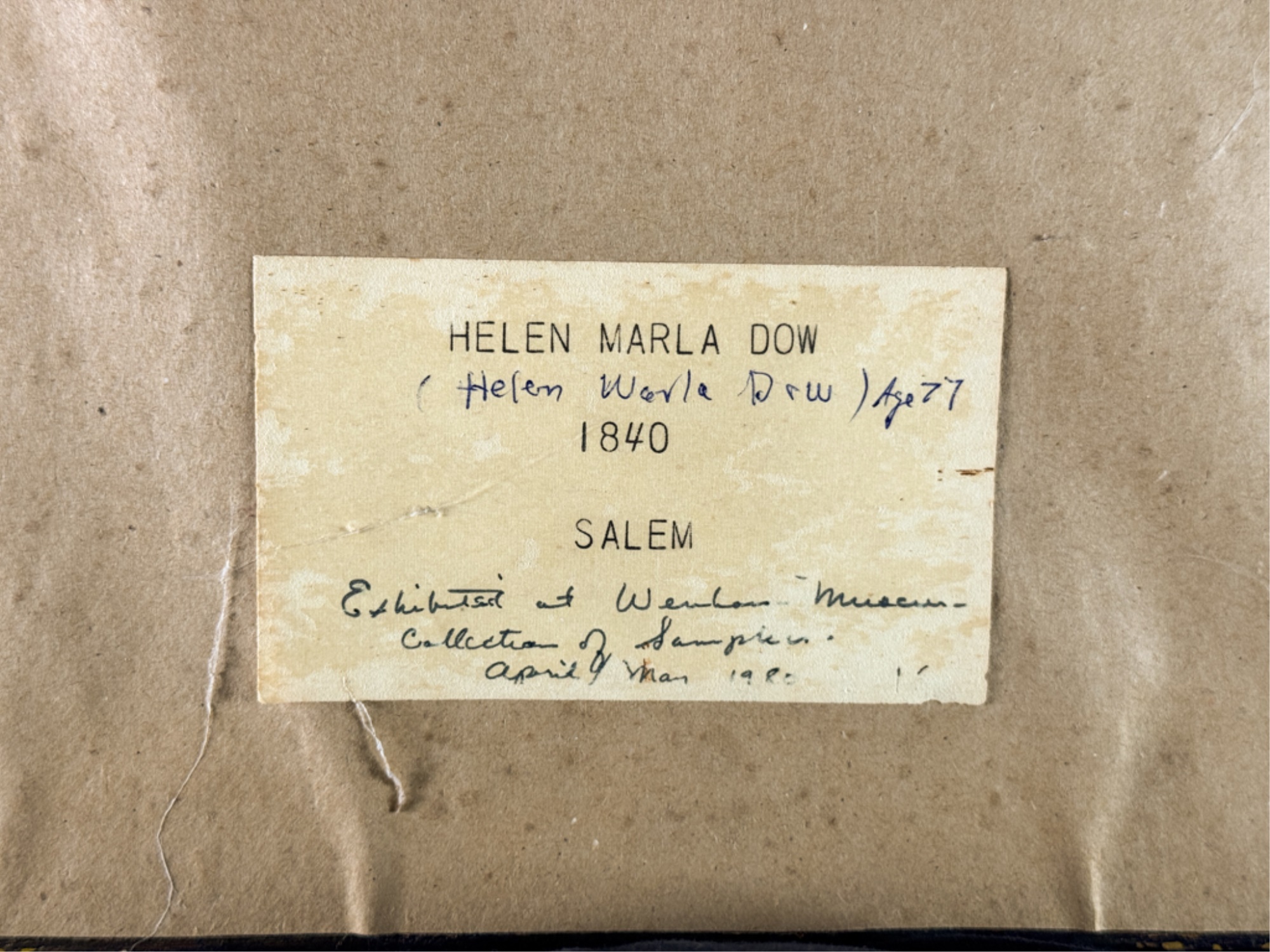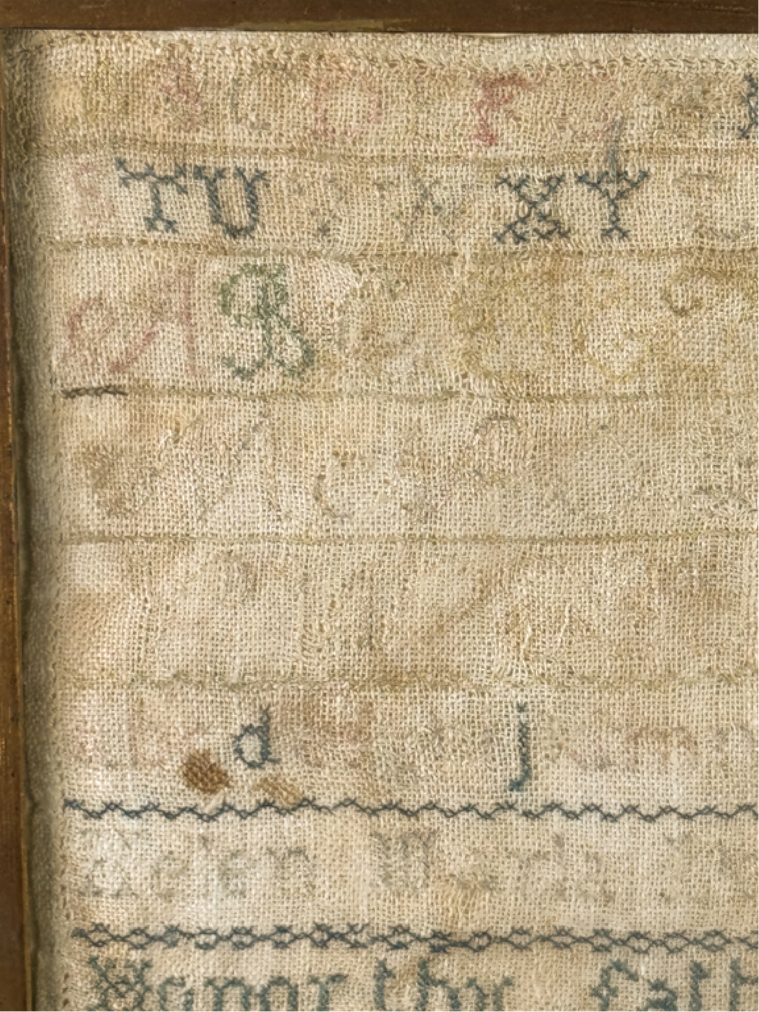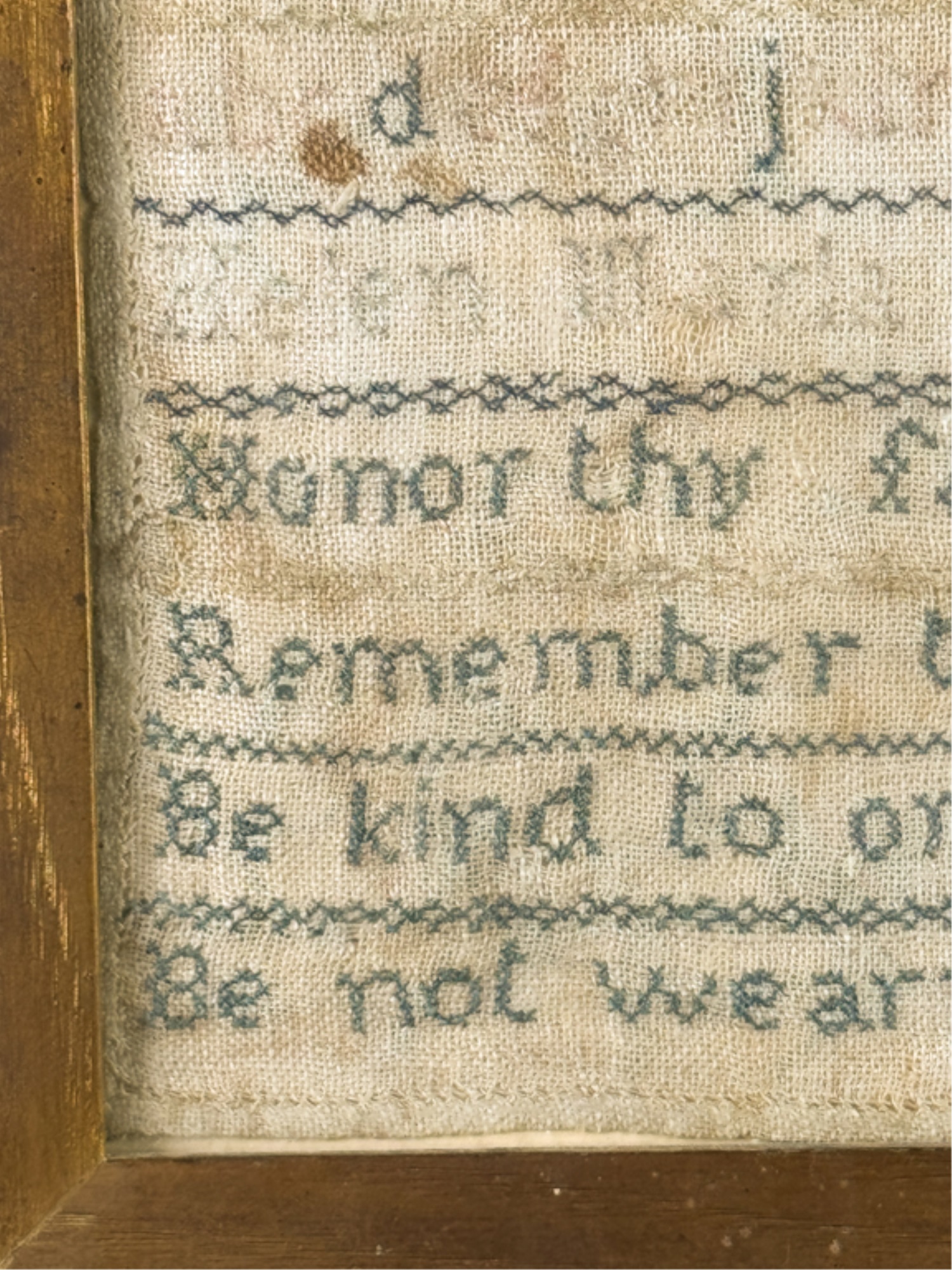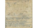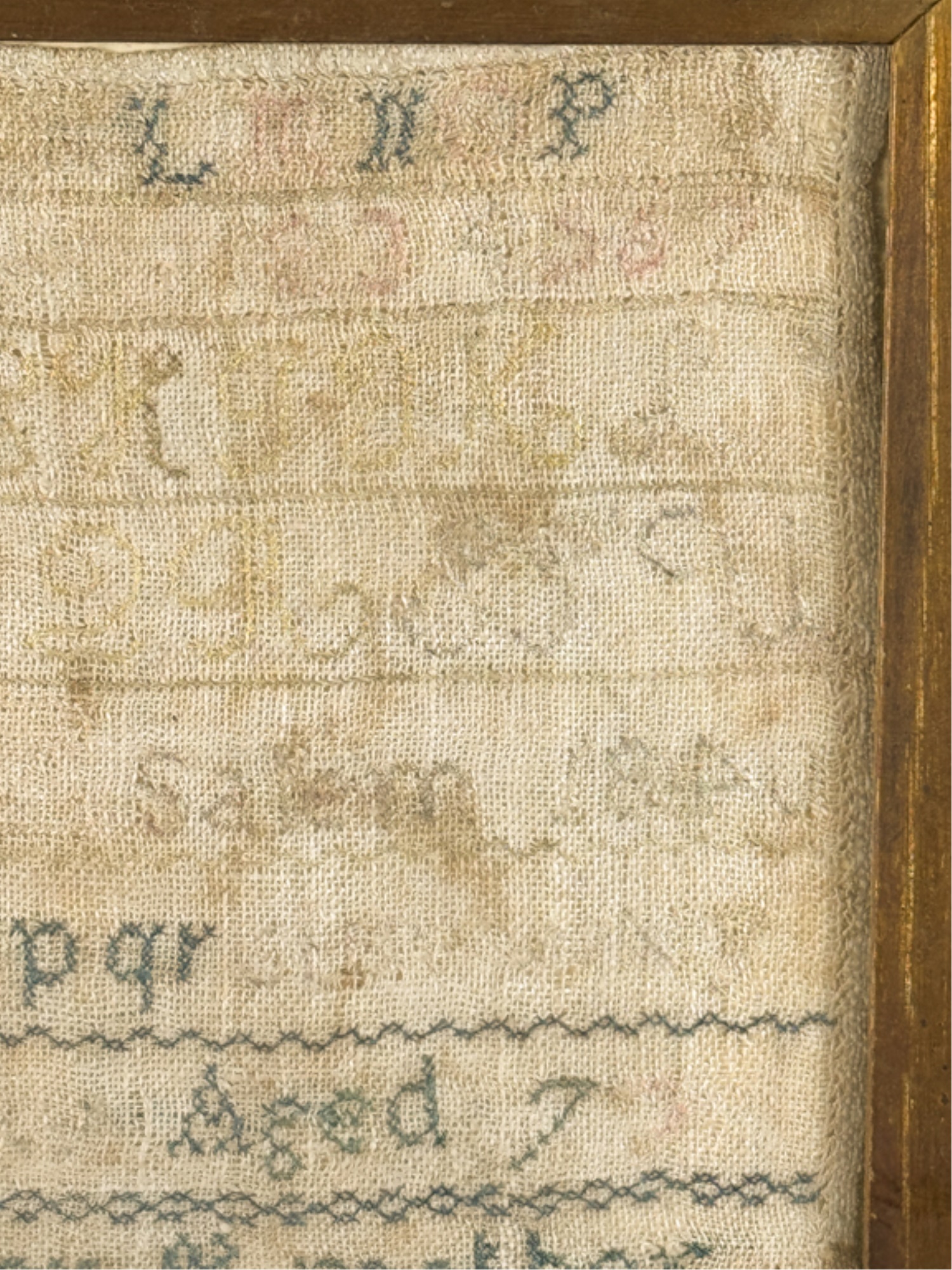 Exhibited at the Wenham Museum collection. Alpha numeric sampler with motto. Helen Marla Dow aged 7. In lemon gold frame. 14 1/2 x 14 1/2 inches. Condition: Fading, threadbare in spots, discoloration, etc. See photos.